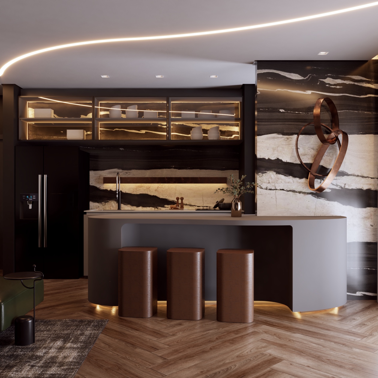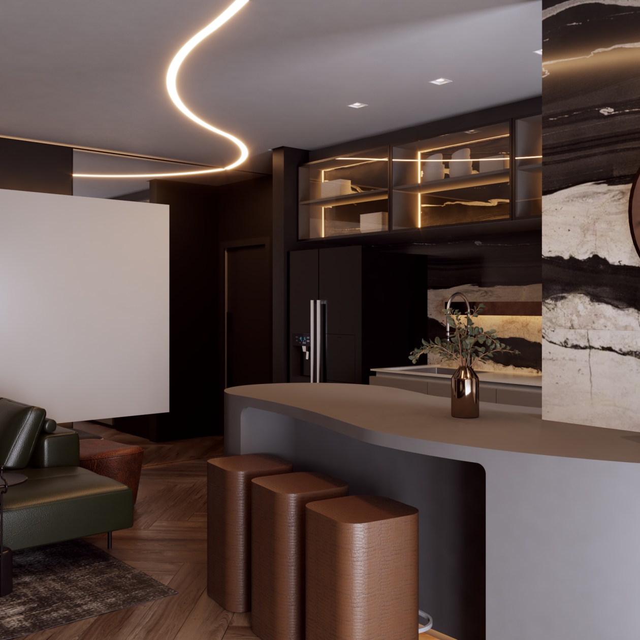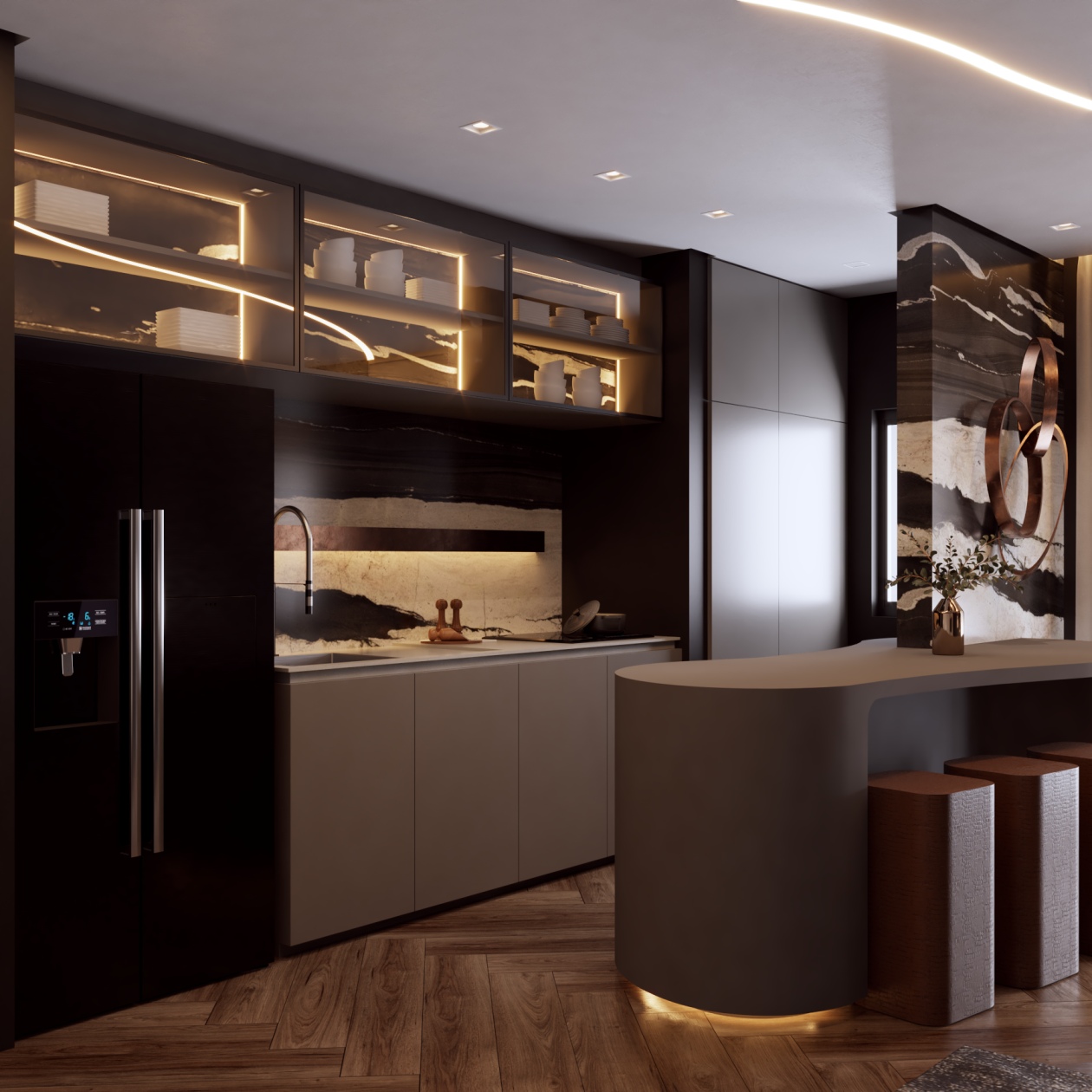 Este apartamento contemporâneo, onde o cobre é a estrela central, conferindo uma aura de sofisticação e modernidade. A paleta é enriquecida com tons amadeirados, presentes em pisos, móveis e