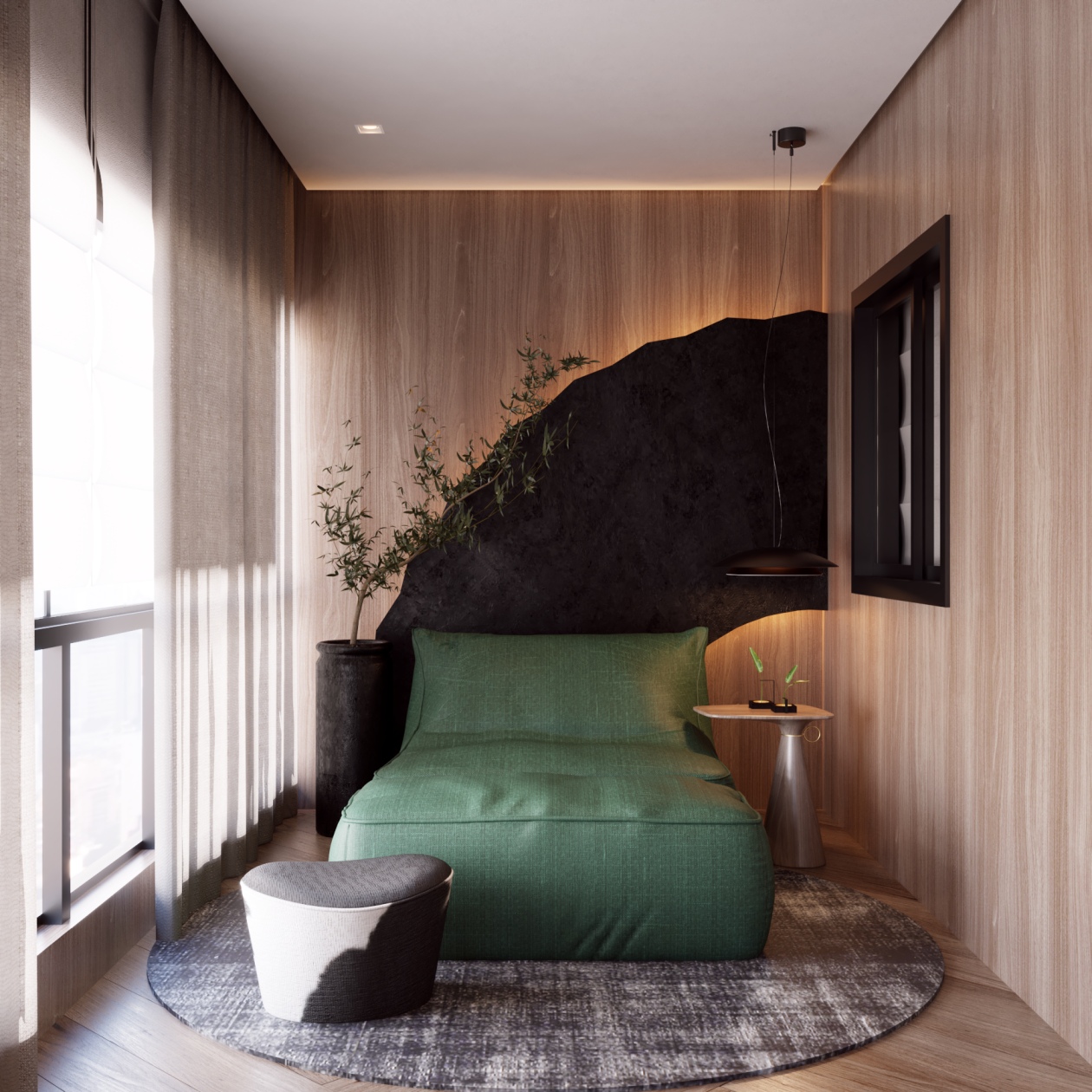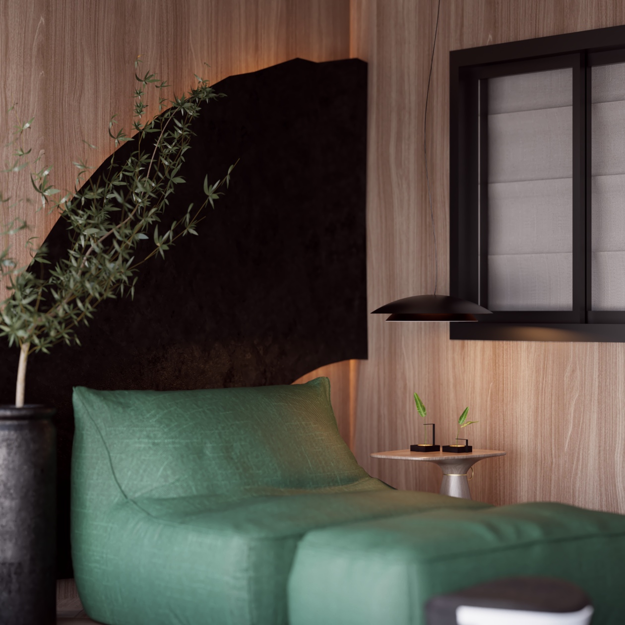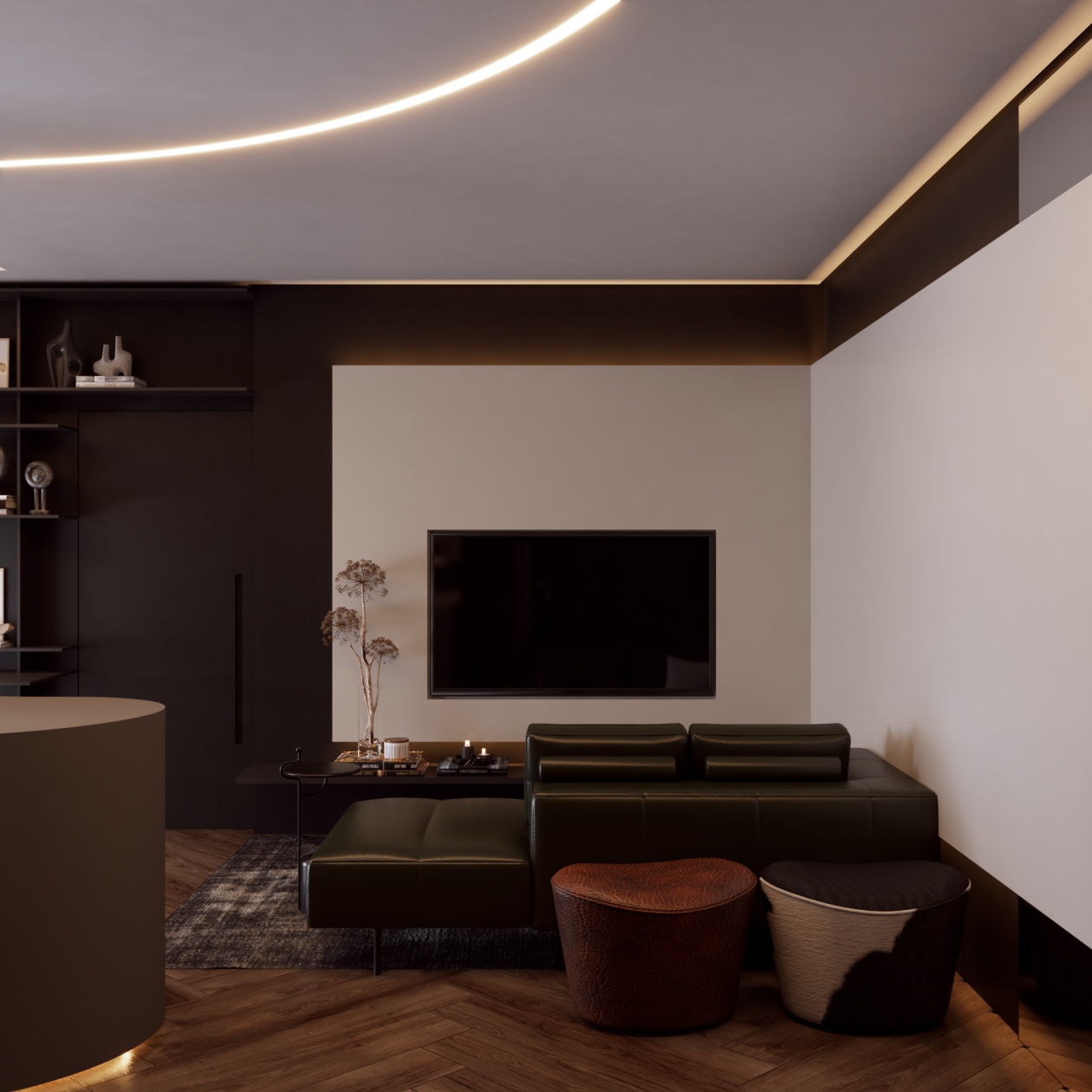 detalhes decorativos, proporcionando uma sensação de calor e equilíbrio ao conjunto. A sala de estar revela um design contemporâneo com mobiliário de linhas limpas, sofá e banquetas luxuosamente estofados em tecidos que harmonizam com a paleta de cores escolhida. Detacam-se também os elementos de decoração que adicionam elegância ao espaço.
