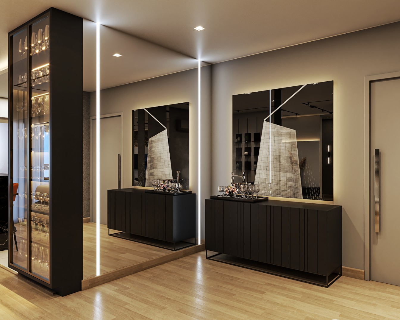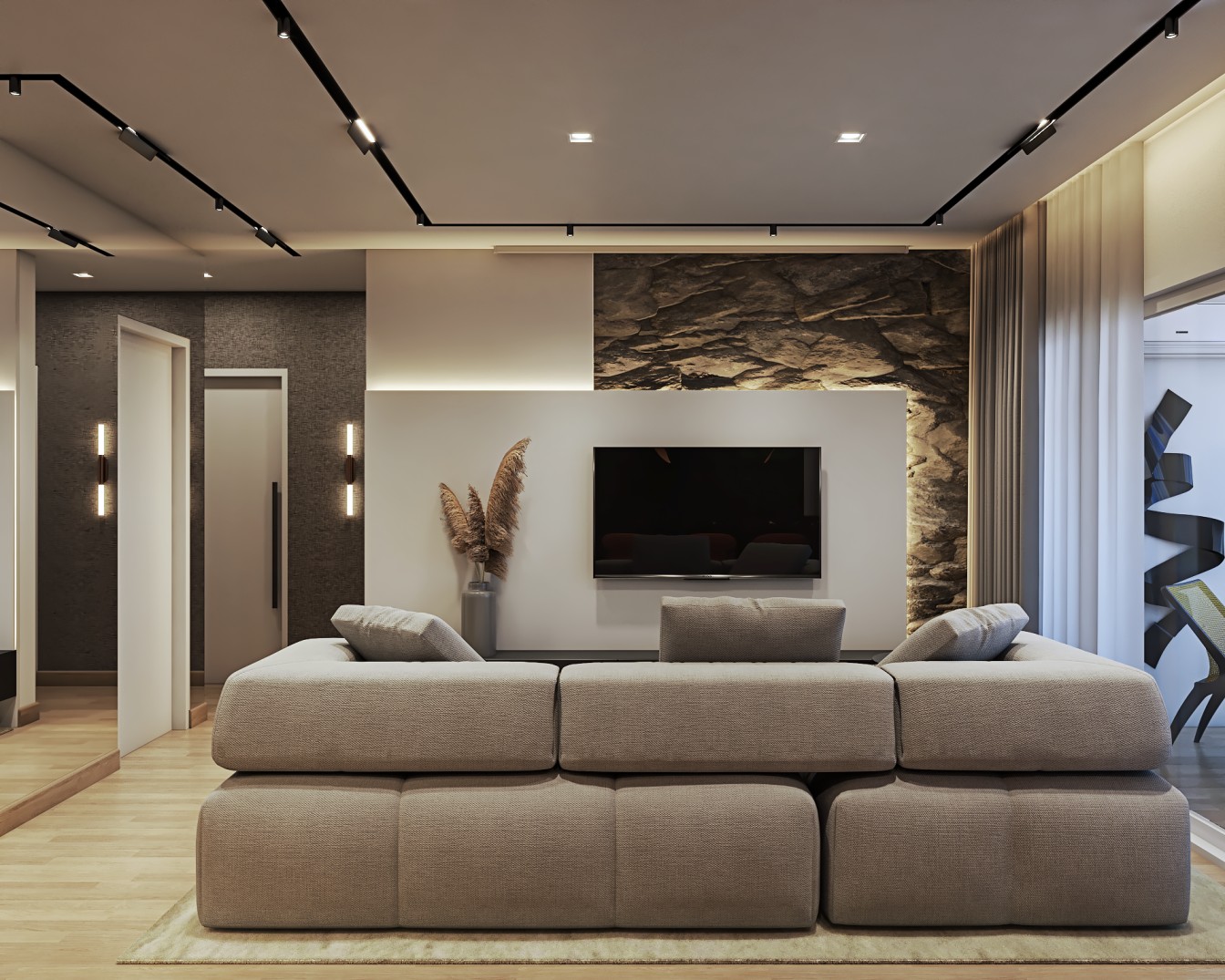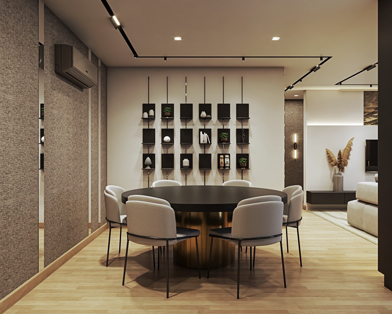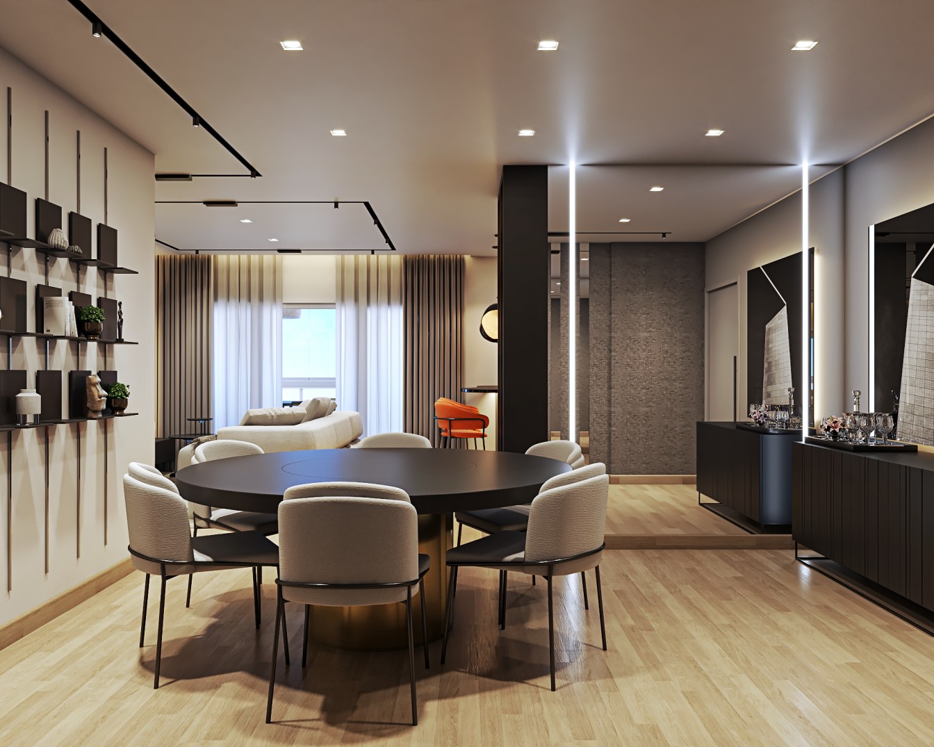 cinza e fendi, proporcionam um pano de fundo elegante para os móveis em tons de bege. A sala de estar é acentuada por elementos em preto, desde a elegante estante até as obras abstratss que adornam as paredes, adicionando uma dose de modernidade ao