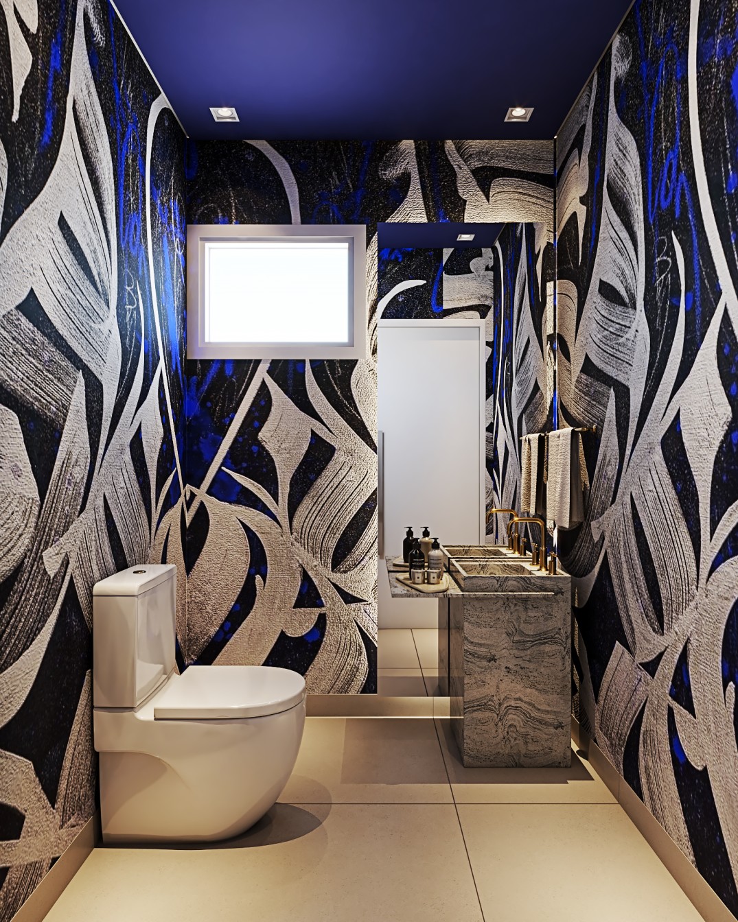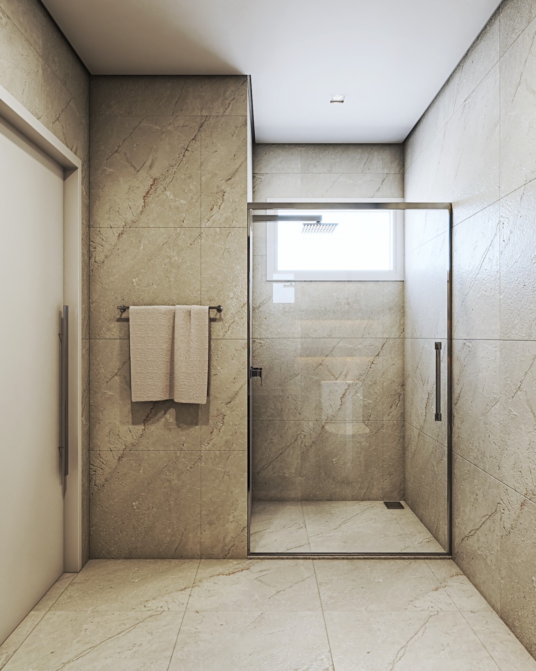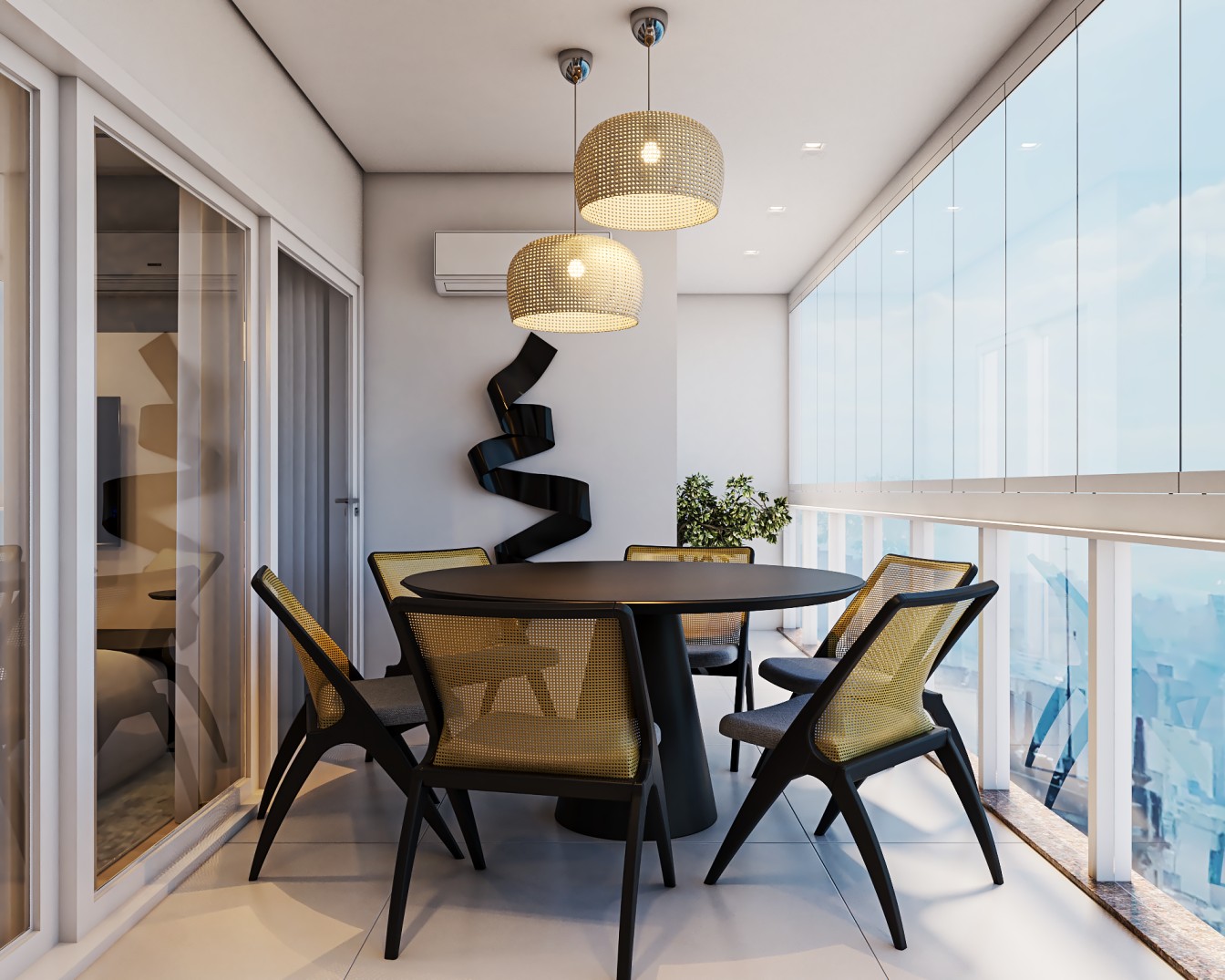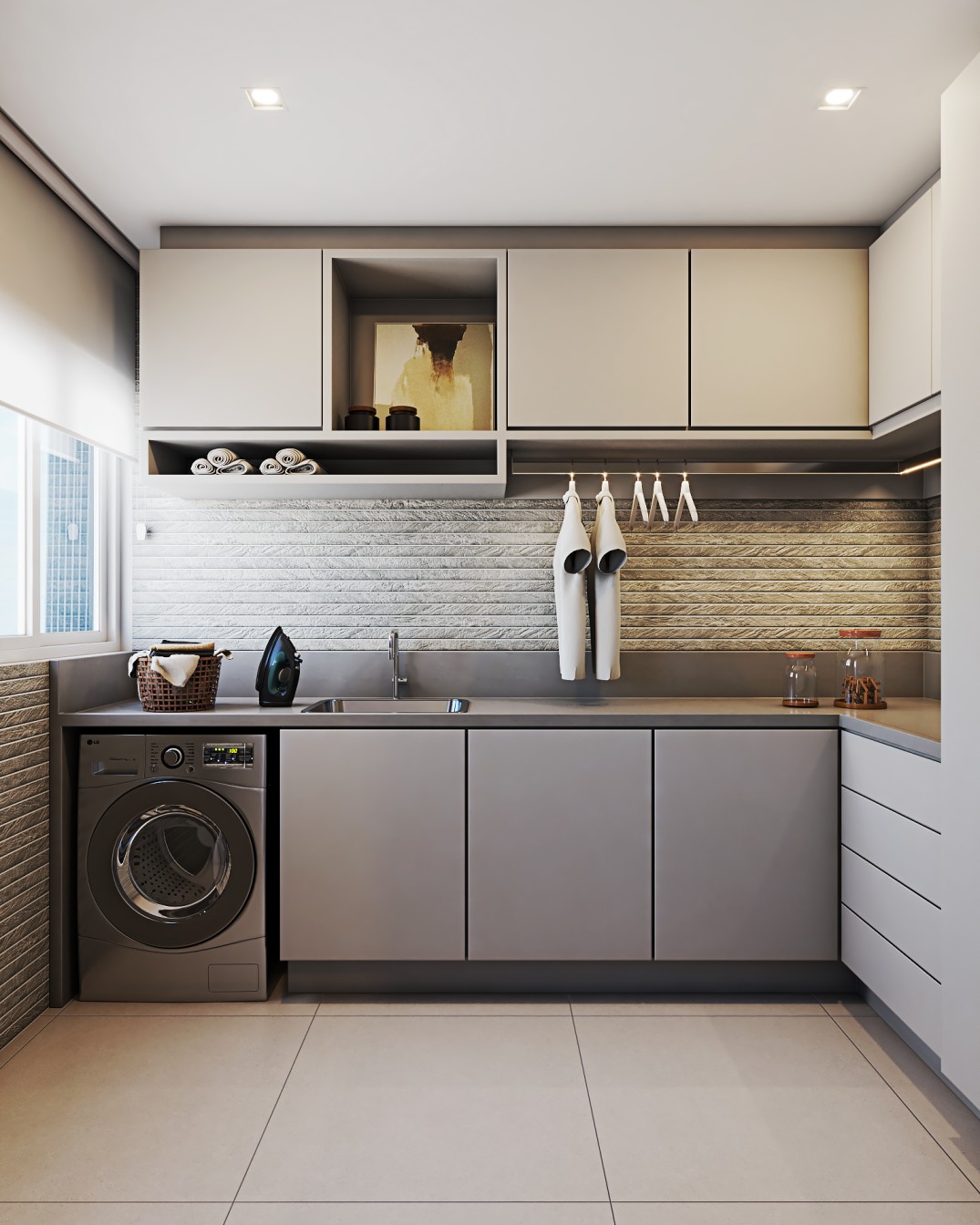 cinza e fendi, proporcionam um pano de fundo elegante para os móveis em tons de bege. A sala de estar é acentuada por elementos em preto, desde a elegante estante até as obras abstratss que adornam as paredes, adicionando uma dose de modernidade ao