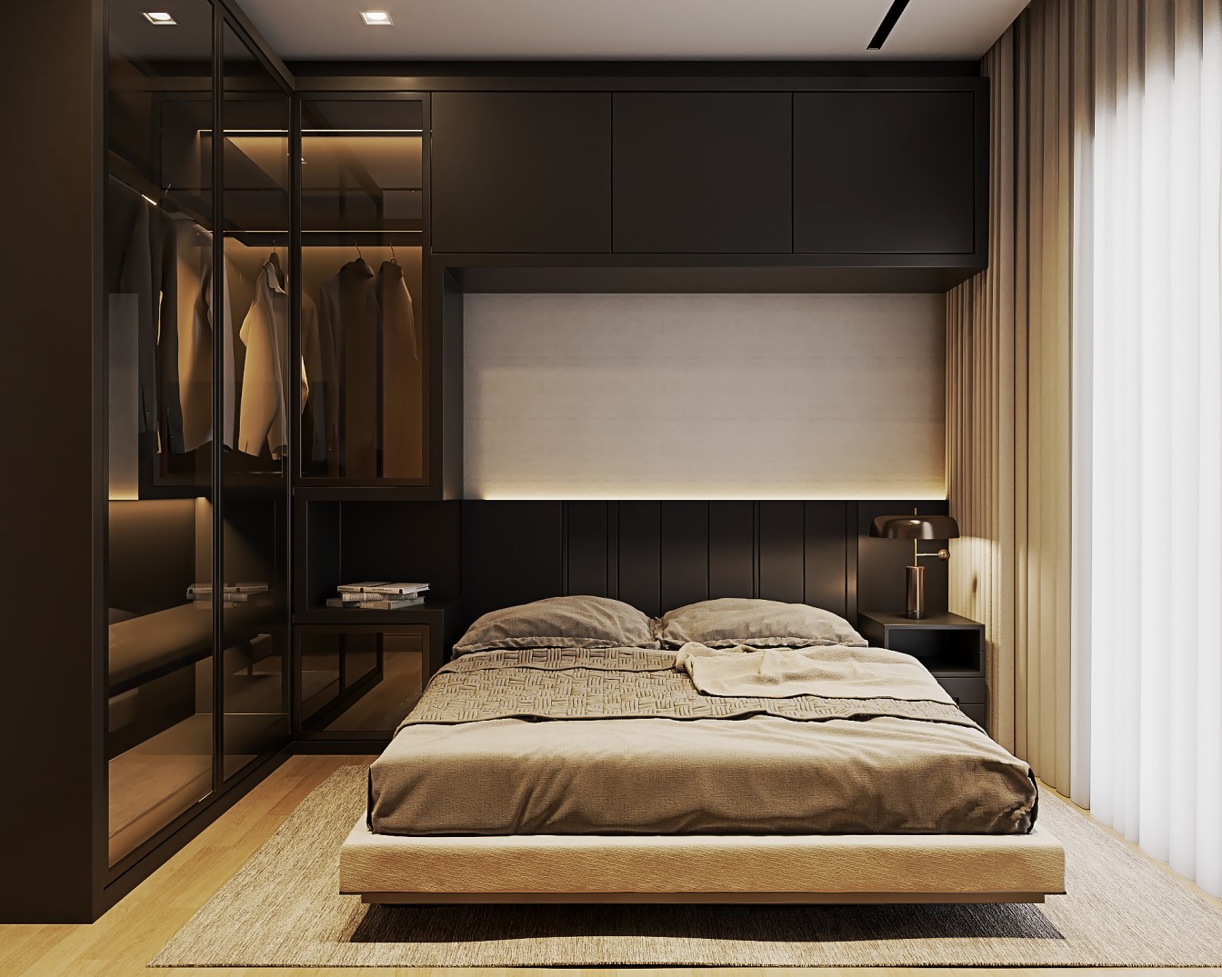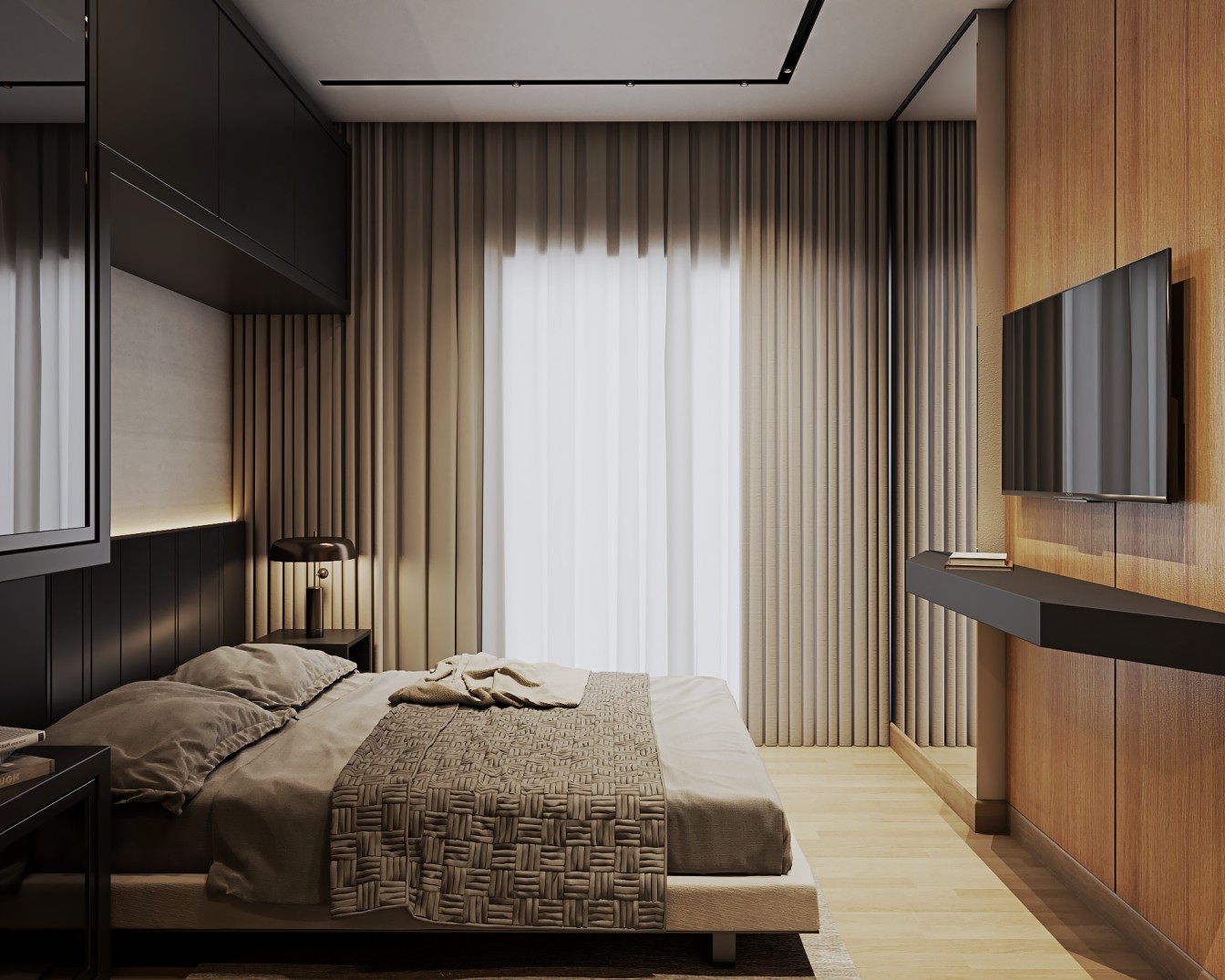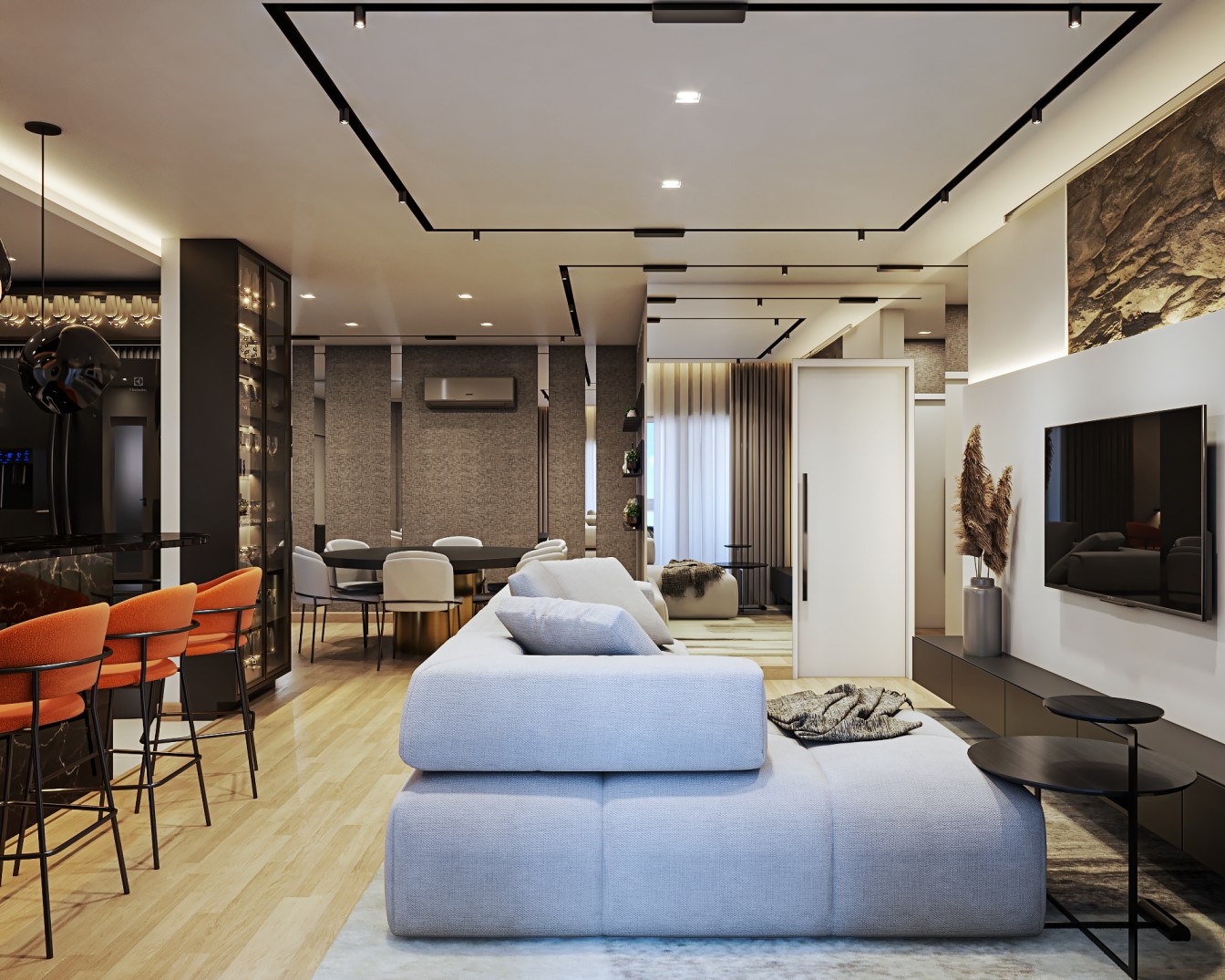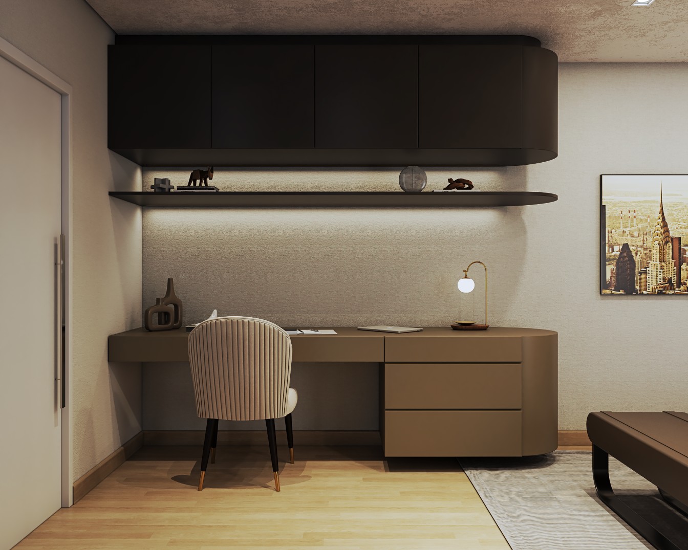 Um apartamento contemporâneo projetado com uma estética masculina, onde os tons terrosos e o preto se entrelaçam para criar um ambiente sofisticado e acolhedor. As paredes, pintadas em tons de