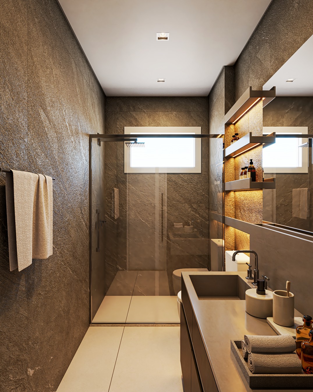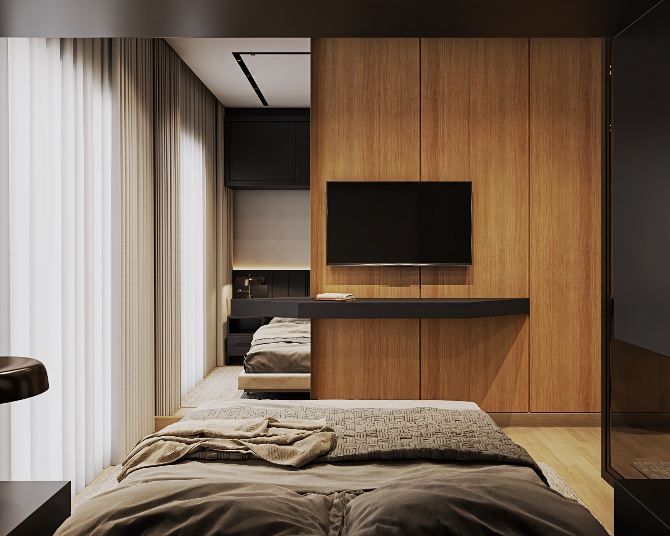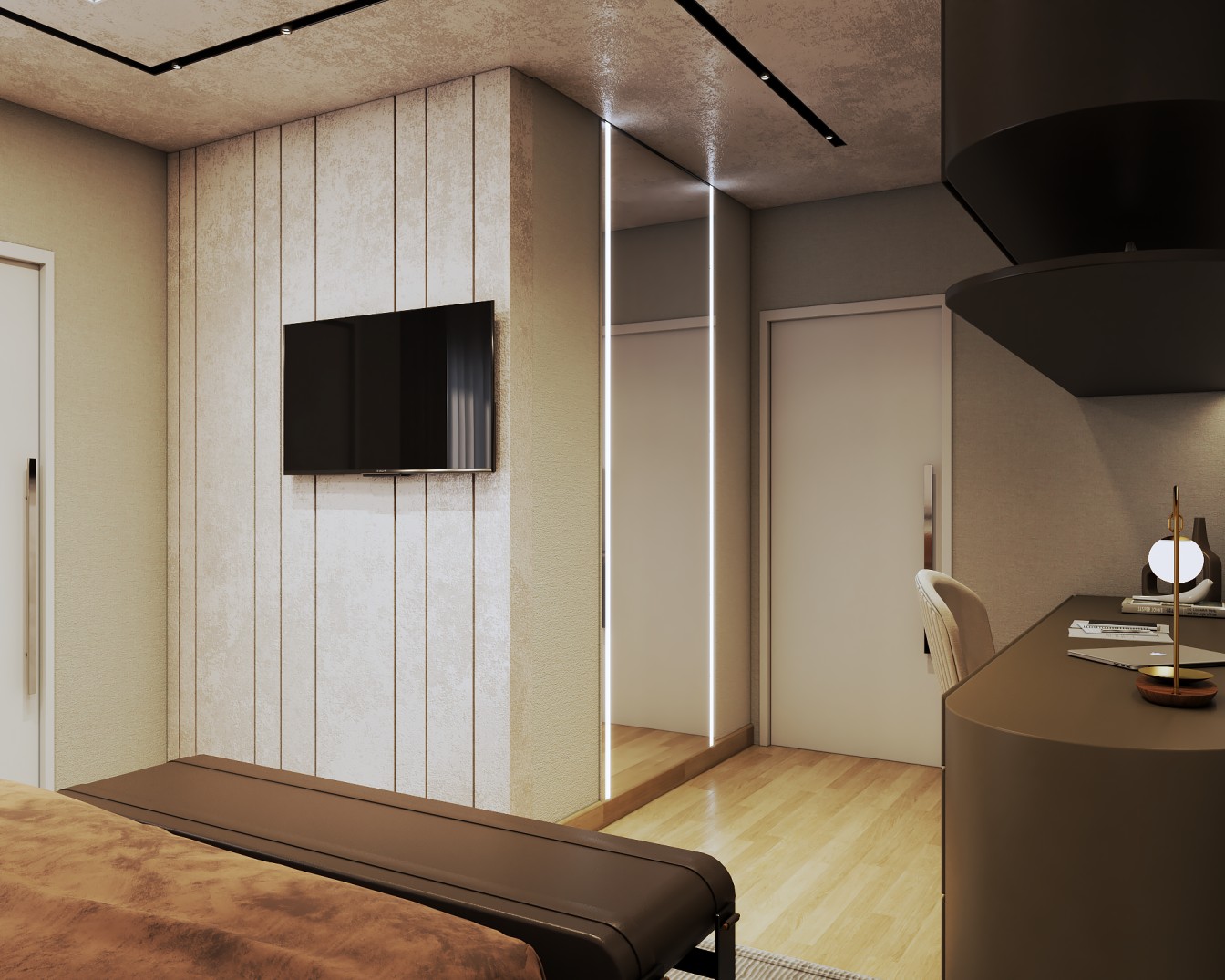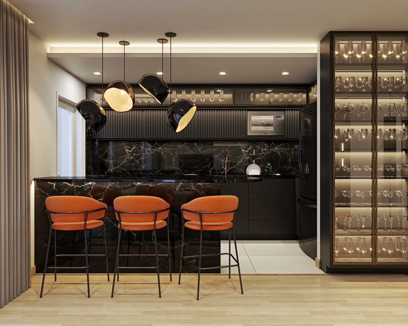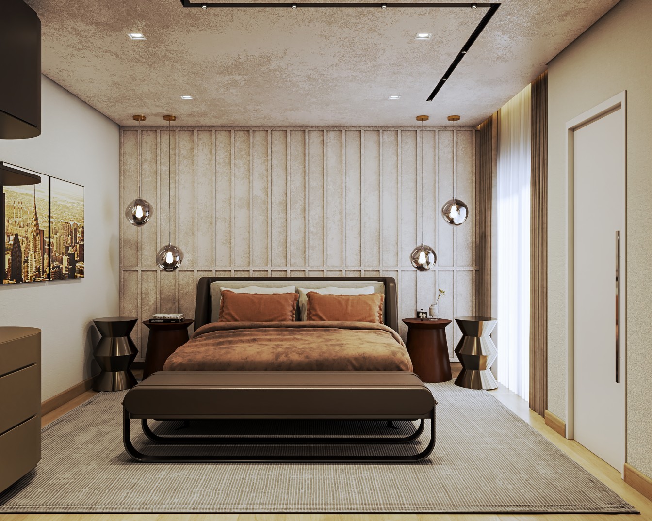 Um apartamento contemporâneo projetado com uma estética masculina, onde os tons terrosos e o preto se entrelaçam para criar um ambiente sofisticado e acolhedor. As paredes, pintadas em tons de