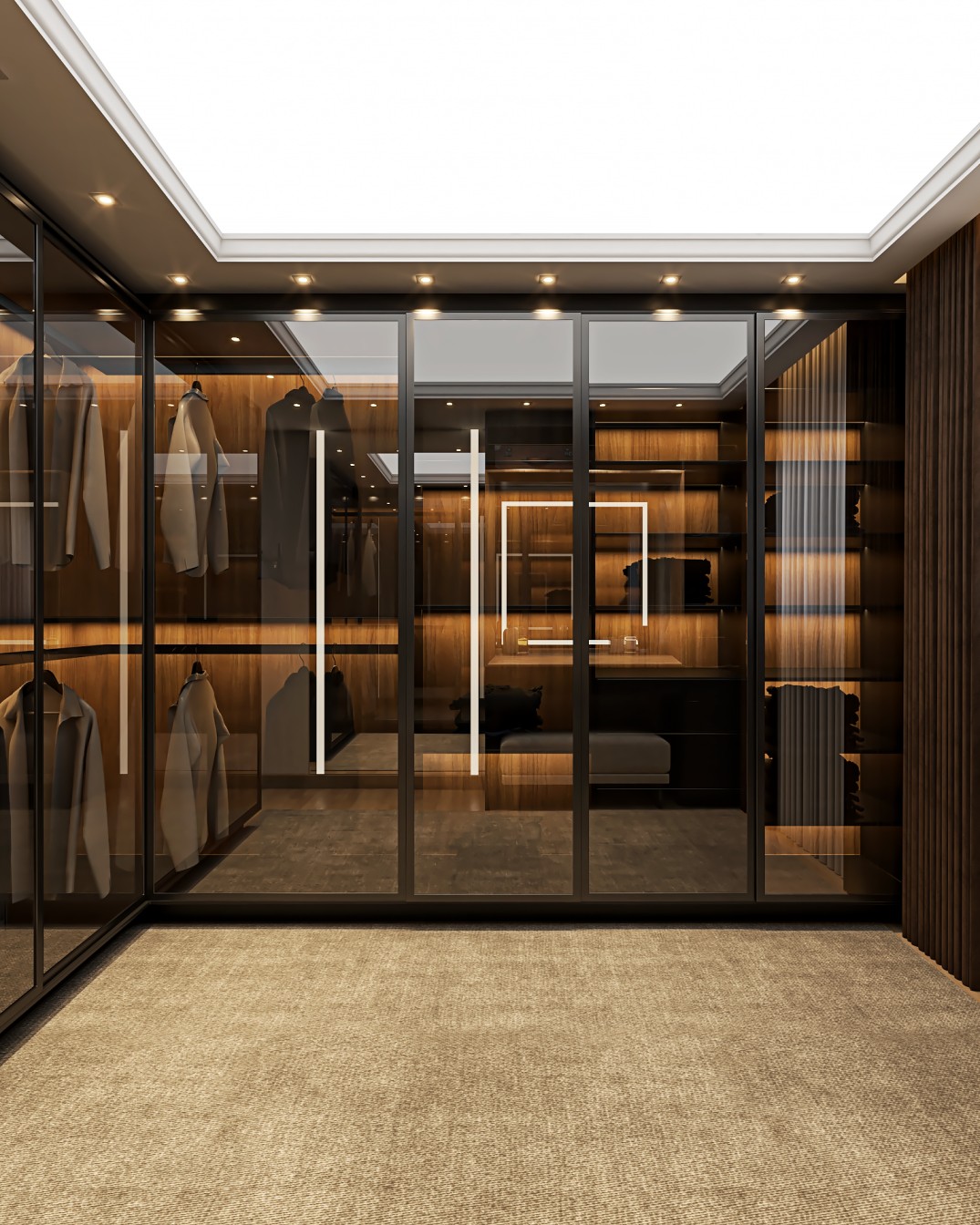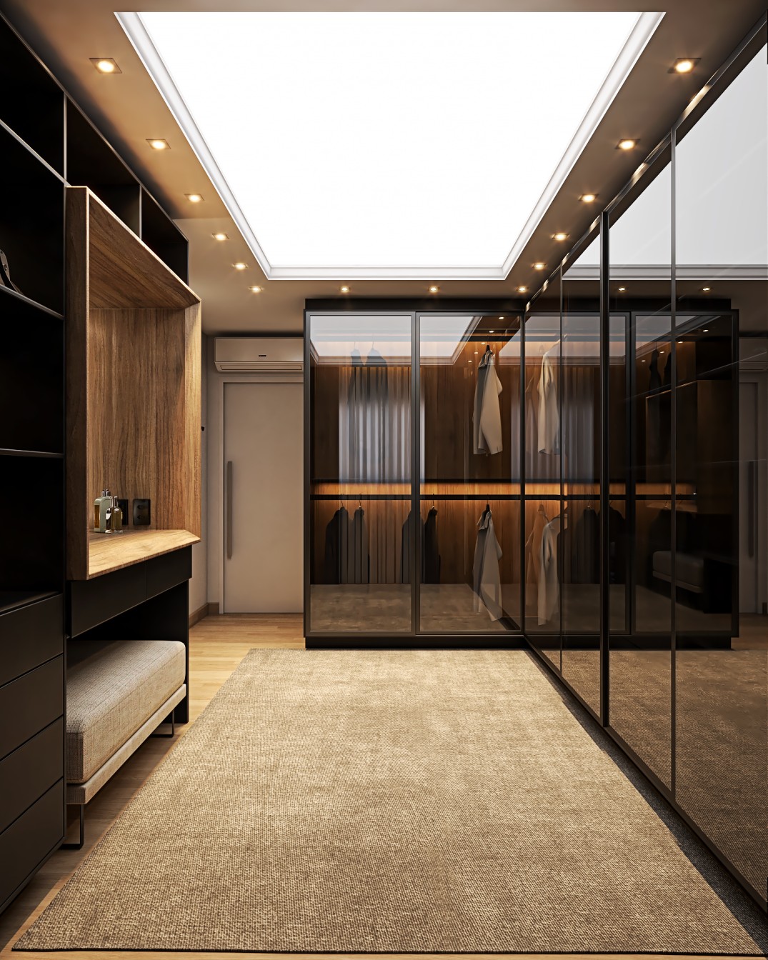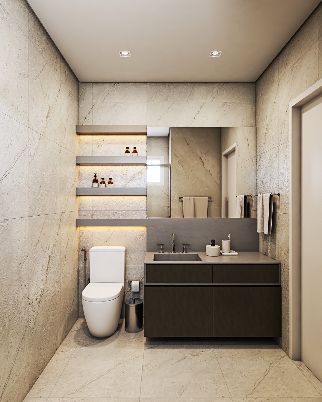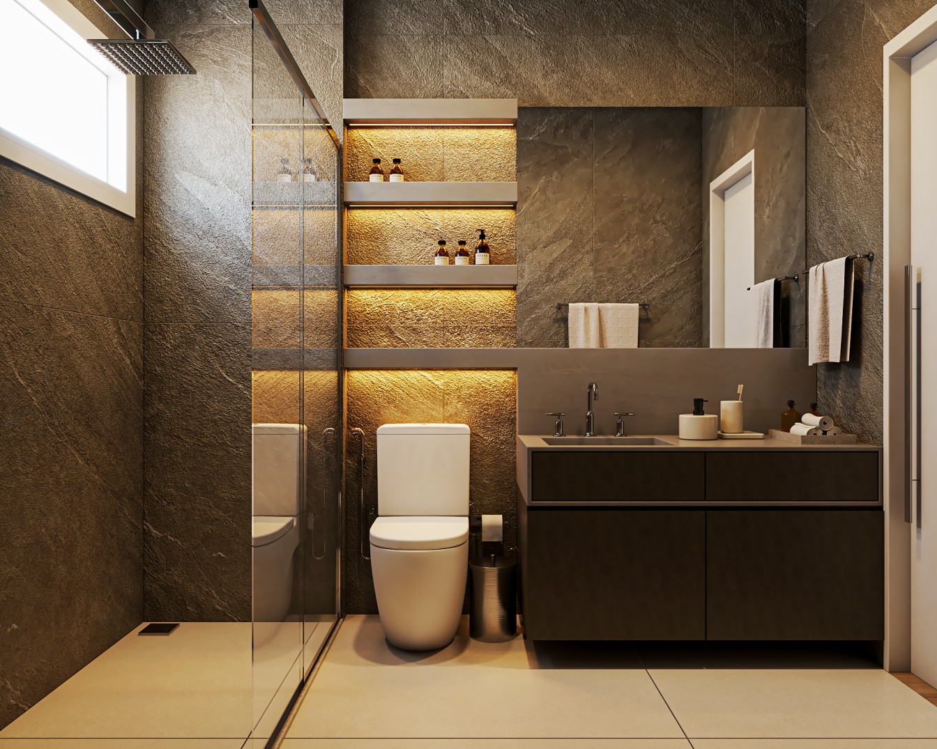 Um apartamento contemporâneo projetado com uma estética masculina, onde os tons terrosos e o preto se entrelaçam para criar um ambiente sofisticado e acolhedor. As paredes, pintadas em tons de