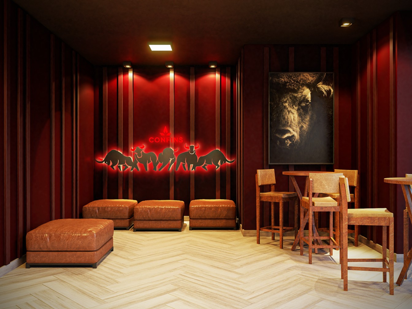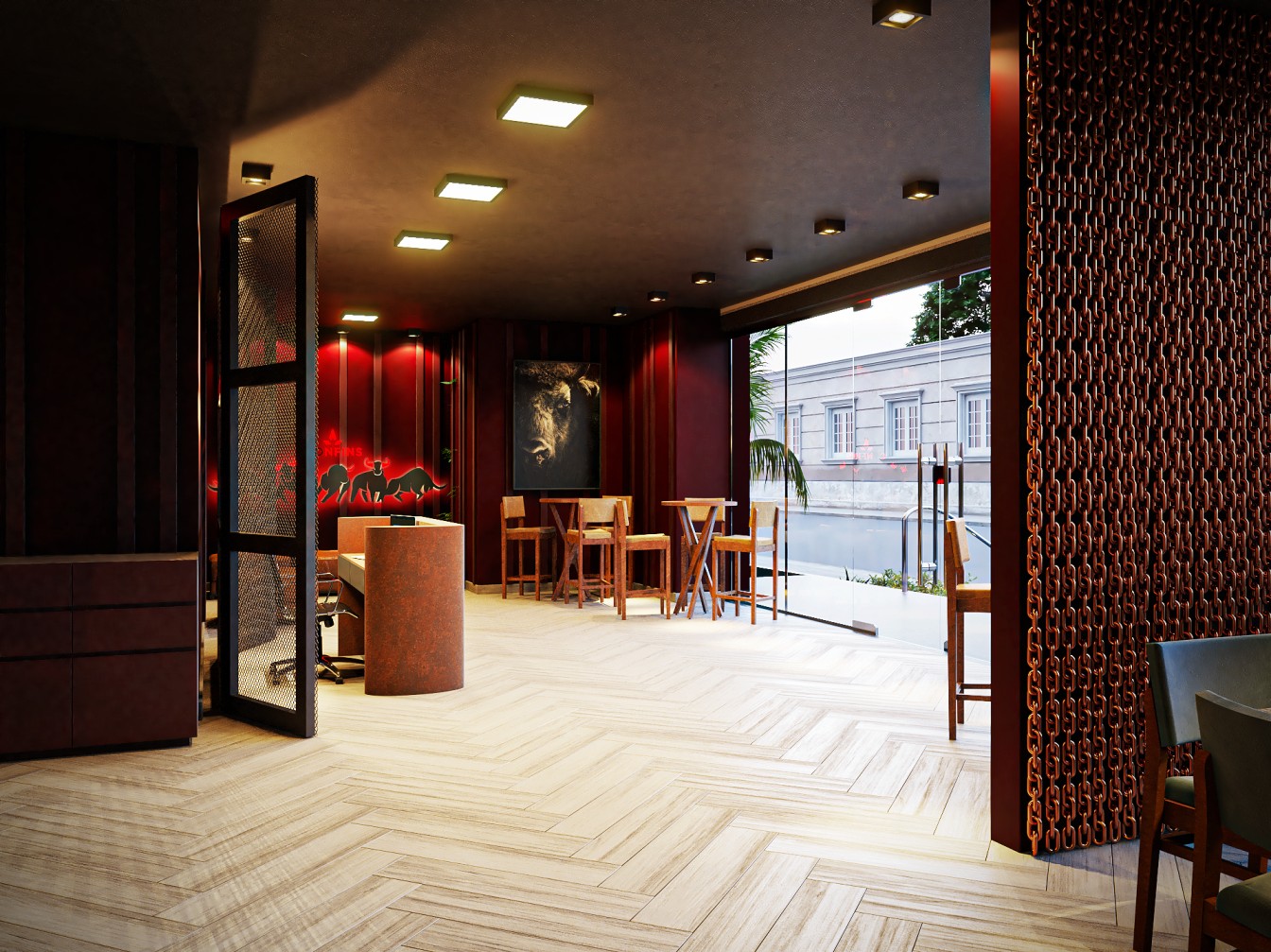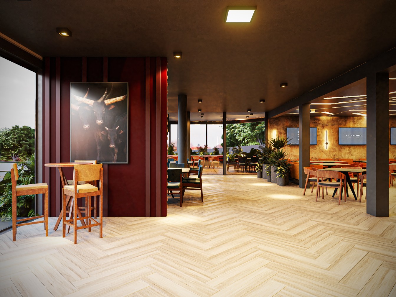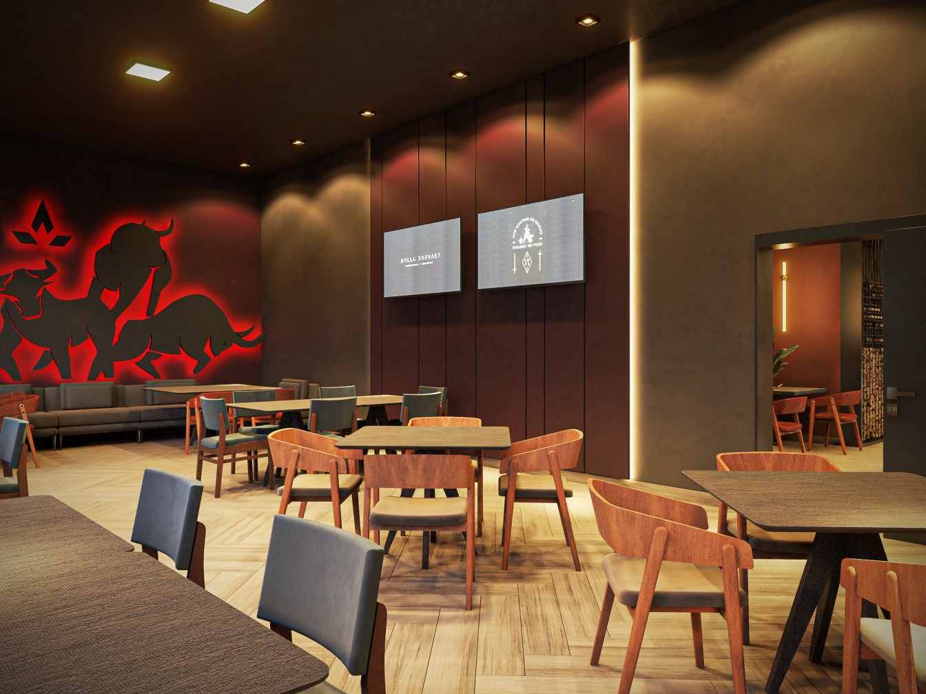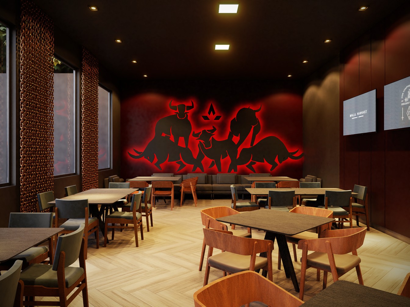 Neste restaurante a temática da carne é sublinhada pelas imponentes cabeças de touros nas paredes, adicionando uma presença robusta e evocando a tradição dos autênticos steakhouses. A iluminação suave realça a textura das mesas de madeira escura, criando um ambiente aconchegante e íntimo, onde os amantes de carne podem desfrutar não apenas de uma refeição saborosa, mas também de uma experiência visualmente impactante neste templo da culinária.