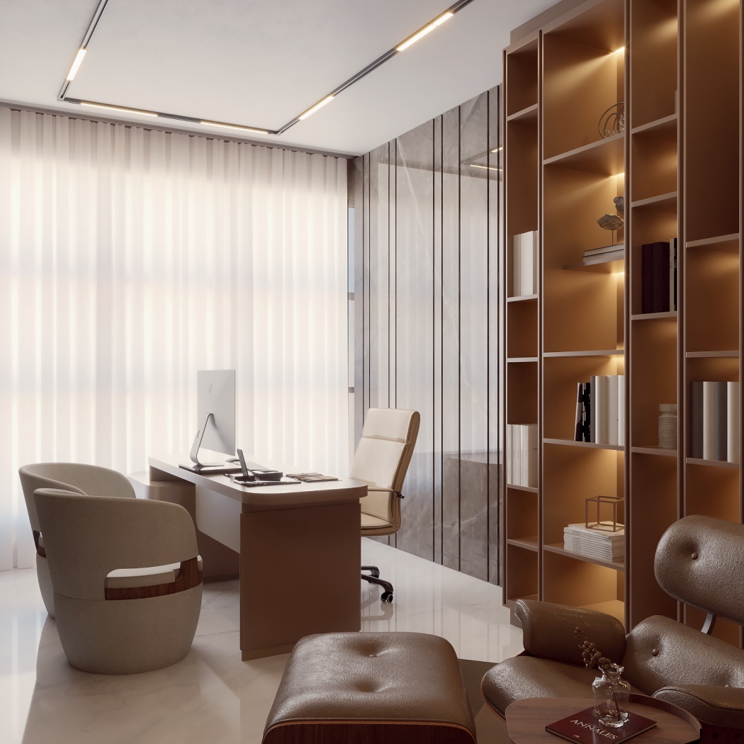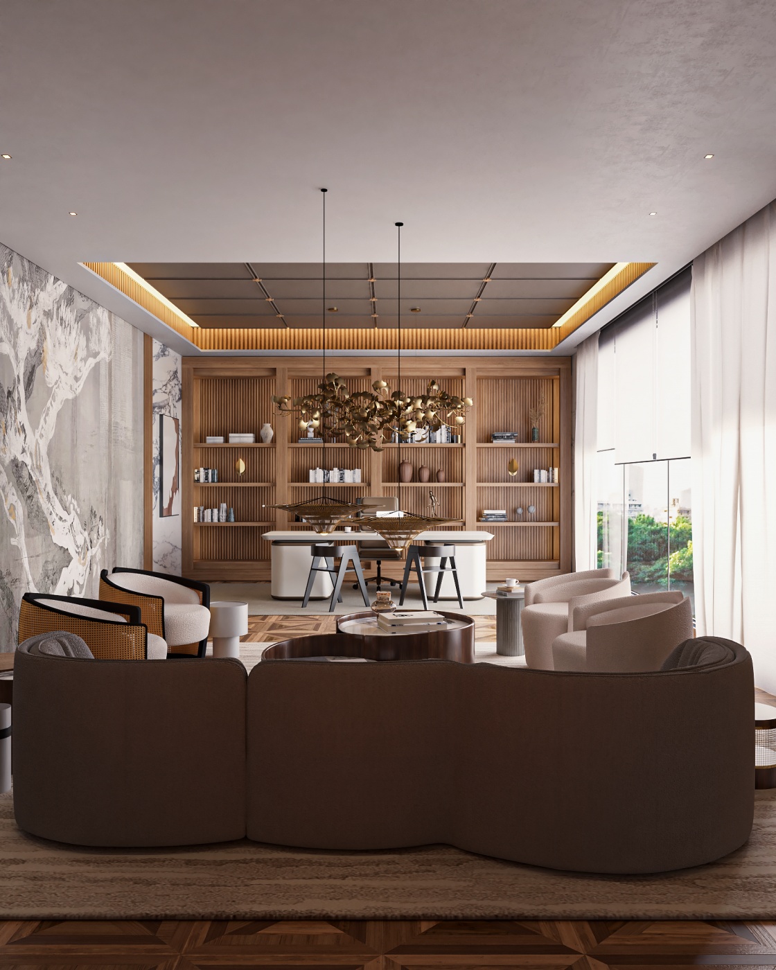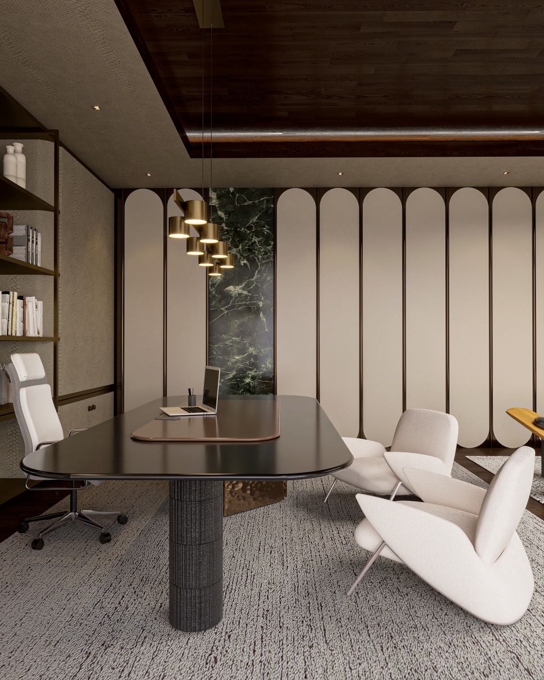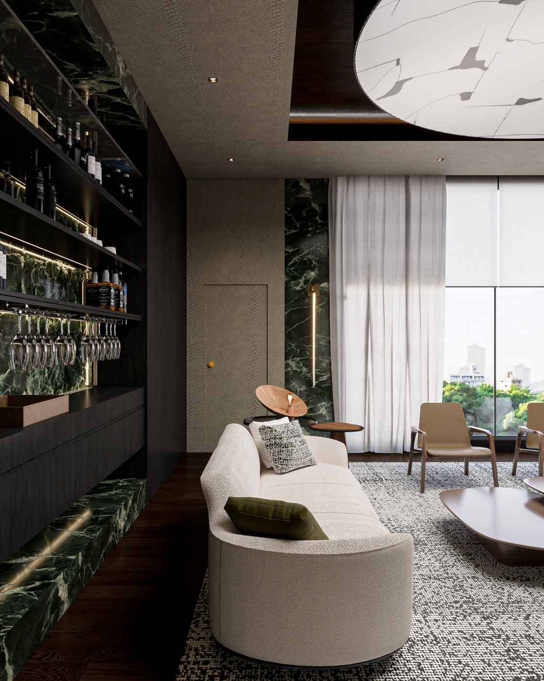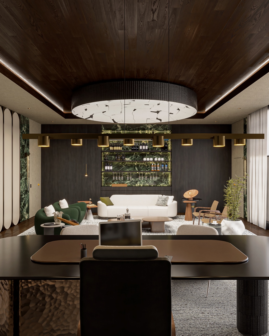 Esta elegante sala de reunião, onde o refinamento é a essência do ambiente. O bar em mármore brilha com sofisticação, proporcionando um ponto focal impressionante. Detalhes em tons marrons, presentes em móveis e elementos decorativos, acrescentam uma nota de aconchego e seriedade ao espaço. Poltronas de couro, dispostas estrategicamente, conferem um toque de luxo e conforto, criando um ambiente propício para discussões e decisões importantes.