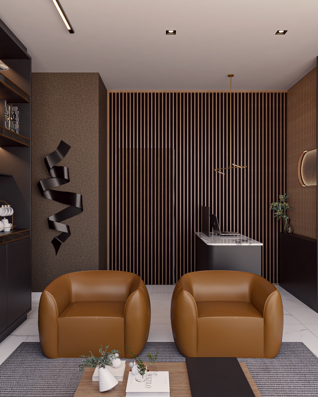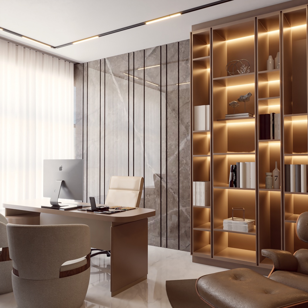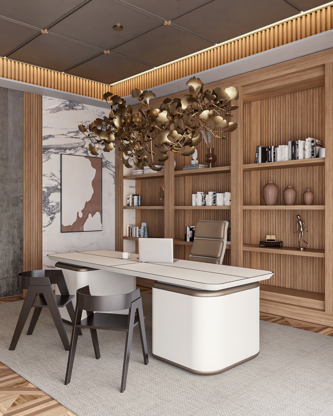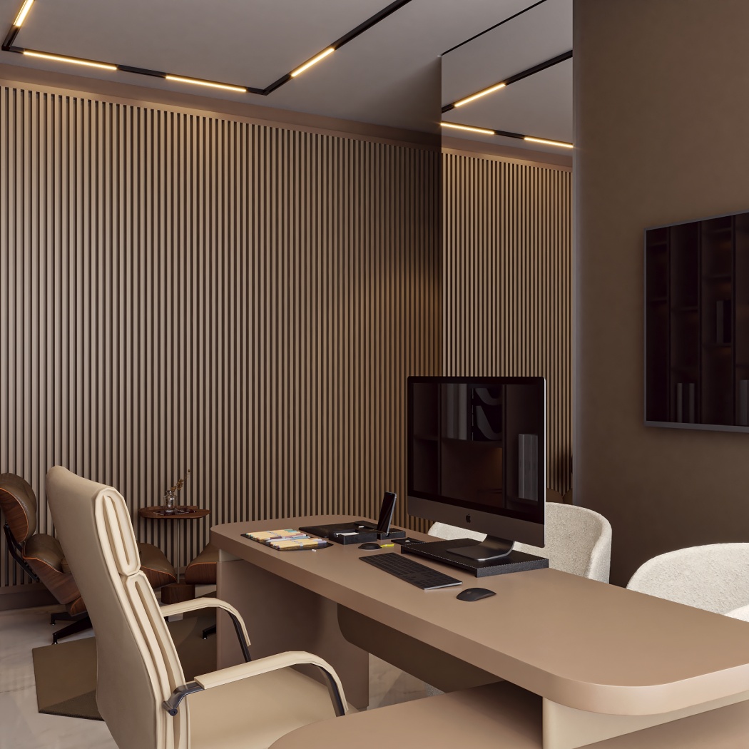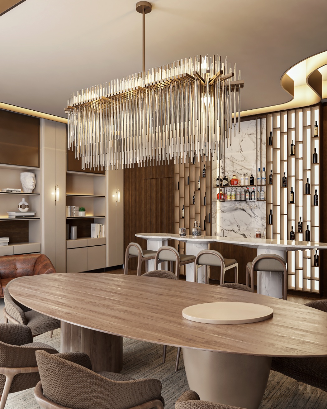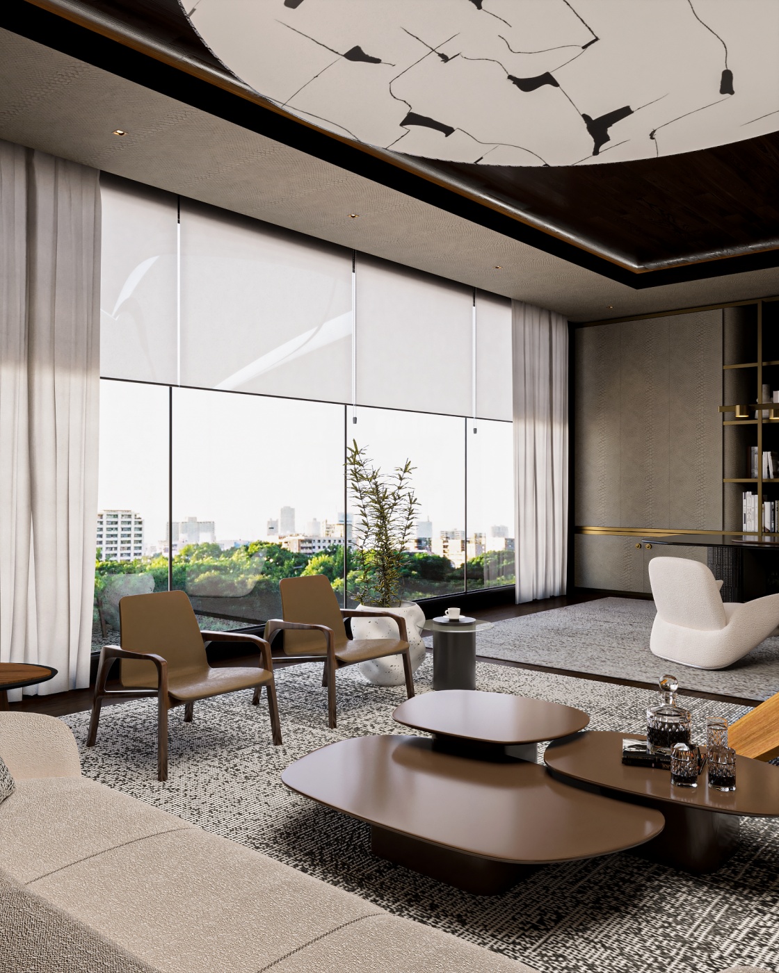 Esta elegante sala de reunião, onde o refinamento é a essência do ambiente. O bar em mármore brilha com sofisticação, proporcionando um ponto focal impressionante. Detalhes em tons marrons, presentes em móveis e elementos decorativos, acrescentam uma nota de aconchego e seriedade ao espaço. Poltronas de couro, dispostas estrategicamente, conferem um toque de luxo e conforto, criando um ambiente propício para discussões e decisões importantes.