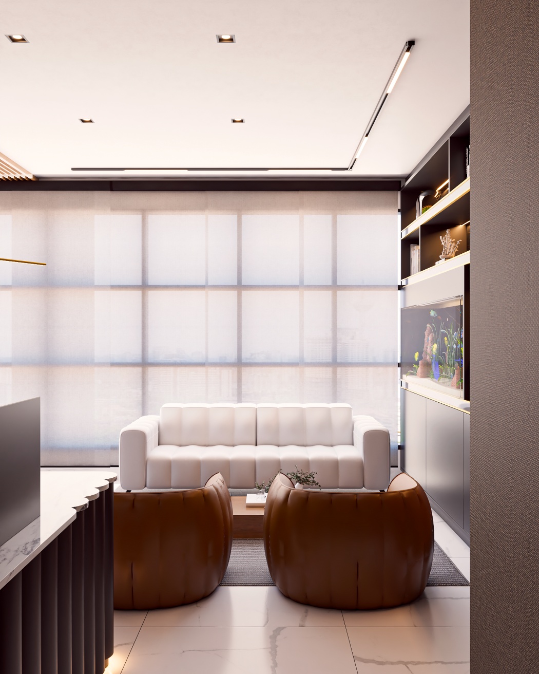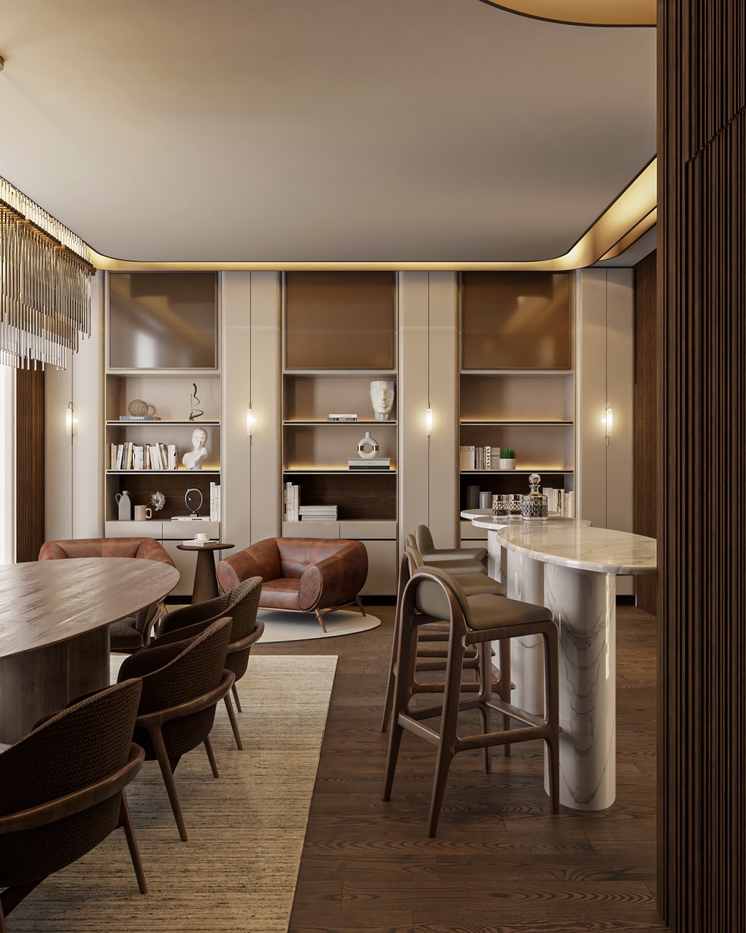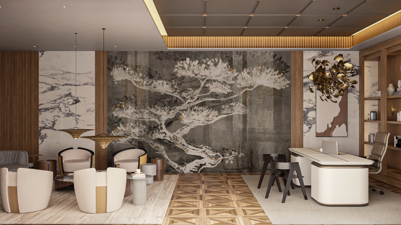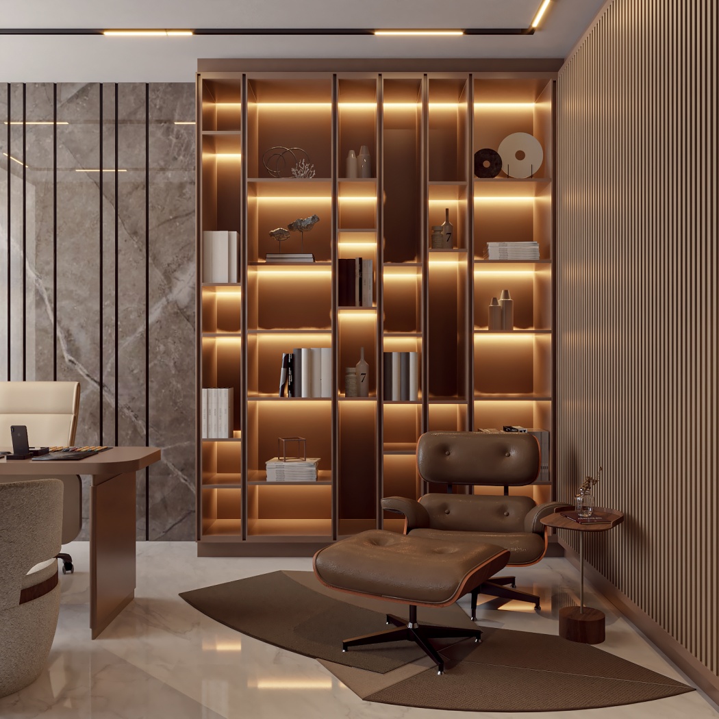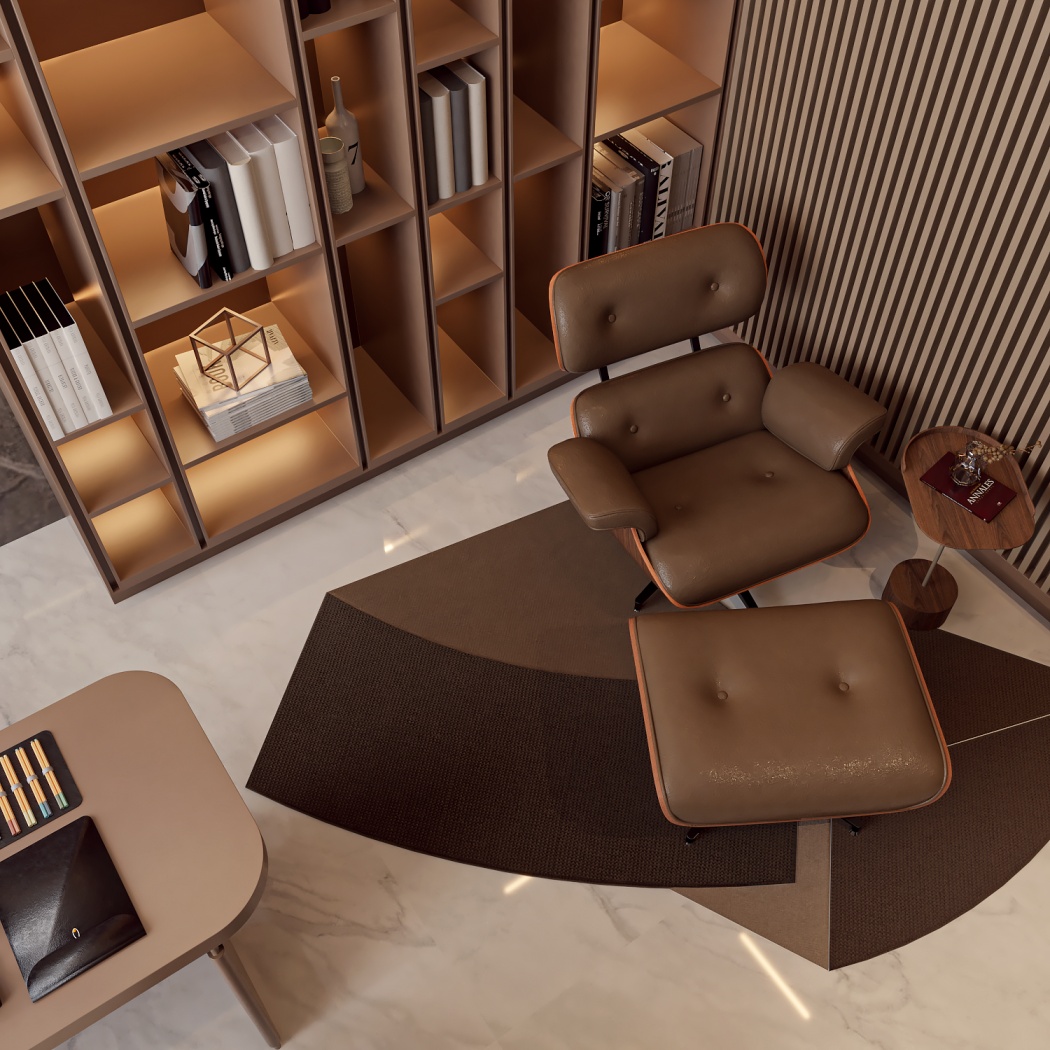 Esta elegante sala de reunião, onde o refinamento é a essência do ambiente. O bar em mármore brilha com sofisticação, proporcionando um ponto focal impressionante. Detalhes em tons marrons, presentes em móveis e elementos decorativos, acrescentam uma nota de aconchego e seriedade ao espaço. Poltronas de couro, dispostas estrategicamente, conferem um toque de luxo e conforto, criando um ambiente propício para discussões e decisões importantes.