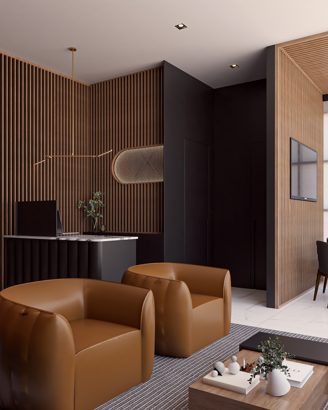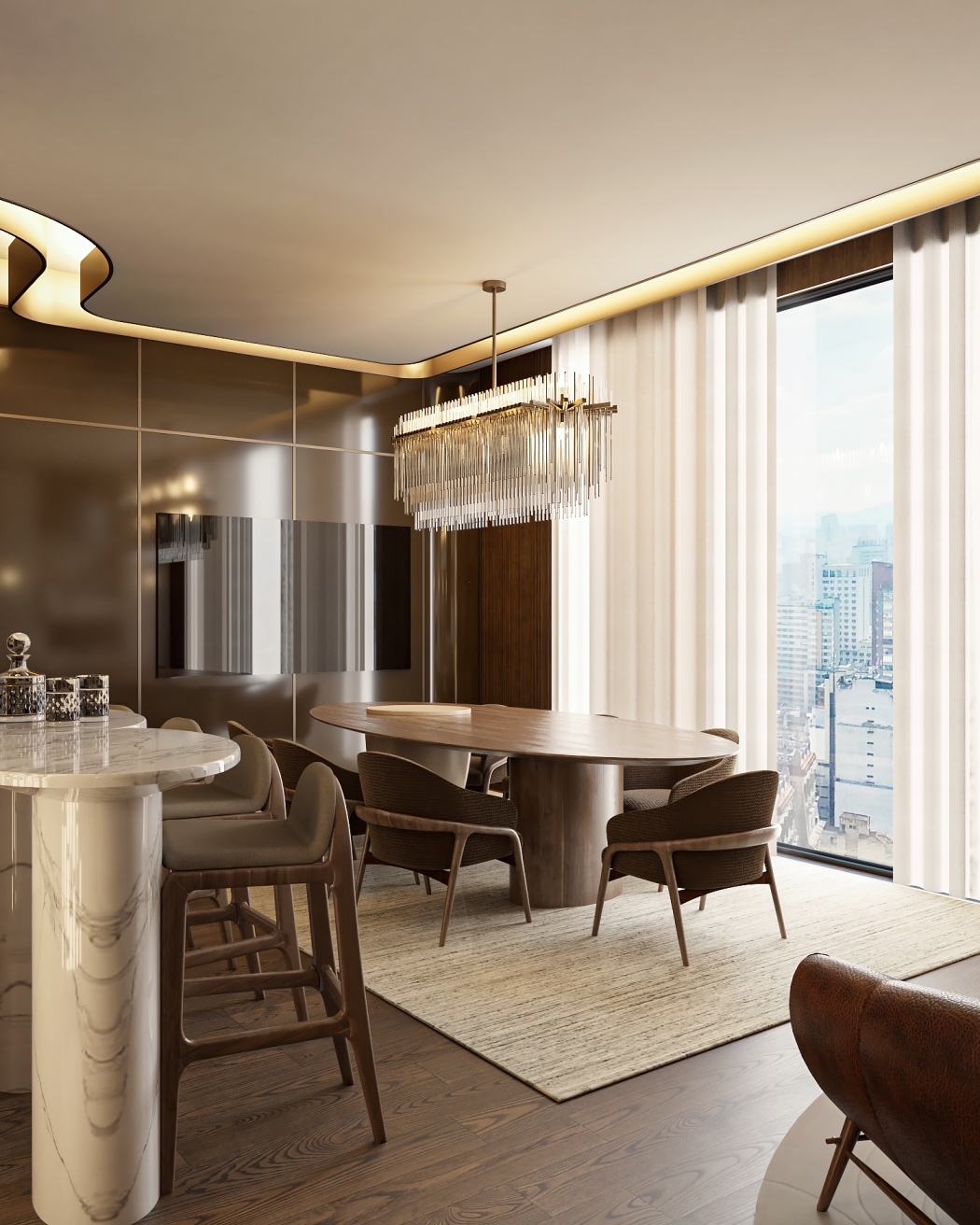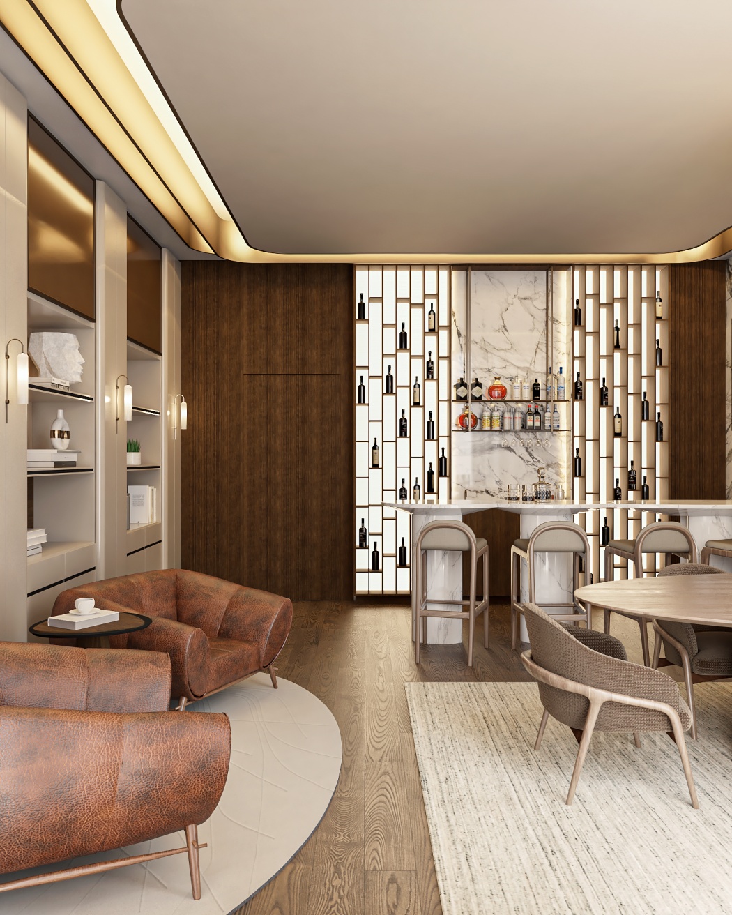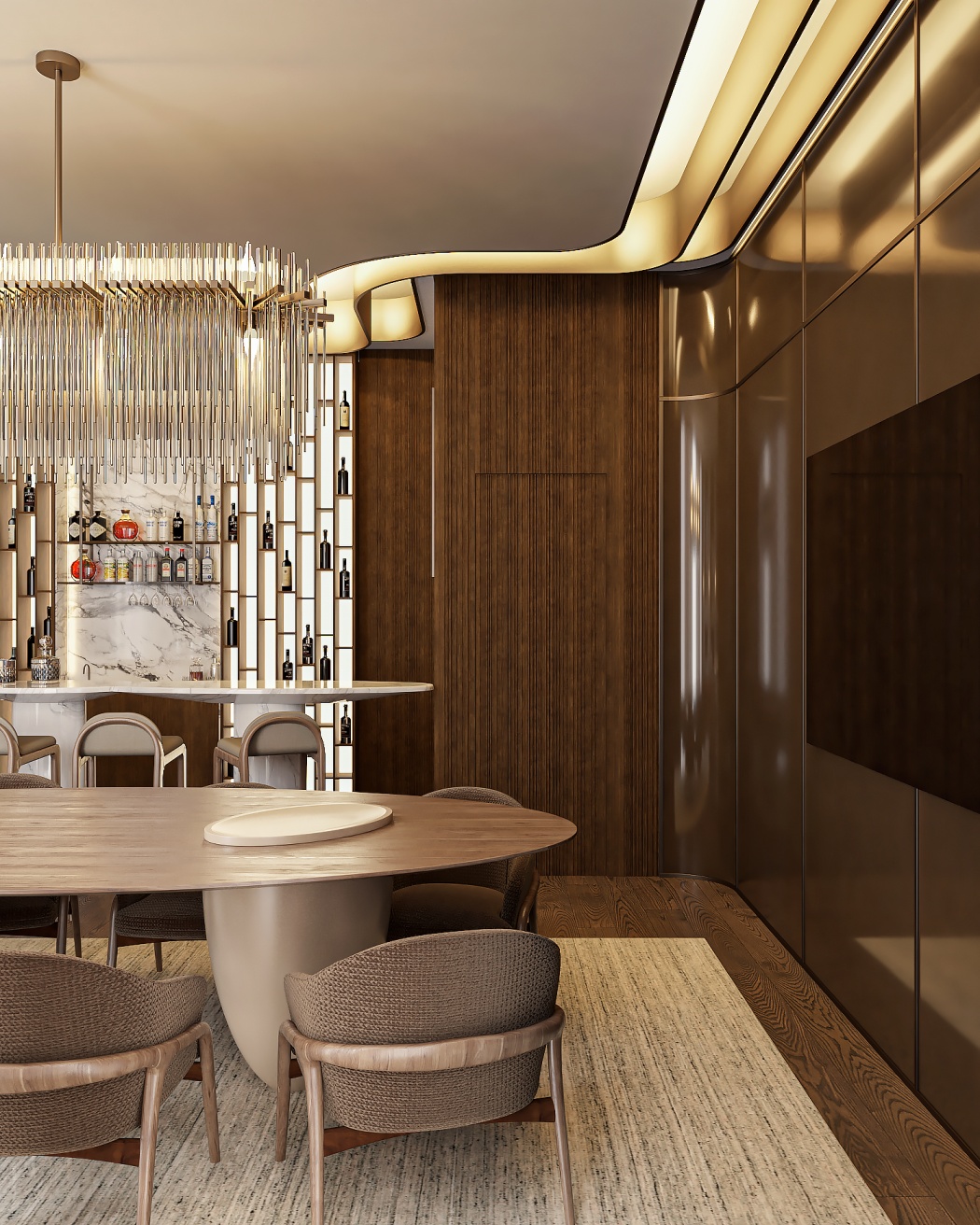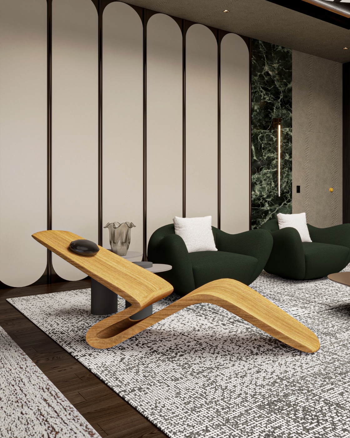Esta elegante sala de reunião, onde o refinamento é a essência do ambiente. O bar em mármore brilha com sofisticação, proporcionando um ponto focal impressionante. Detalhes em tons marrons, presentes em móveis e elementos decorativos, acrescentam uma nota de aconchego e seriedade ao espaço. Poltronas de couro, dispostas estrategicamente, conferem um toque de luxo e conforto, criando um ambiente propício para discussões e decisões importantes.