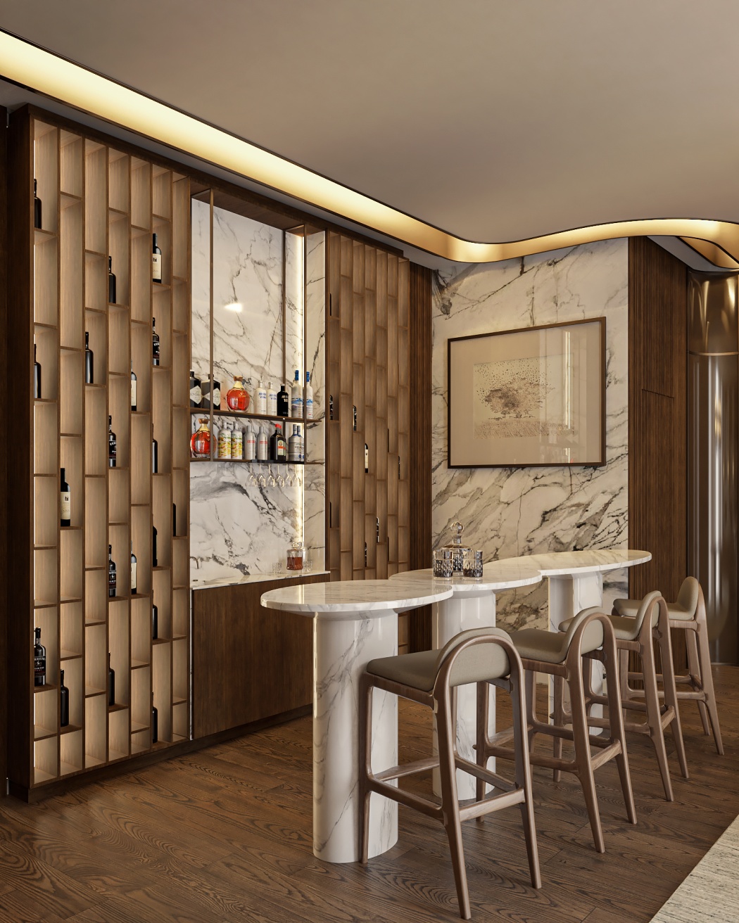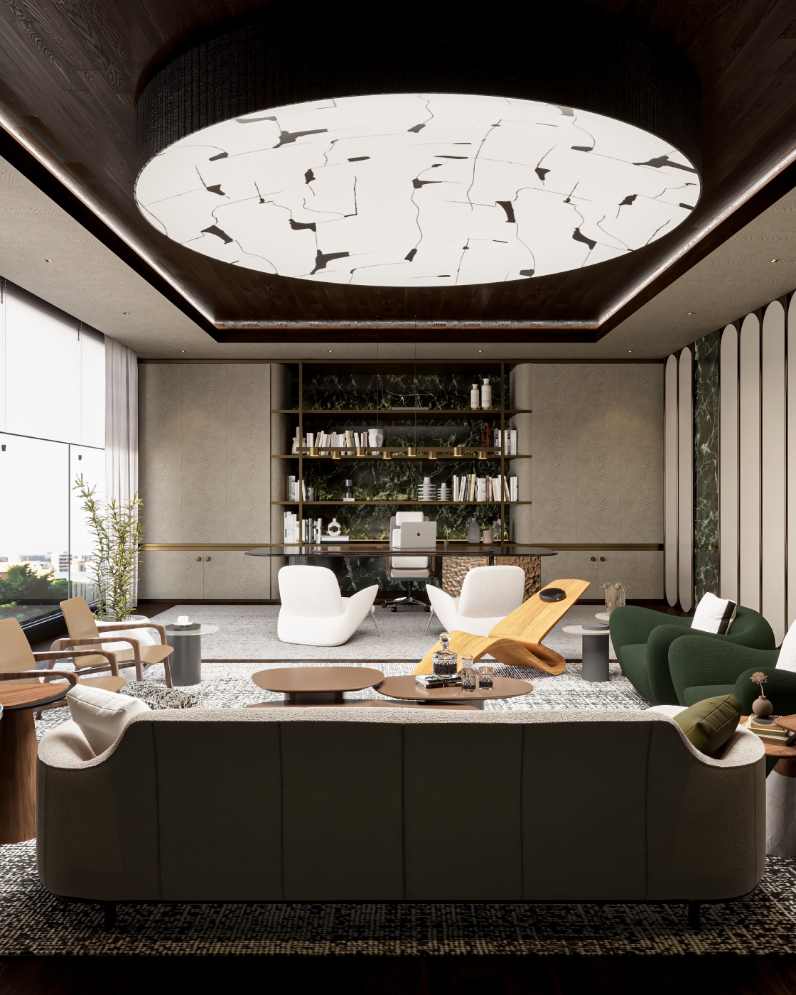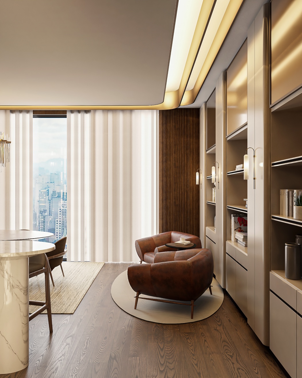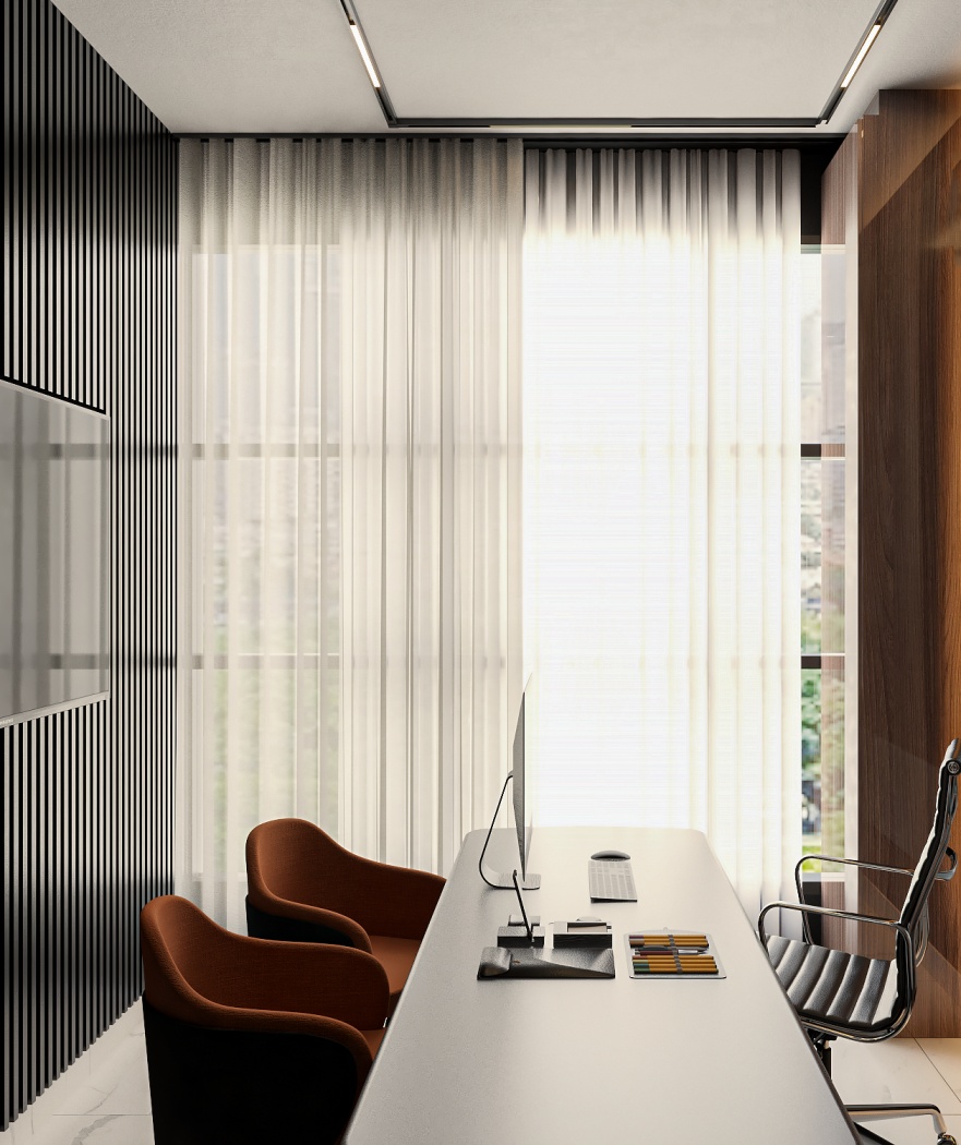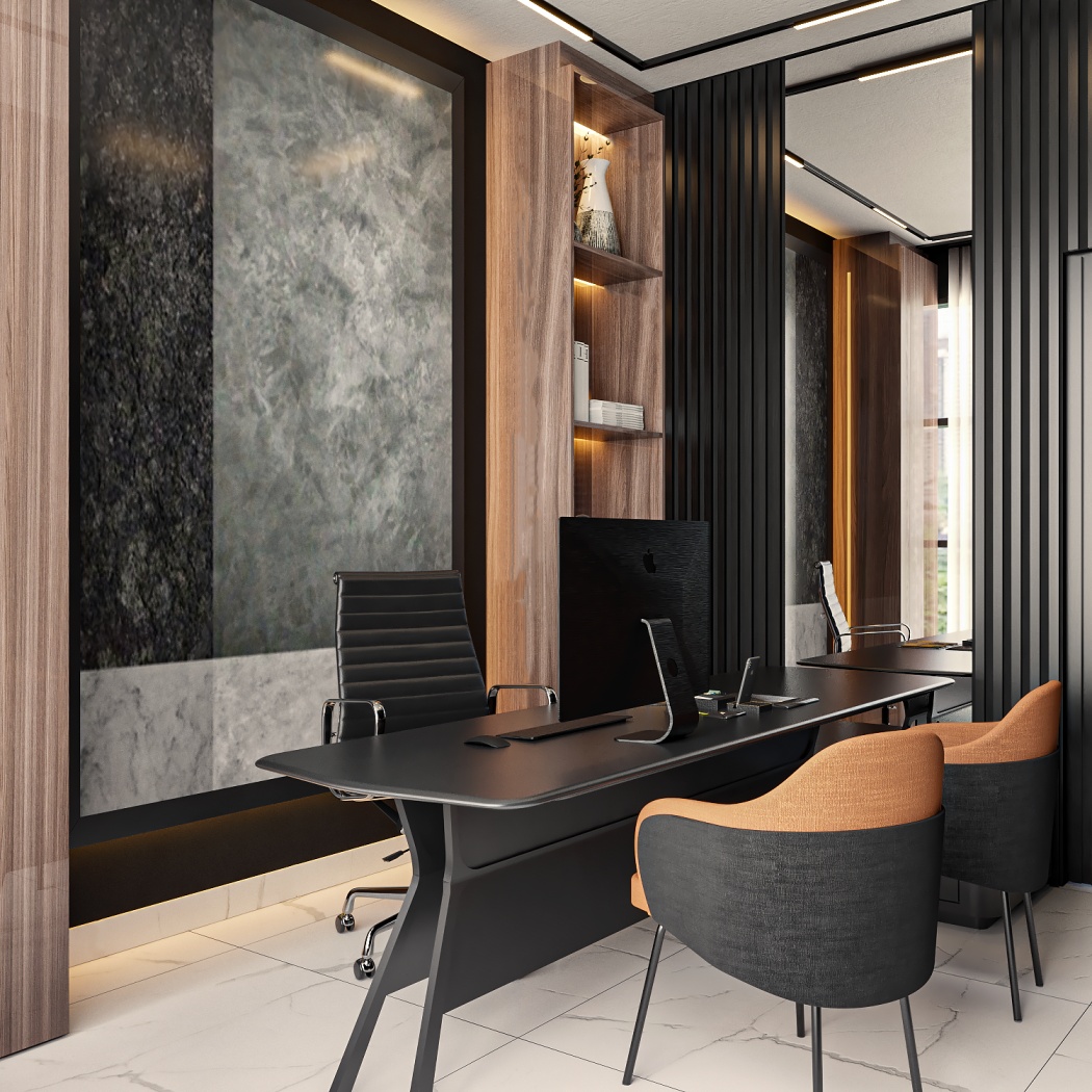 Esta elegante sala de reunião, onde o refinamento é a essência do ambiente. O bar em mármore brilha com sofisticação, proporcionando um ponto focal impressionante. Detalhes em tons marrons, presentes em móveis e elementos decorativos, acrescentam uma nota de aconchego e seriedade ao espaço. Poltronas de couro, dispostas estrategicamente, conferem um toque de luxo e conforto, criando um ambiente propício para discussões e decisões importantes.
