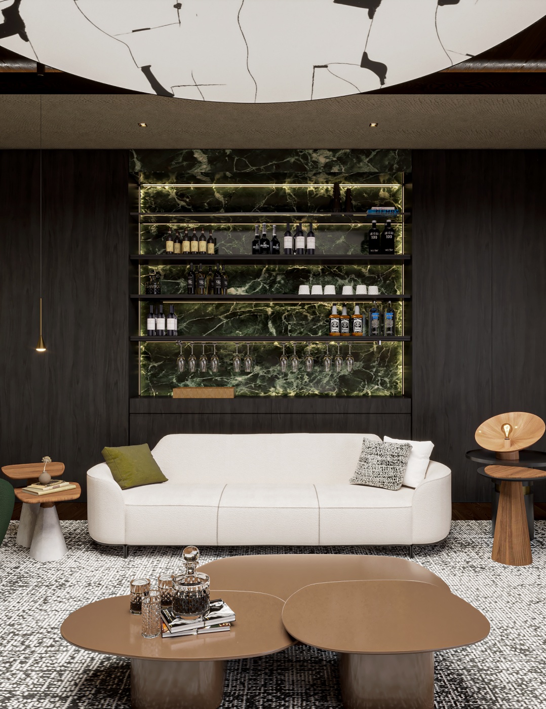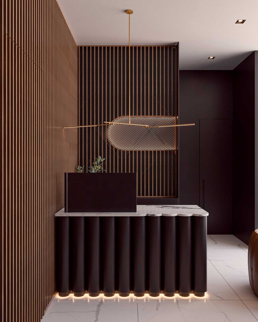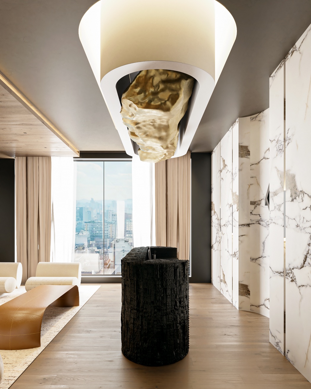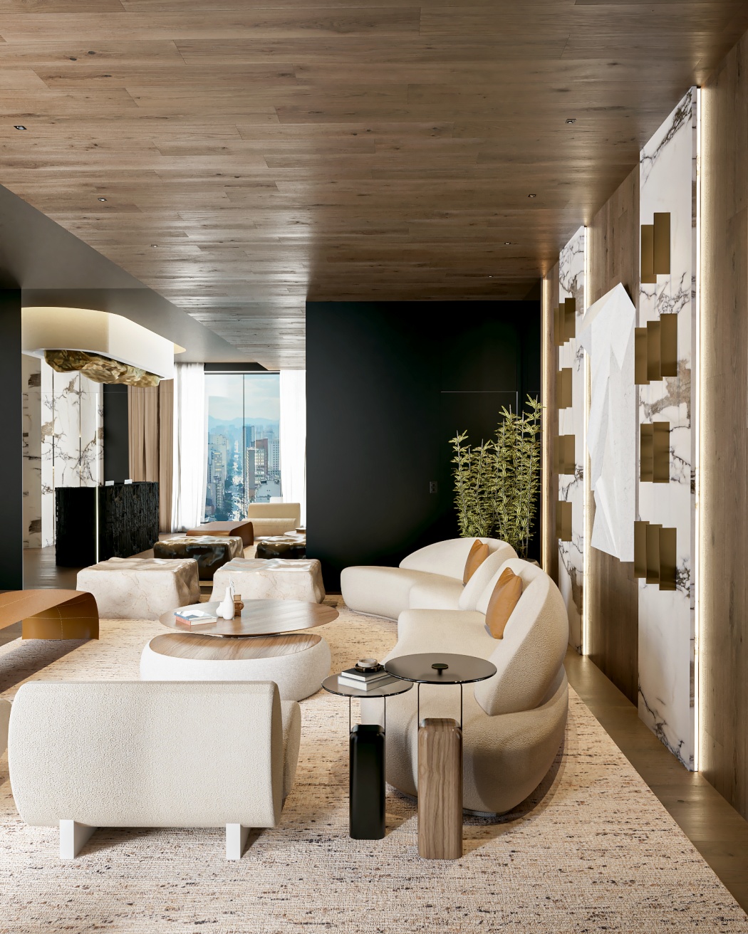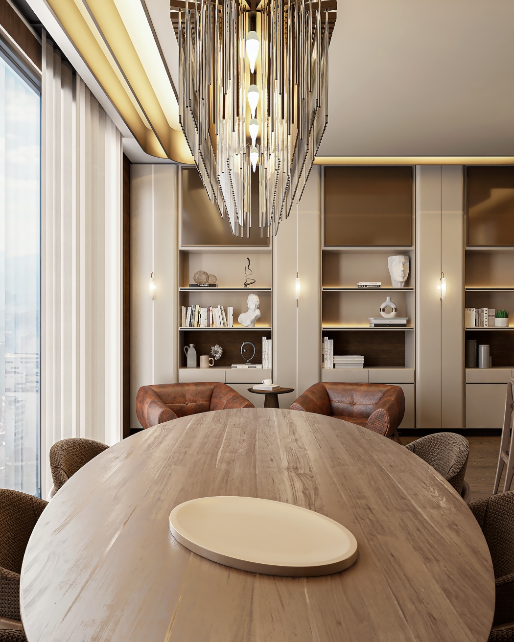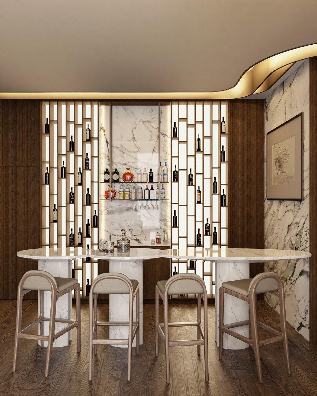 Esta elegante sala de reunião, onde o refinamento é a essência do ambiente. O bar em mármore brilha com sofisticação, proporcionando um ponto focal impressionante. Detalhes em tons marrons, presentes em móveis e elementos decorativos, acrescentam uma nota de aconchego e seriedade ao espaço. Poltronas de couro, dispostas estrategicamente, conferem um toque de luxo e conforto, criando um ambiente propício para discussões e decisões importantes.