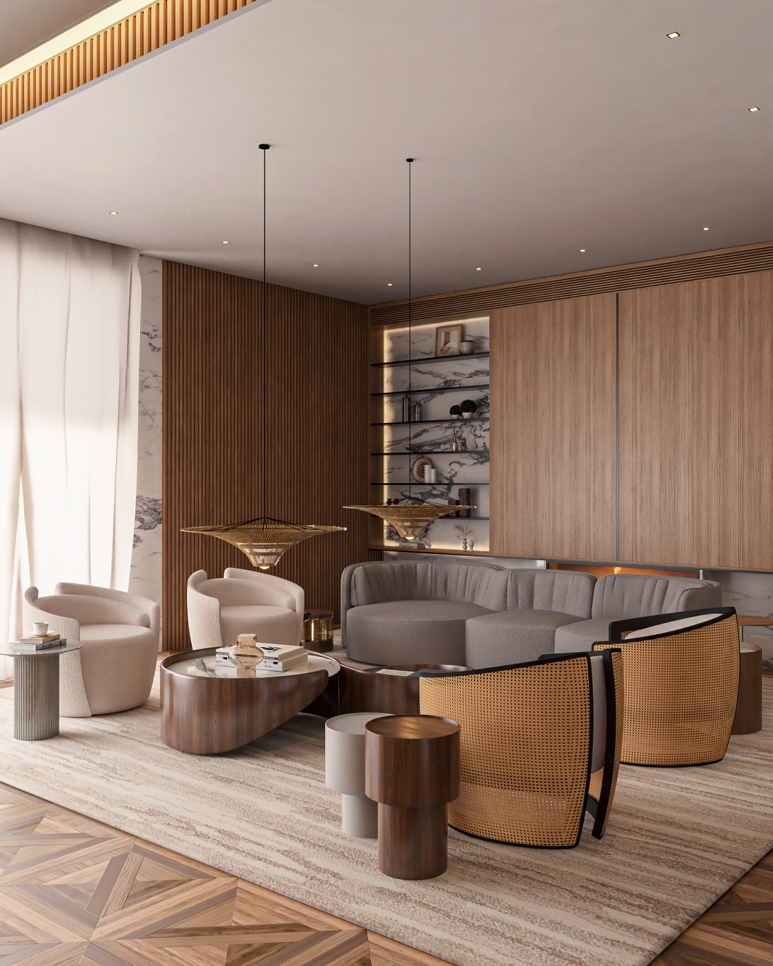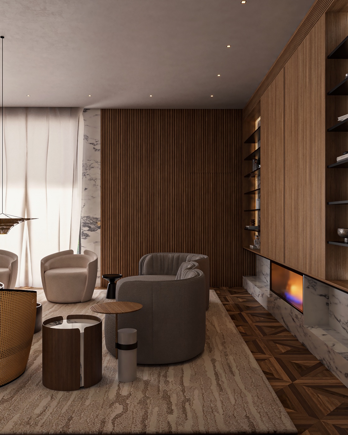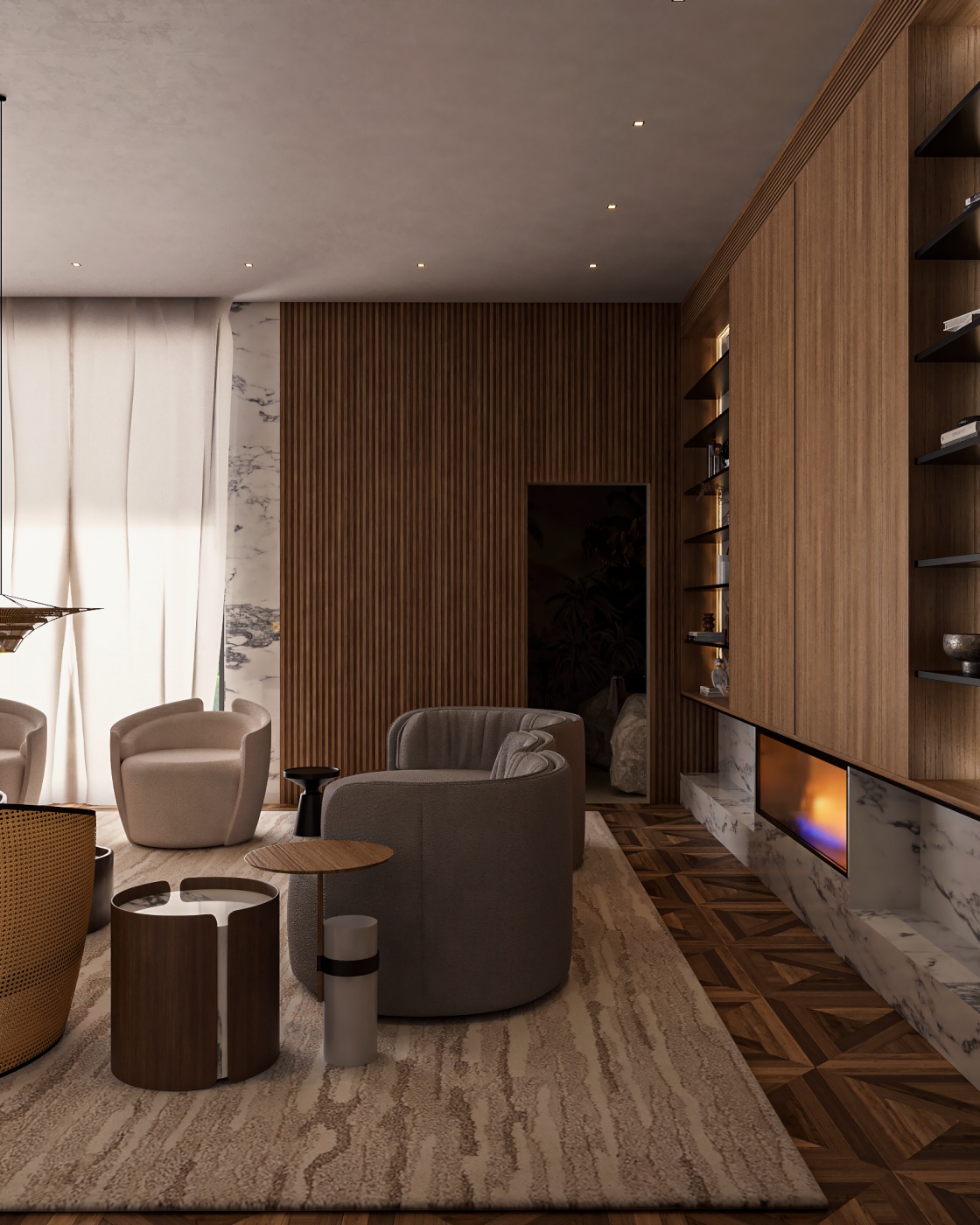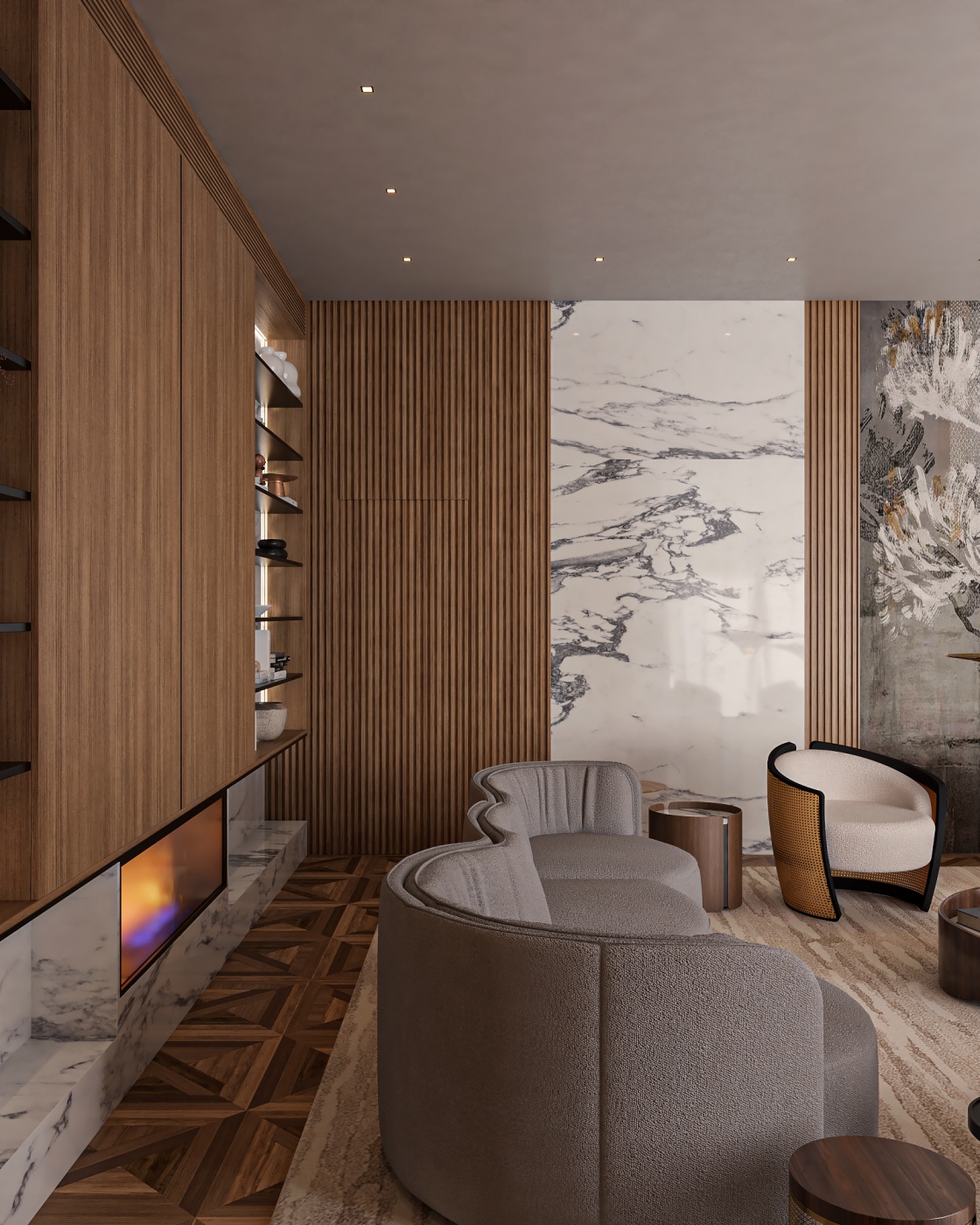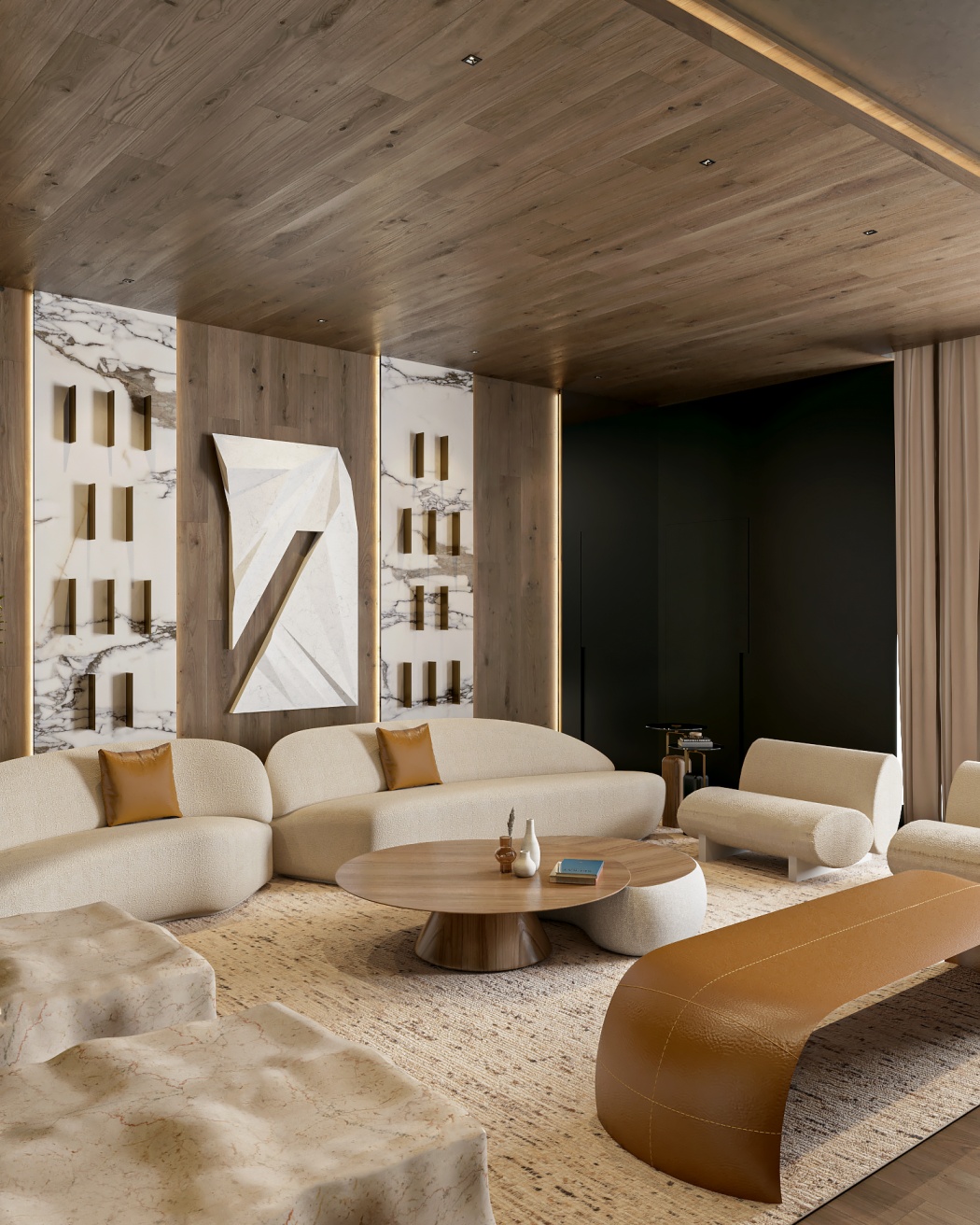 Esta elegante sala de reunião, onde o refinamento é a essência do ambiente. O bar em mármore brilha com sofisticação, proporcionando um ponto focal impressionante. Detalhes em tons marrons, presentes em móveis e elementos decorativos, acrescentam uma nota de aconchego e seriedade ao espaço. Poltronas de couro, dispostas estrategicamente, conferem um toque de luxo e conforto, criando um ambiente propício para discussões e decisões importantes.