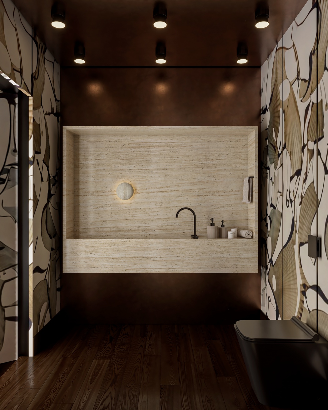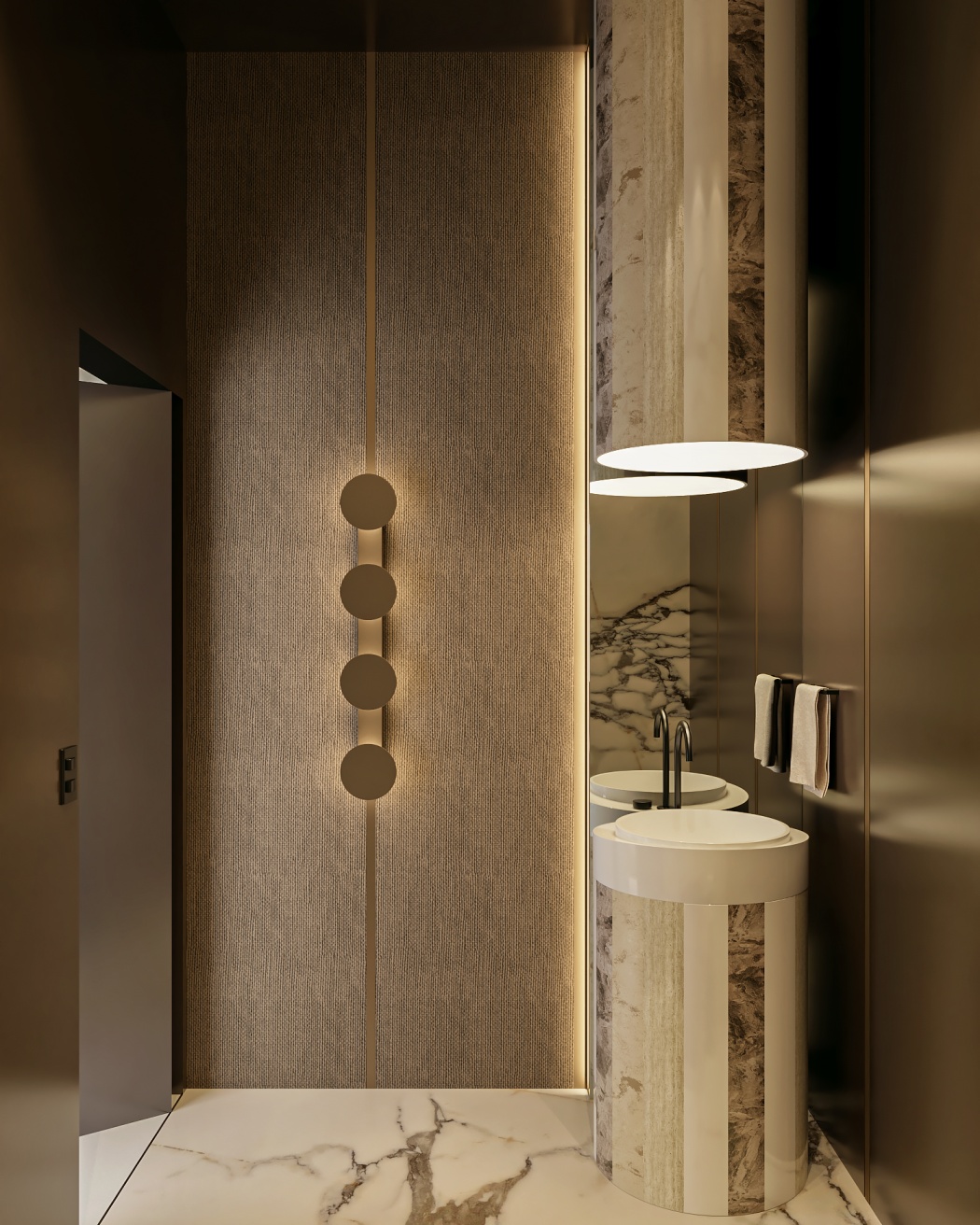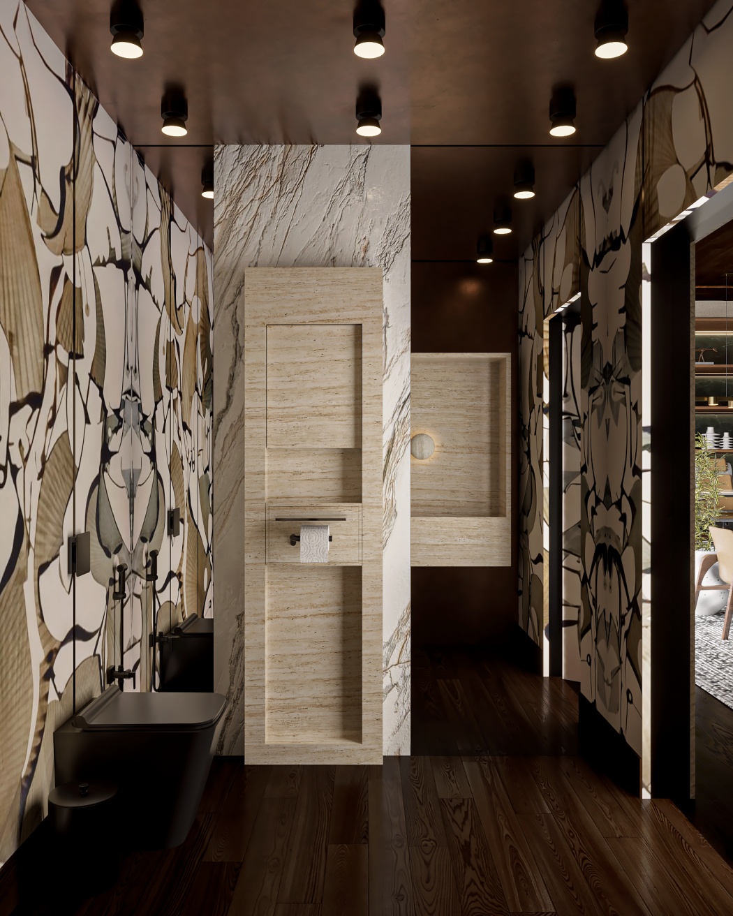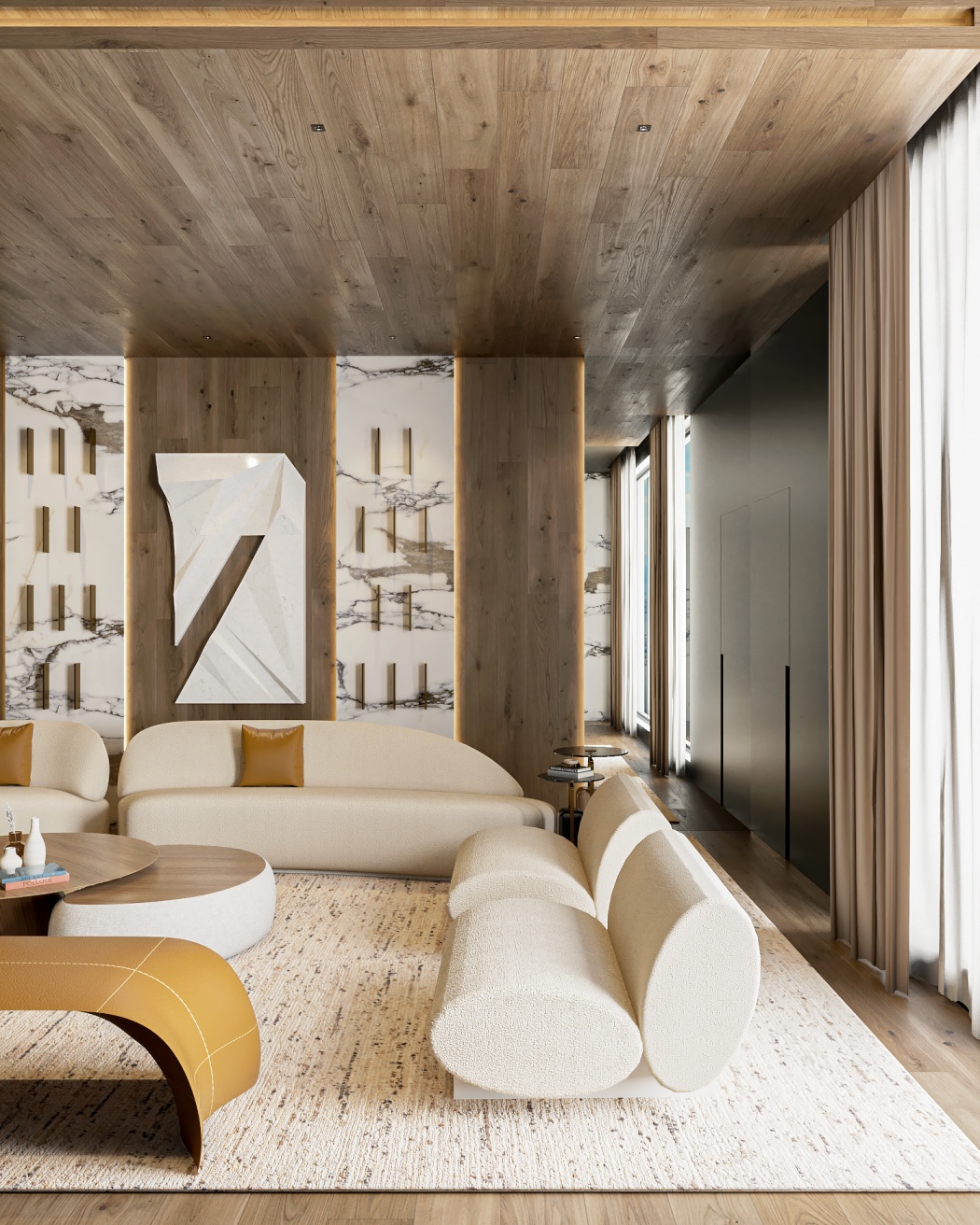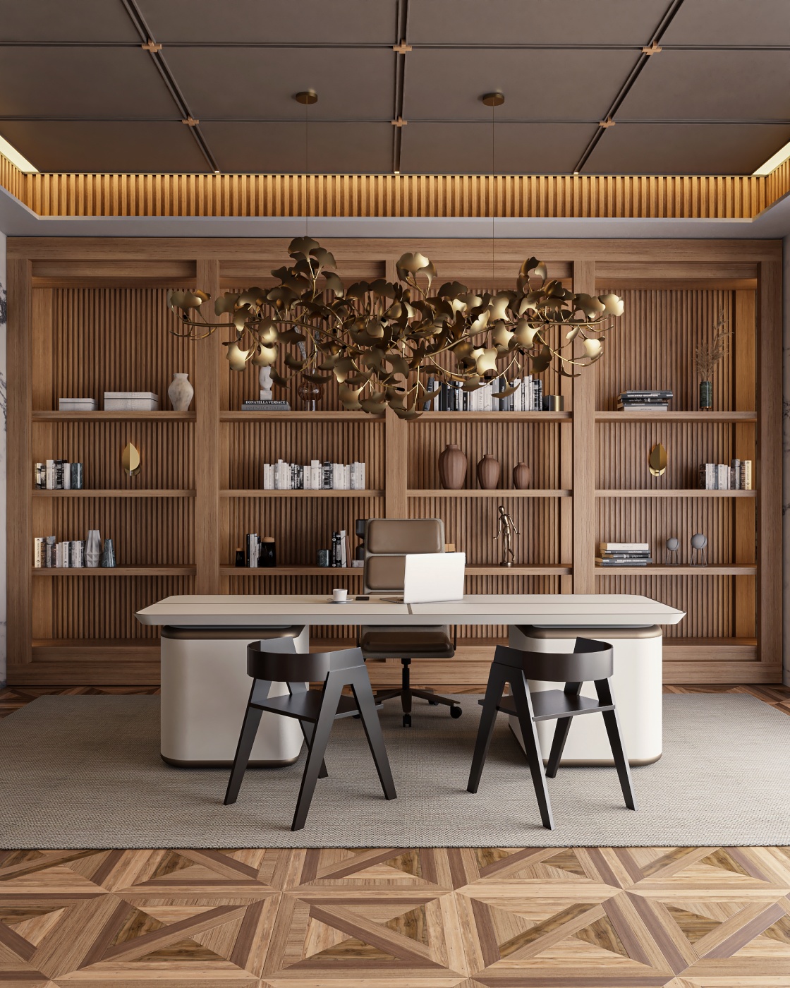 Esta elegante sala de reunião, onde o refinamento é a essência do ambiente. O bar em mármore brilha com sofisticação, proporcionando um ponto focal impressionante. Detalhes em tons marrons, presentes em móveis e elementos decorativos, acrescentam uma nota de aconchego e seriedade ao espaço. Poltronas de couro, dispostas estrategicamente, conferem um toque de luxo e conforto, criando um ambiente propício para discussões e decisões importantes.