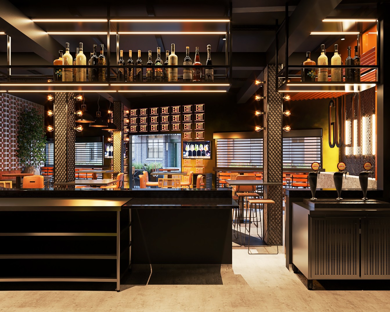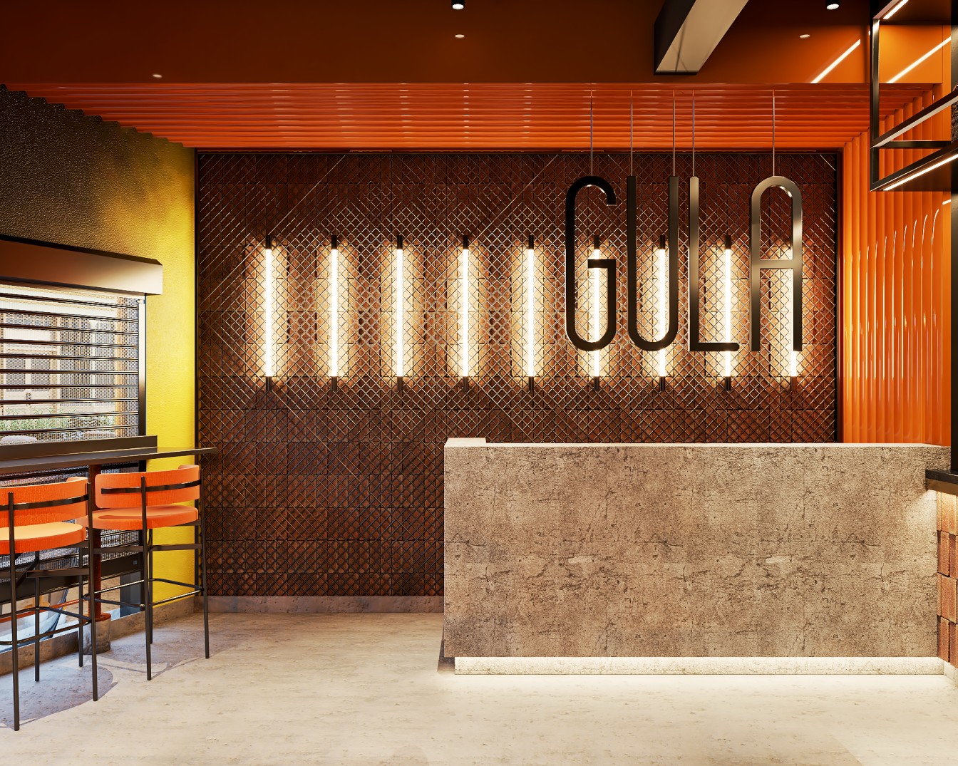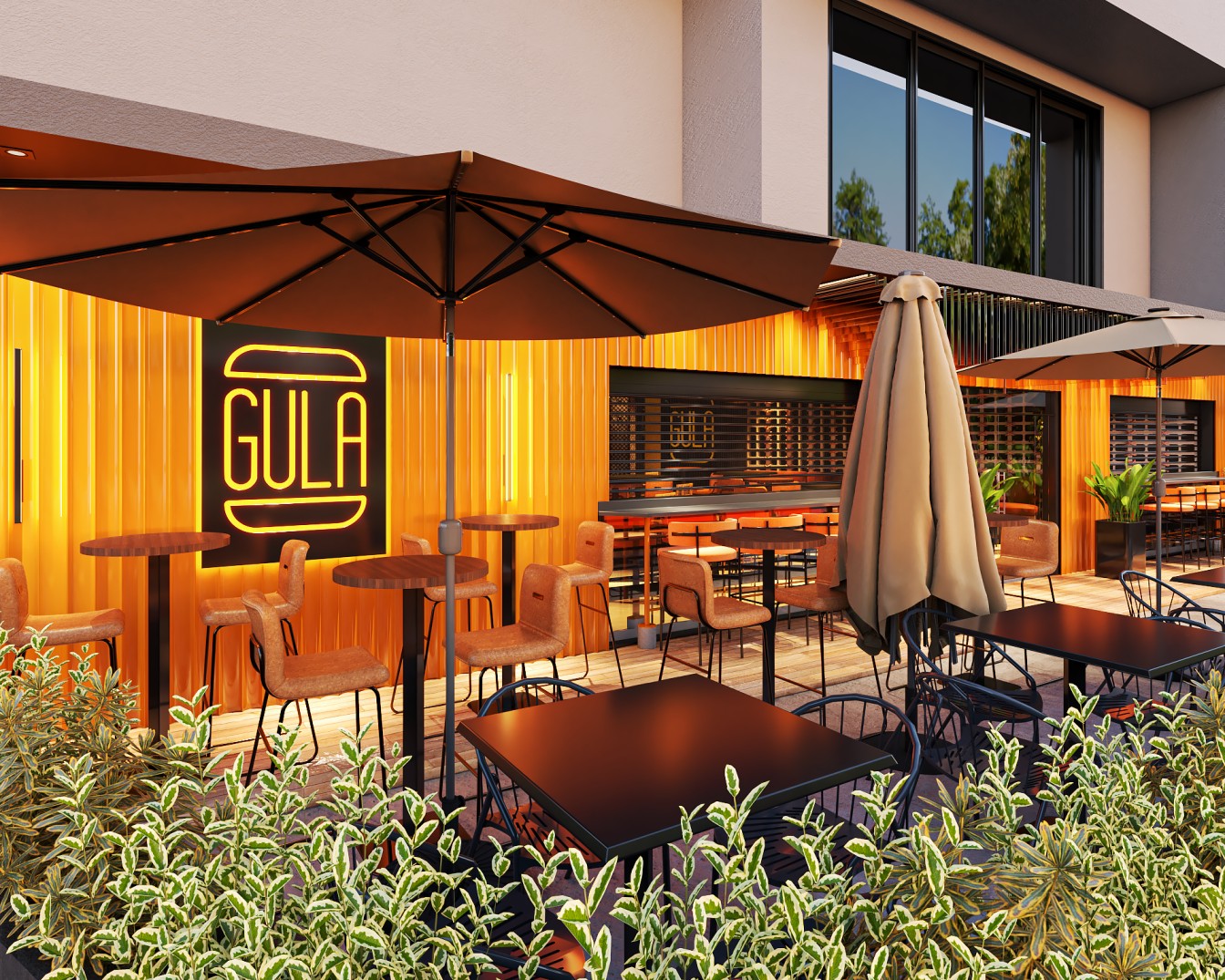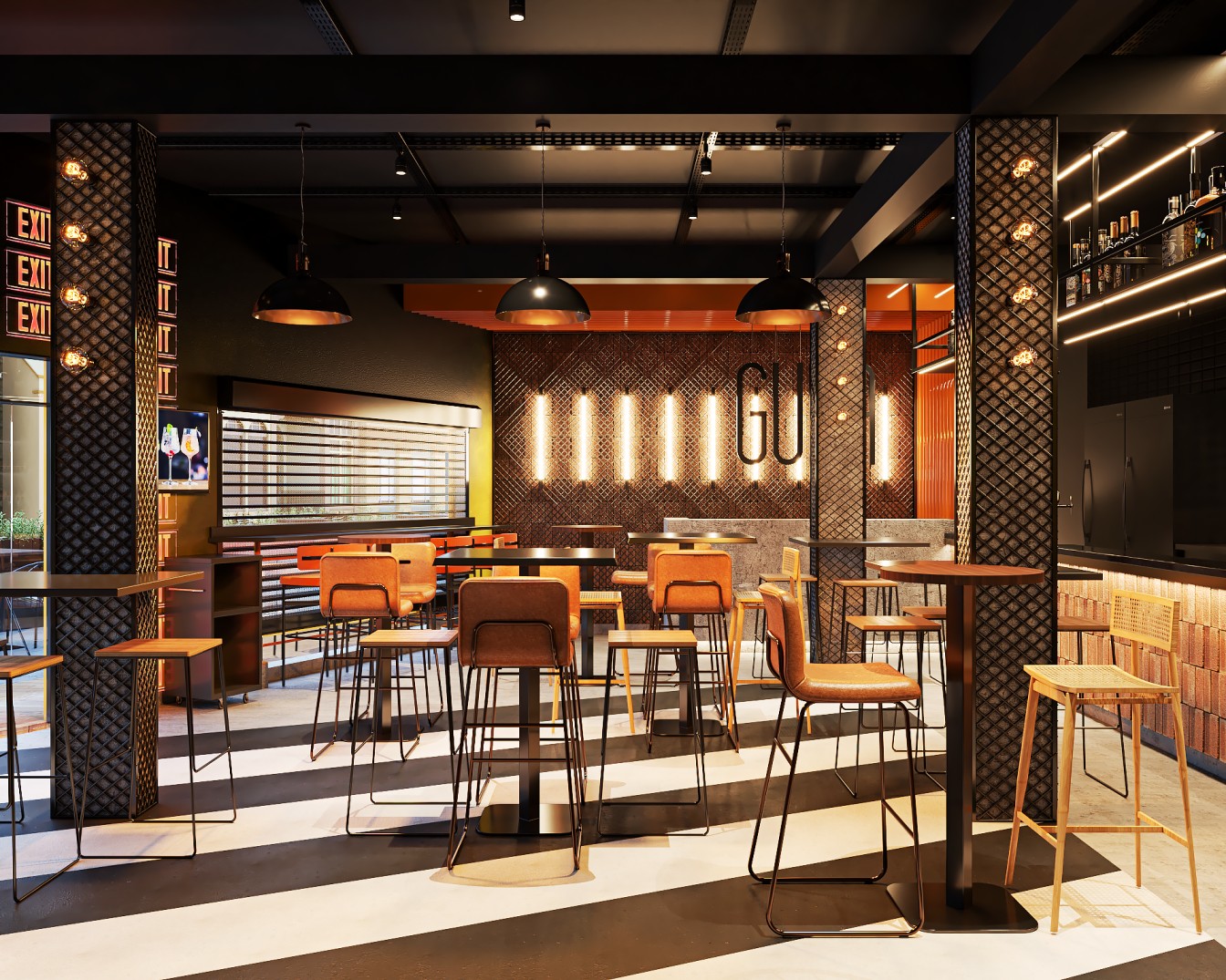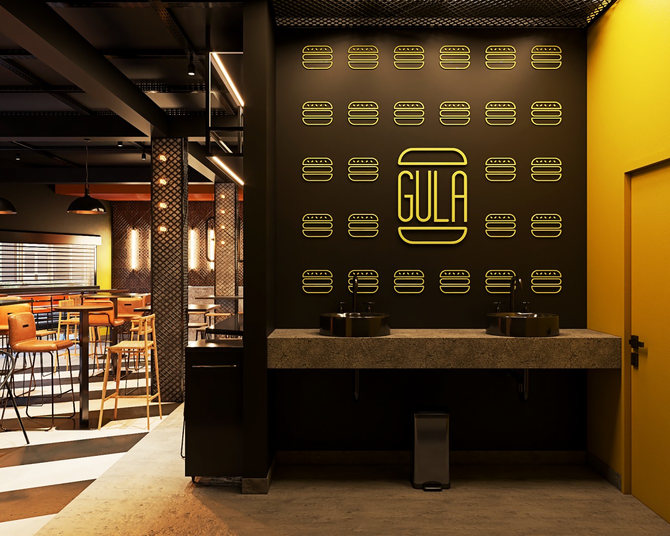 Na Gula Hamburgueria a fusão de elementos industriais e cores vibrantes cria um ambiente único, perfeito para saborear hambúrgueres suculentos em um cenário descontraído e moderno. As paredes de tijolos expostos, combinadas com tubulações aparentes, conferem ao espaço um caráter urbano e contemporâneo. Móveis de metal robusto e madeira escura contribuem para a atmosfera industrial, enquanto detalhes vibrantes em laranja, como luminárias suspensas e detalhes decorativos, adicionam um toque de energia e vitalidade ao ambiente.