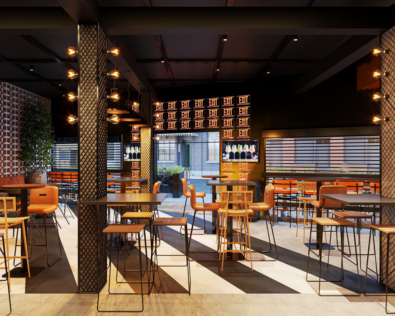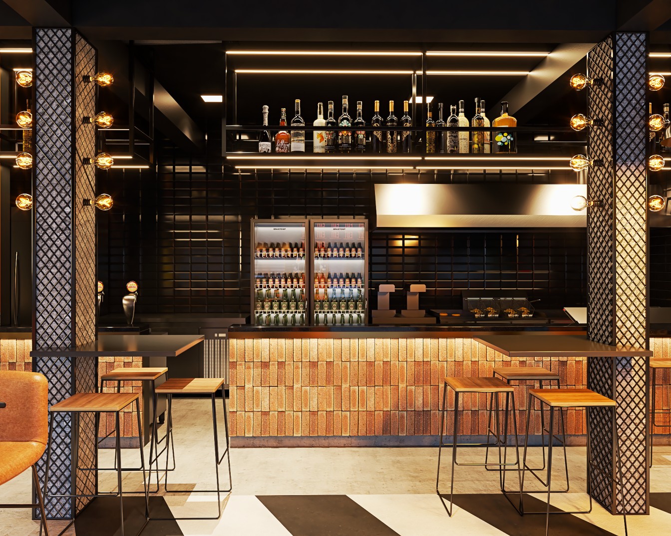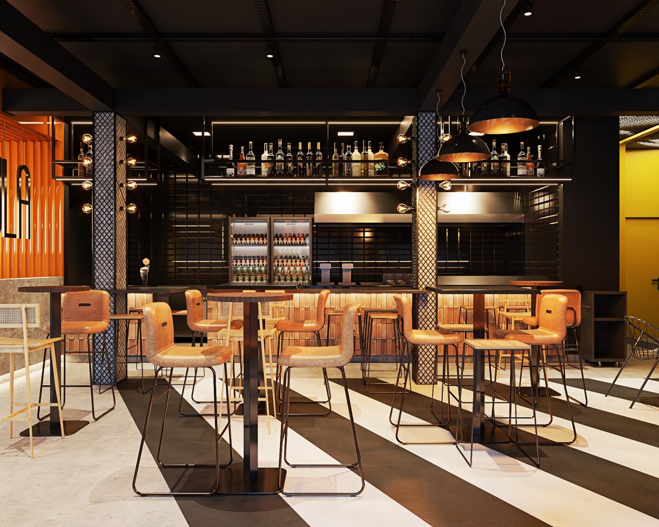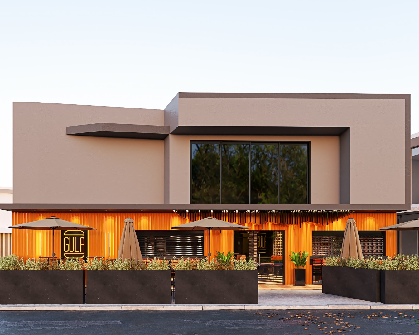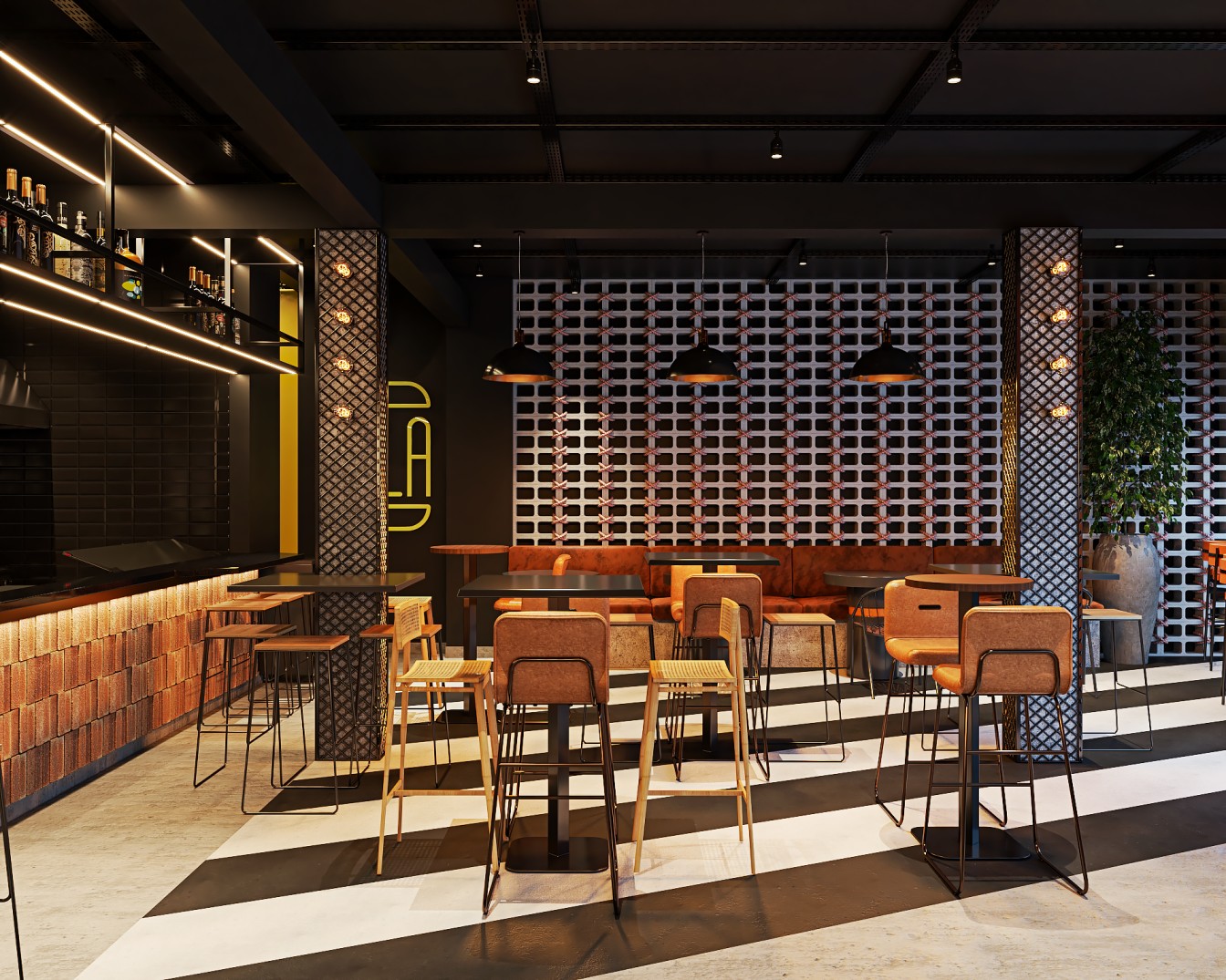 Na Gula Hamburgueria a fusão de elementos industriais e cores vibrantes cria um ambiente único, perfeito para saborear hambúrgueres suculentos em um cenário descontraído e moderno. As paredes de tijolos expostos, combinadas com tubulações aparentes, conferem ao espaço um caráter urbano e contemporâneo. Móveis de metal robusto e madeira escura contribuem para a atmosfera industrial, enquanto detalhes vibrantes em laranja, como luminárias suspensas e detalhes decorativos, adicionam um toque de energia e vitalidade ao ambiente.