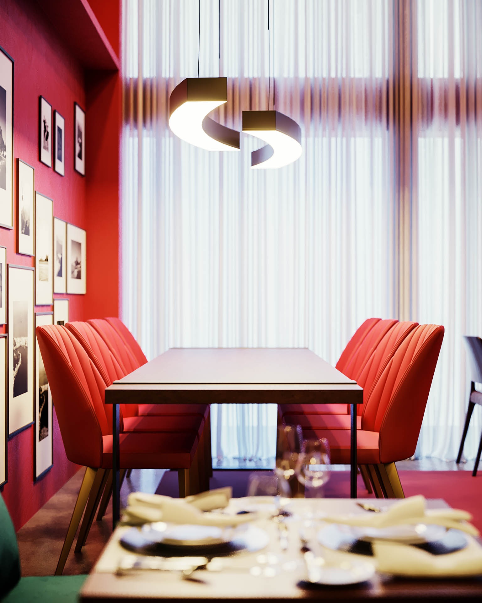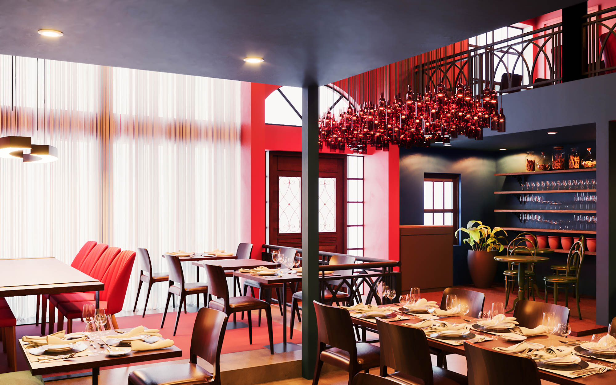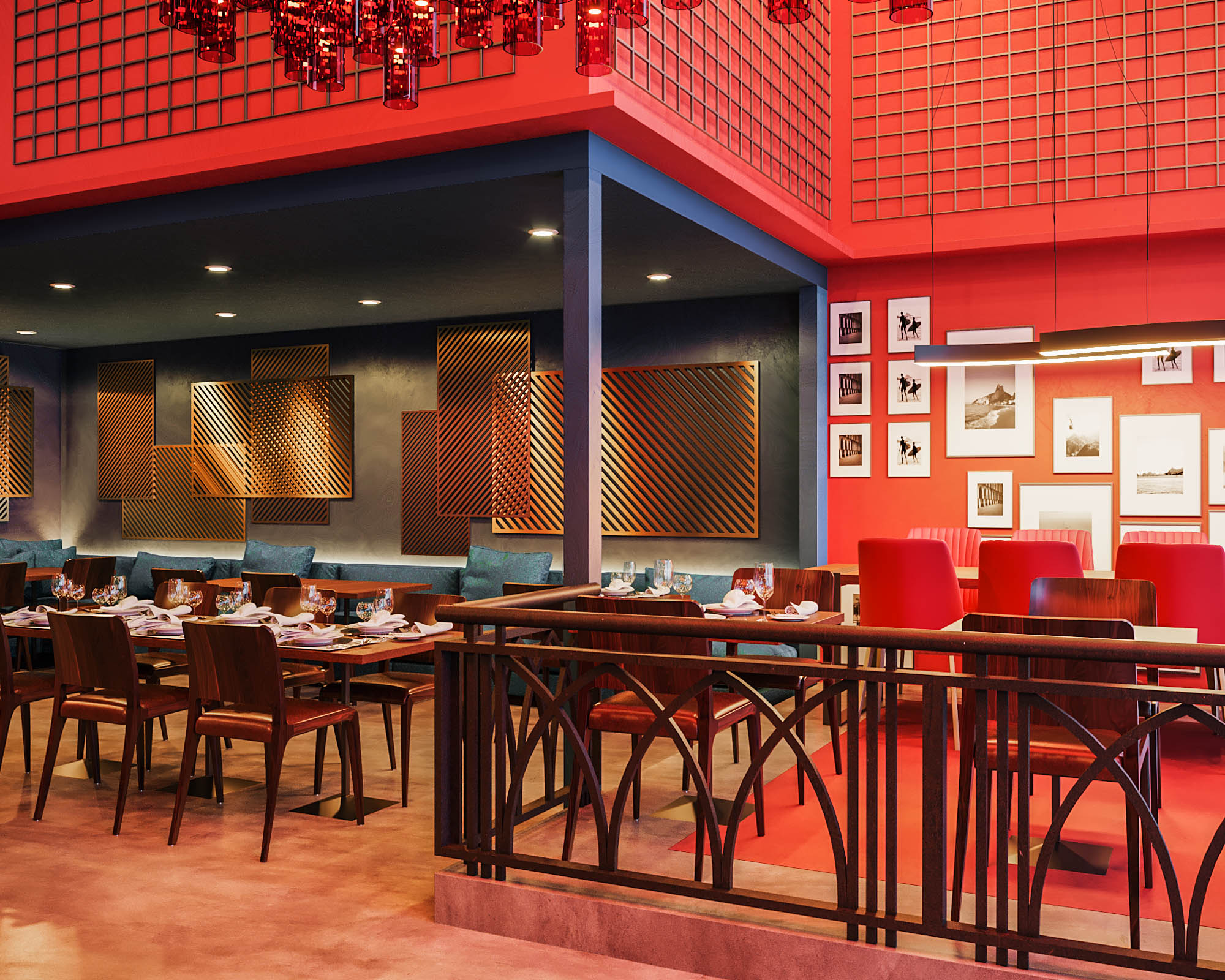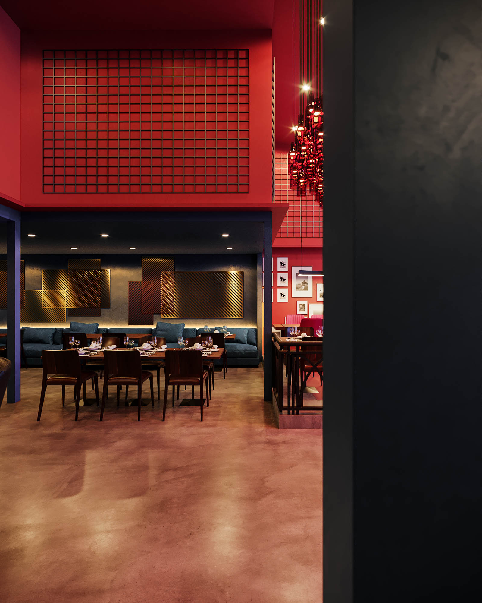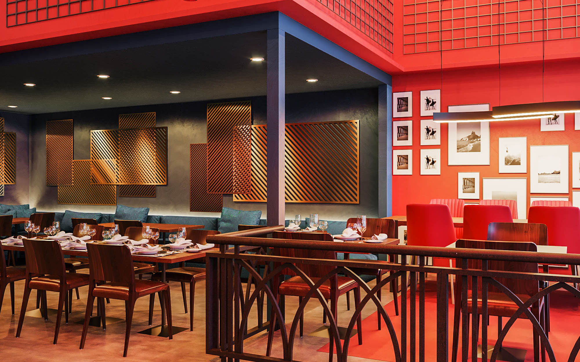 Este restaurante italiano fora do comum, onde o tom forte de vermelho domina o ambiente, conferindo-lhe uma atmosfera vibrante e apaixonante. Detalhes metálicos em preto pontuam o espaço, proporcionando um contraste sofisticado. Sofás em um tom envolvente de turquesa adicionam uma nota ousada e contemporânea ao ambiente, criando uma combinação intrigante de cores. Este local transcende as expectativas do típico restaurante italiano, oferecendo uma experiência visualmente cativante.