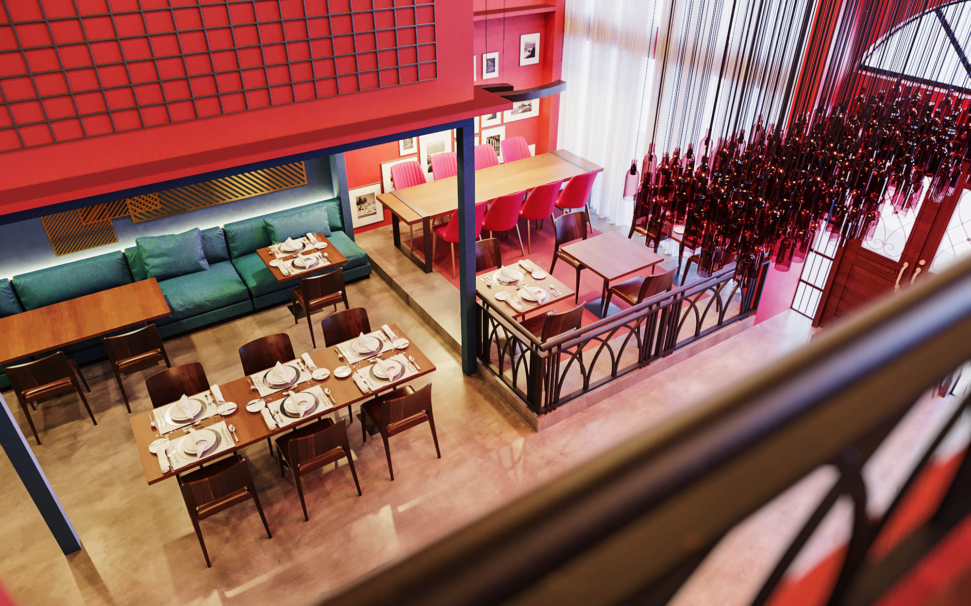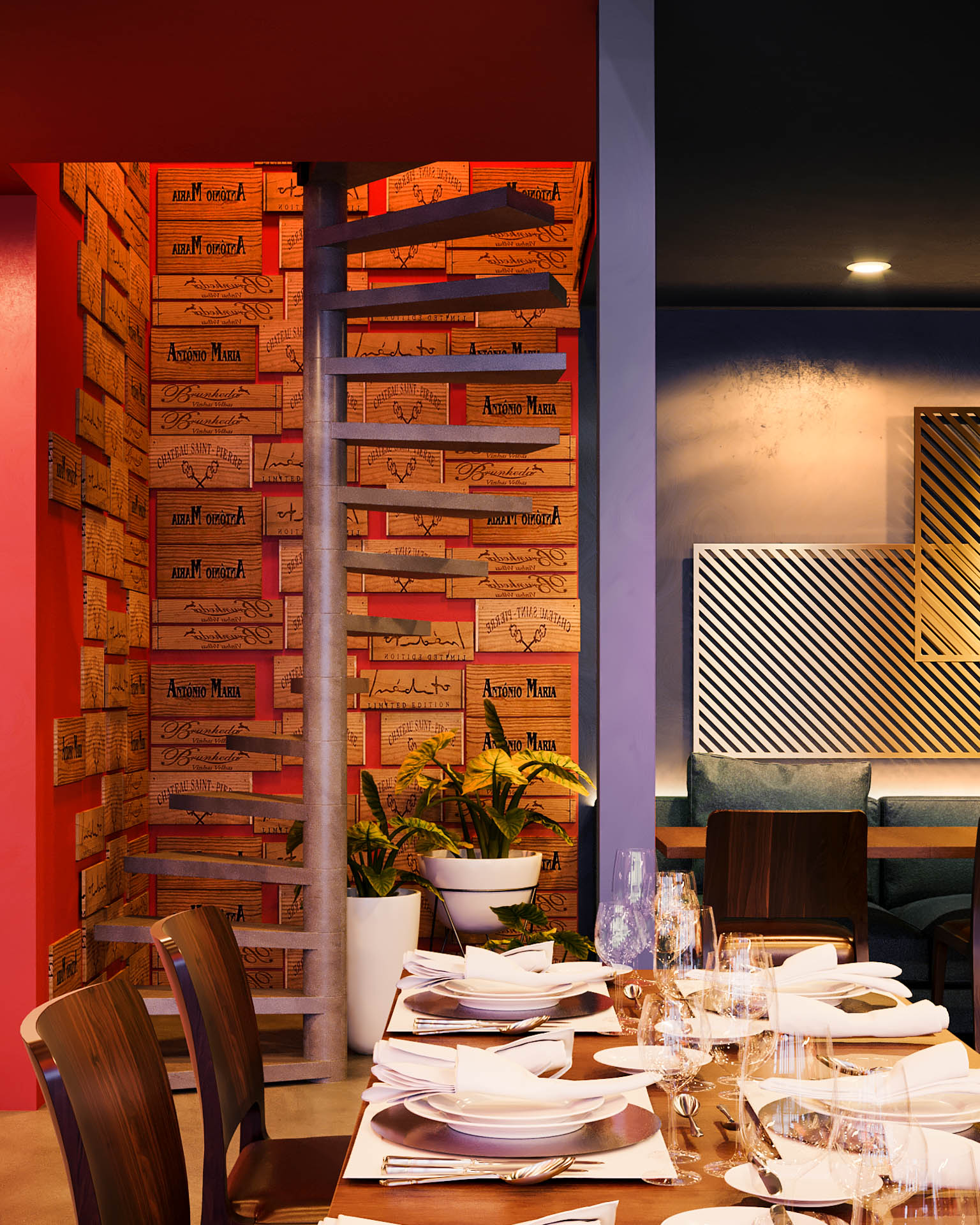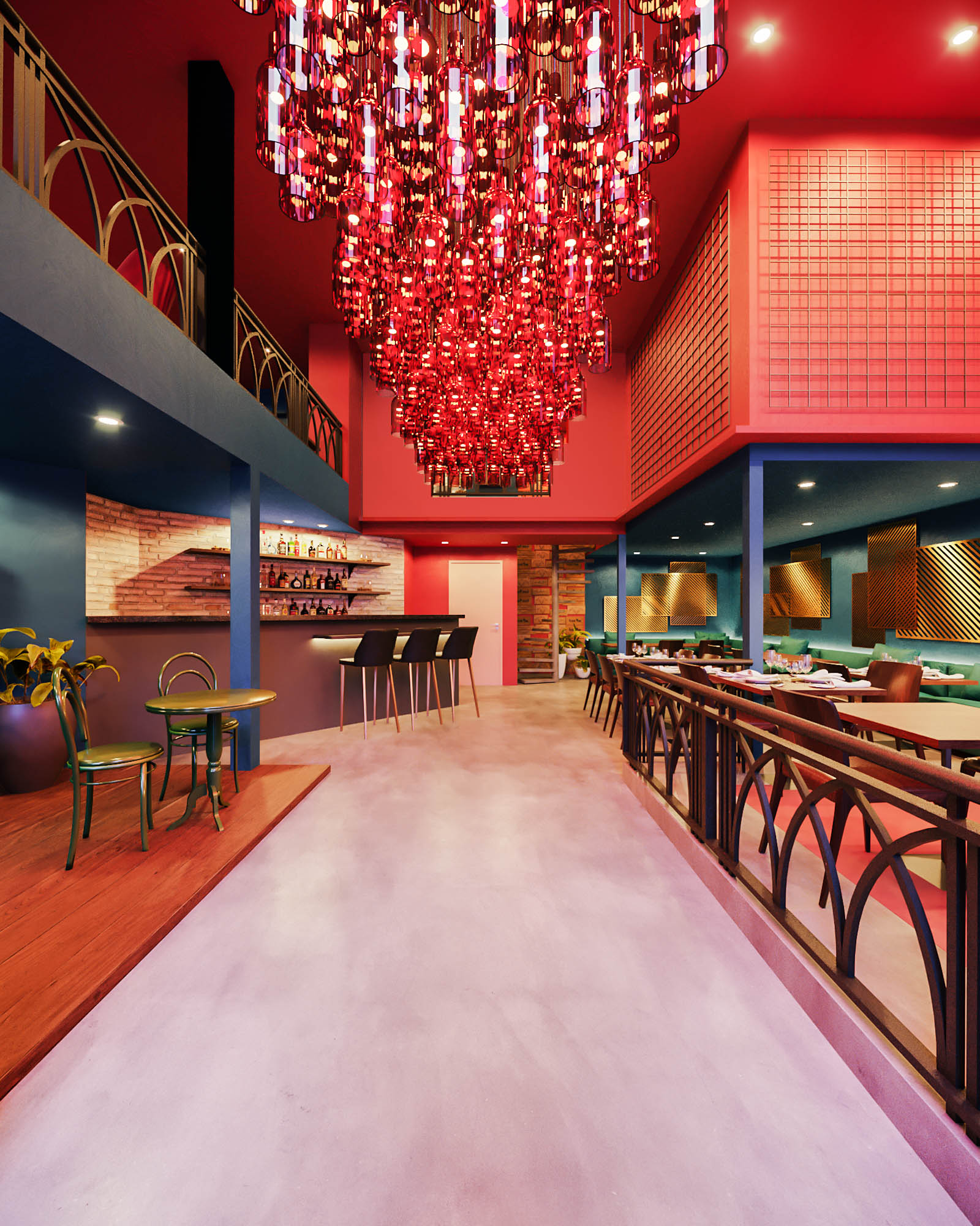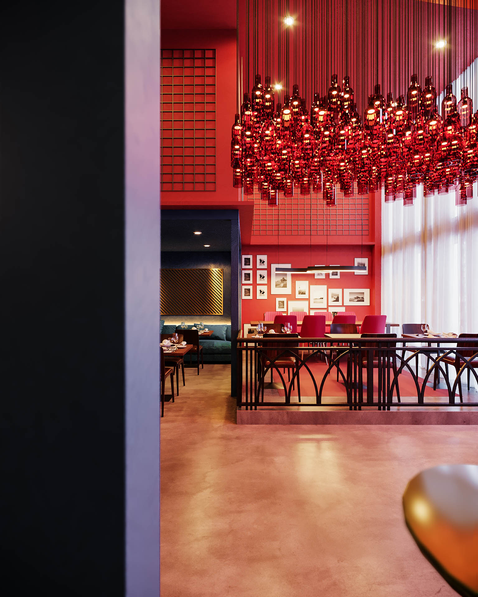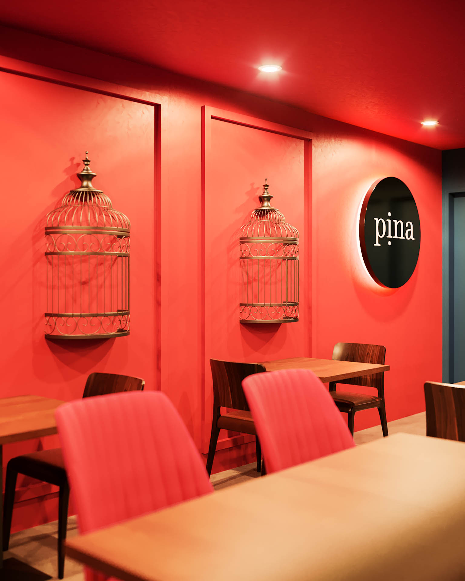 Este restaurante italiano fora do comum, onde o tom forte de vermelho domina o ambiente, conferindo-lhe uma atmosfera vibrante e apaixonante. Detalhes metálicos em preto pontuam o espaço, proporcionando um contraste sofisticado. Sofás em um tom envolvente de turquesa adicionam uma nota ousada e contemporânea ao ambiente, criando uma combinação intrigante de cores. Este local transcende as expectativas do típico restaurante italiano, oferecendo uma experiência visualmente cativante.