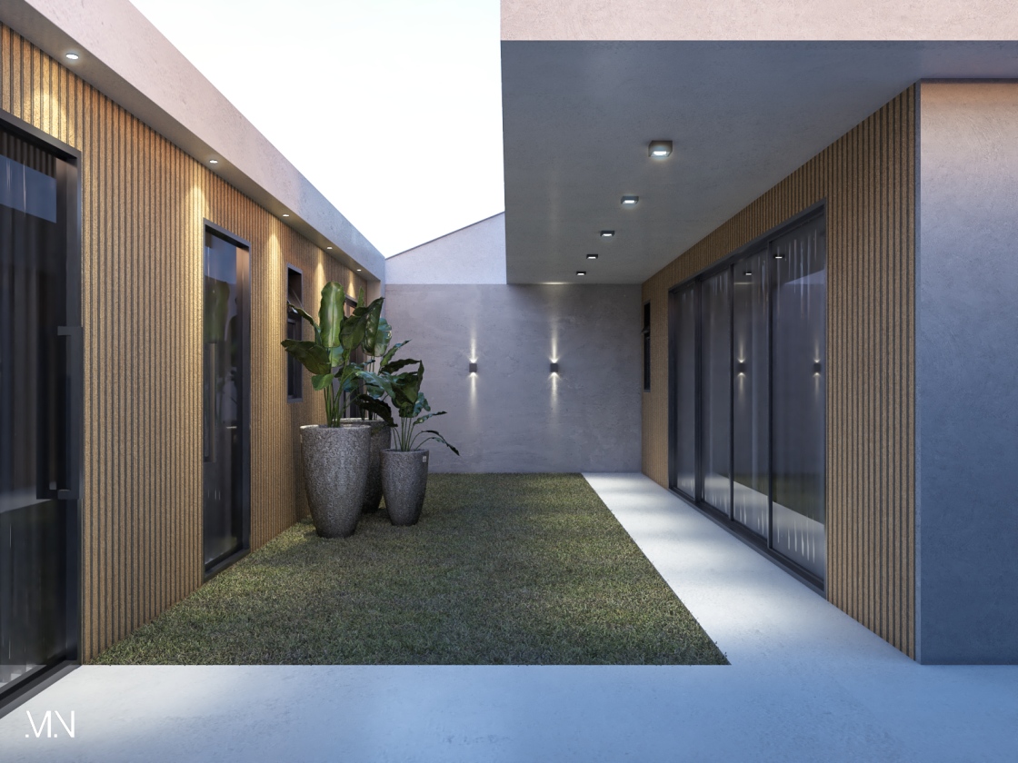 cuidadosa conferem uma sensação de equilíbrio à estrutura, destacada ainda mais por janelas de vidro generosas que proporcionam uma conexão harmoniosa entre o interior e o exterior.