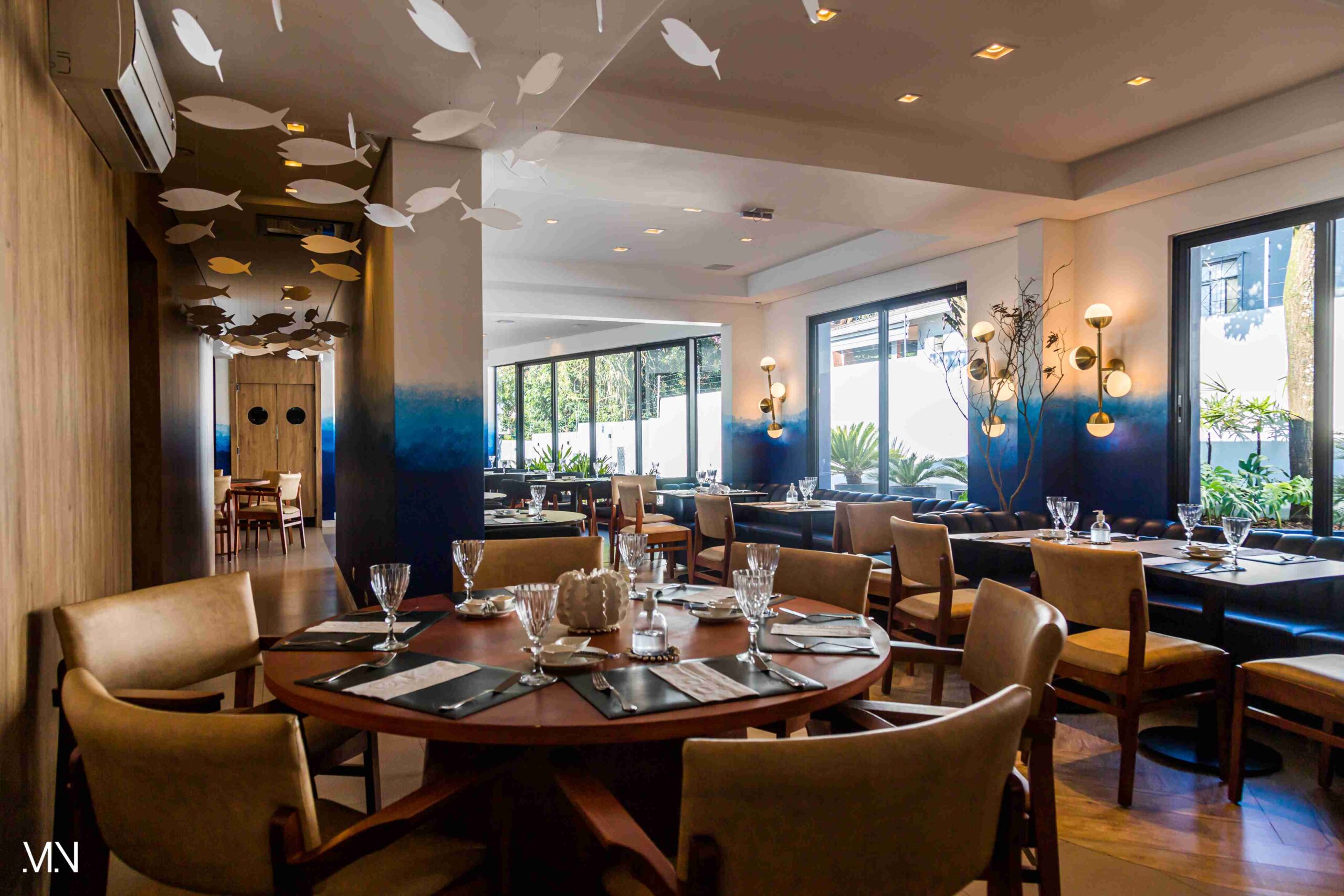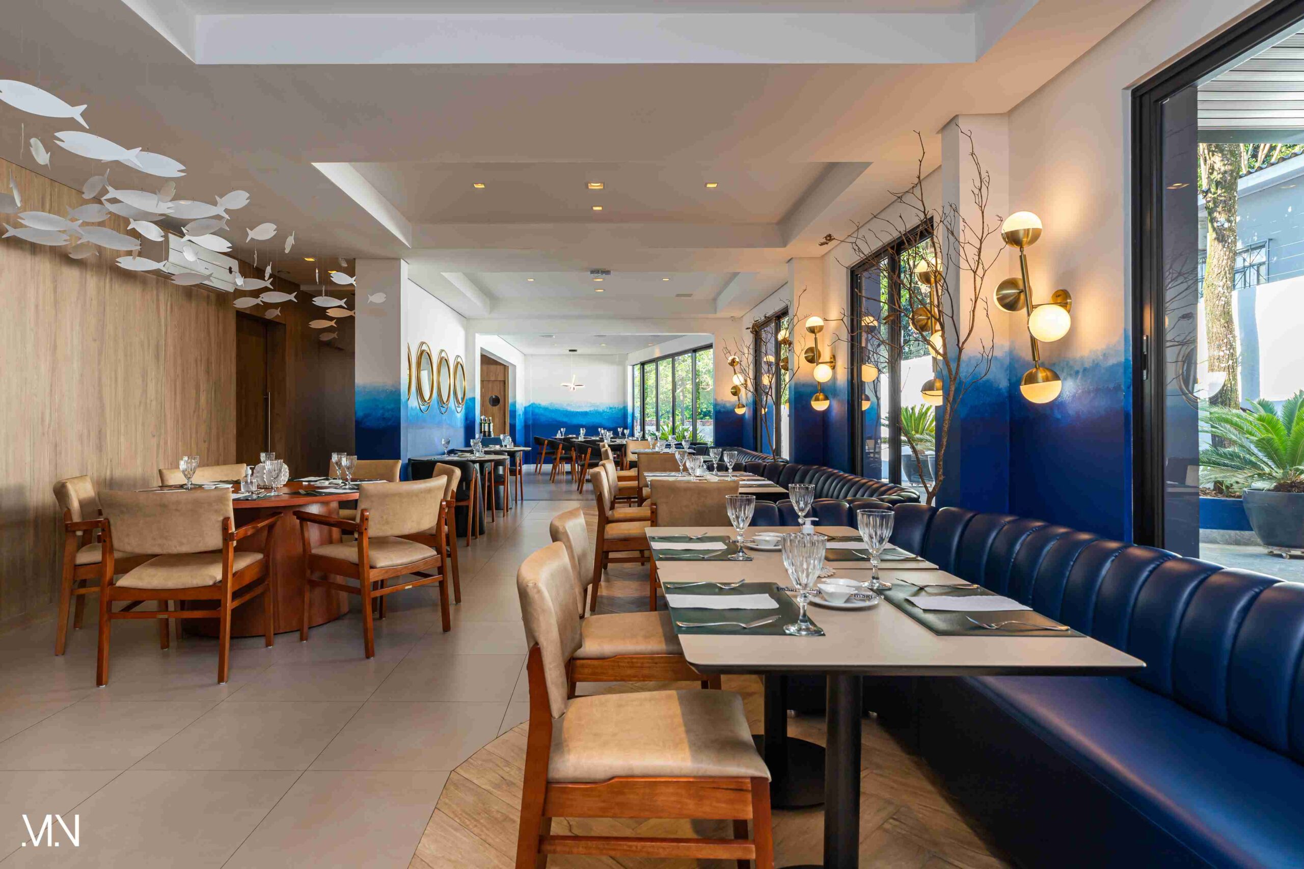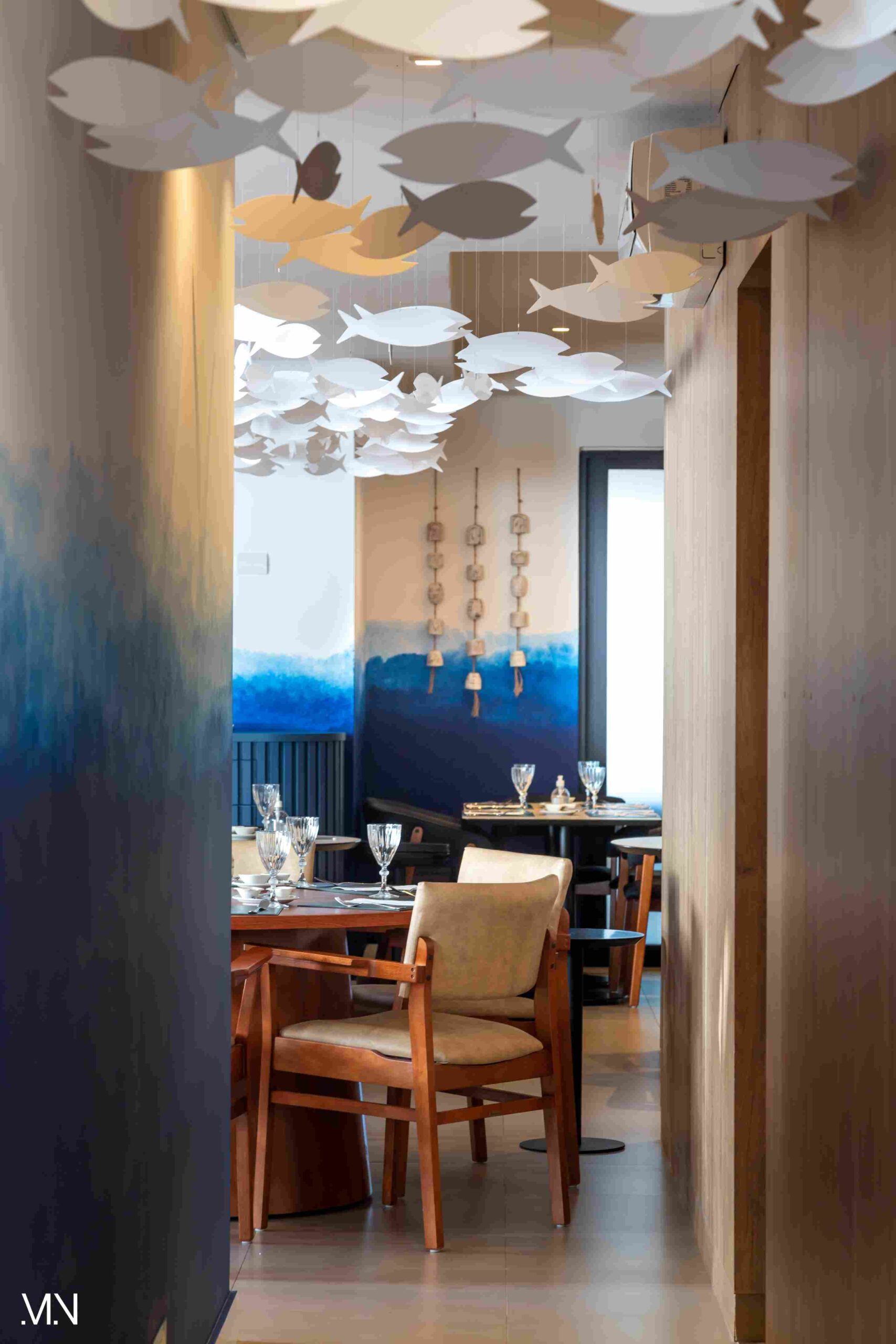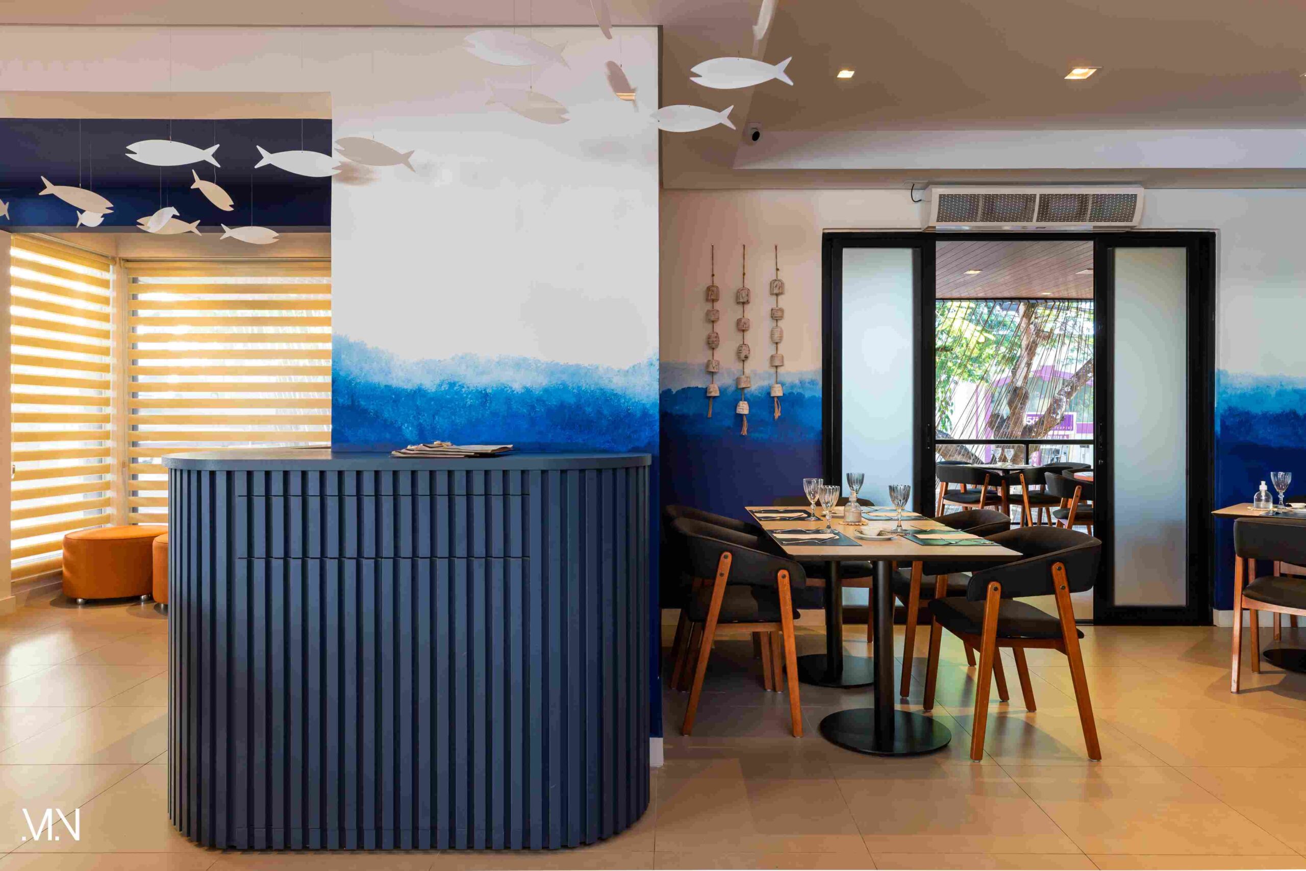 Este restaurante teve como principalmente conceito o fundo do mar, imerso em tons serenos de azul e acentuado por peixes decorativos suspensos no teto. Tons de madeira permeiam o espaço, criando uma atmosfera aconchegante e autêntica. Uma experiência gastronômica única se entrelaça com o design acolhedor e contemporâneo, transportando os clientes para um cenário marítimo encantador.