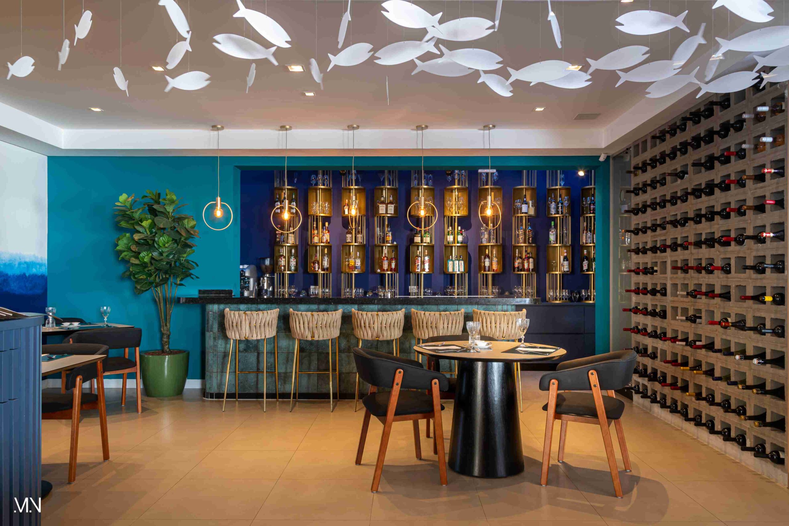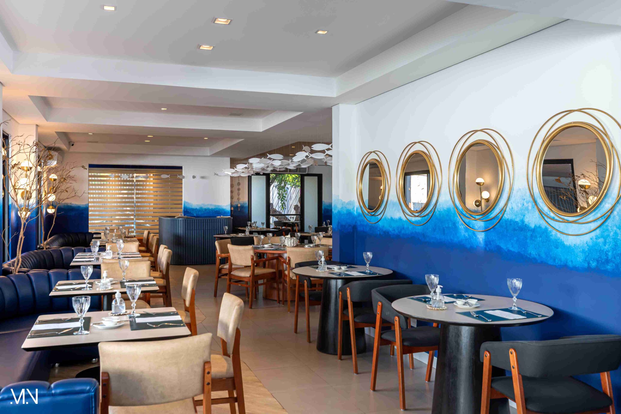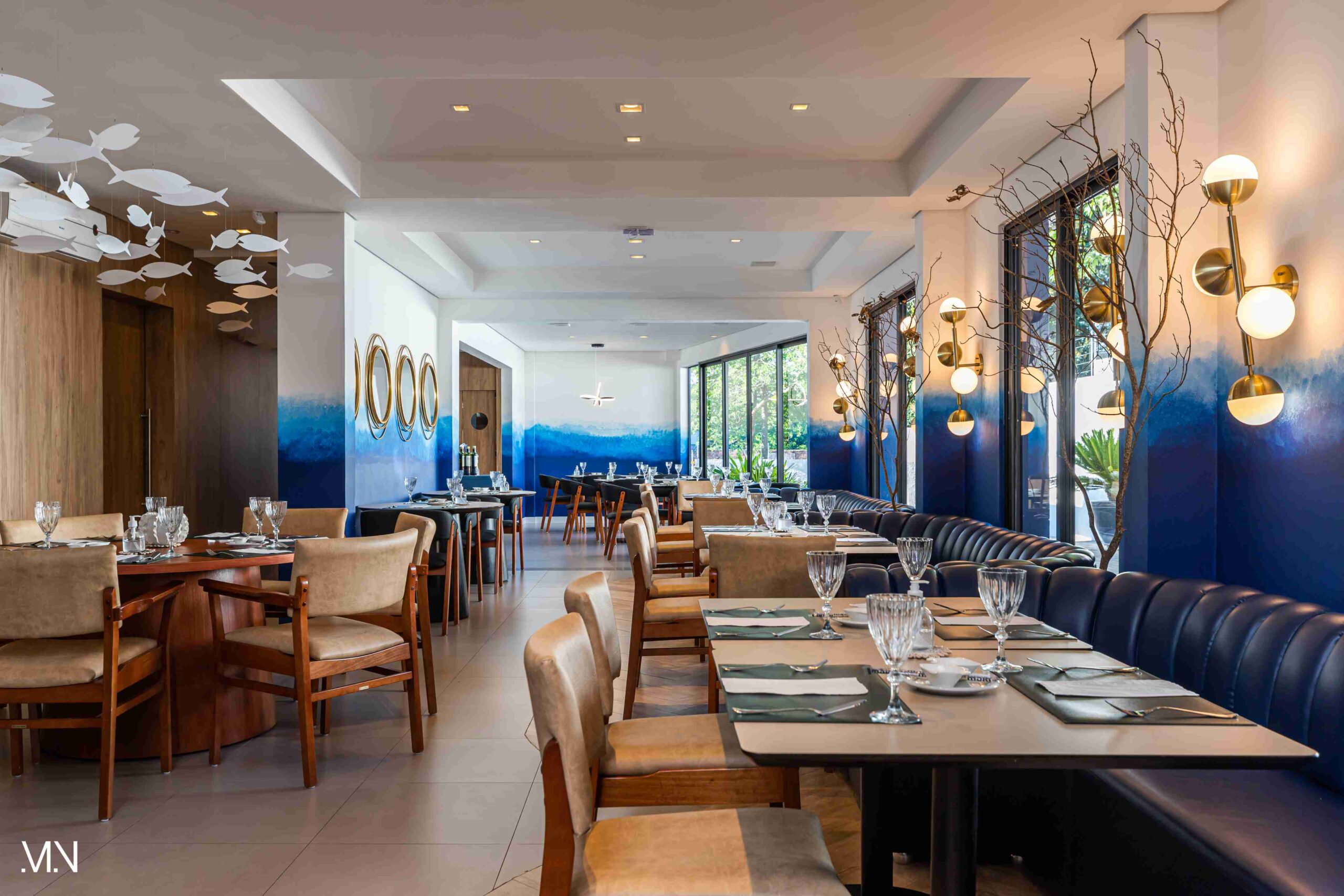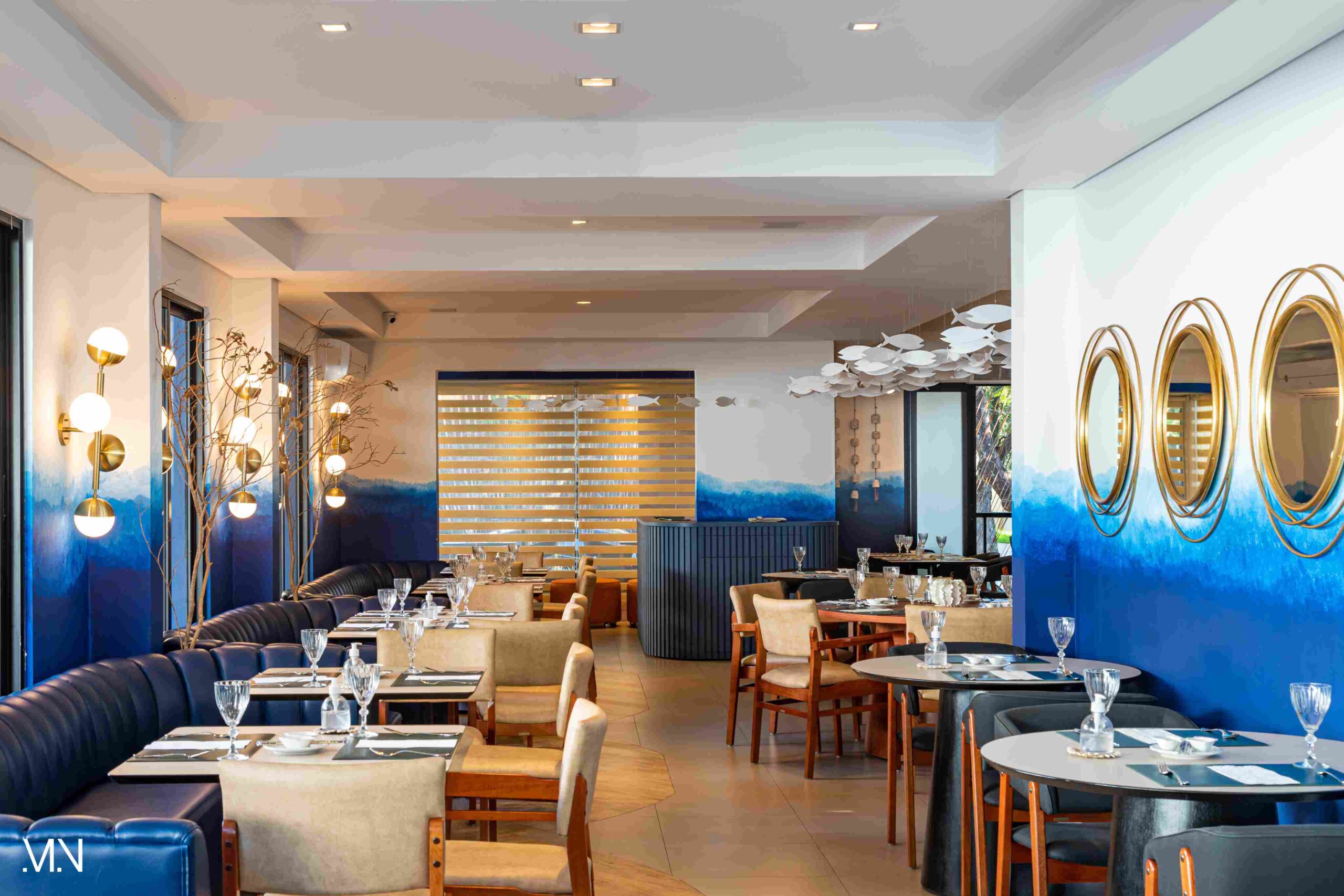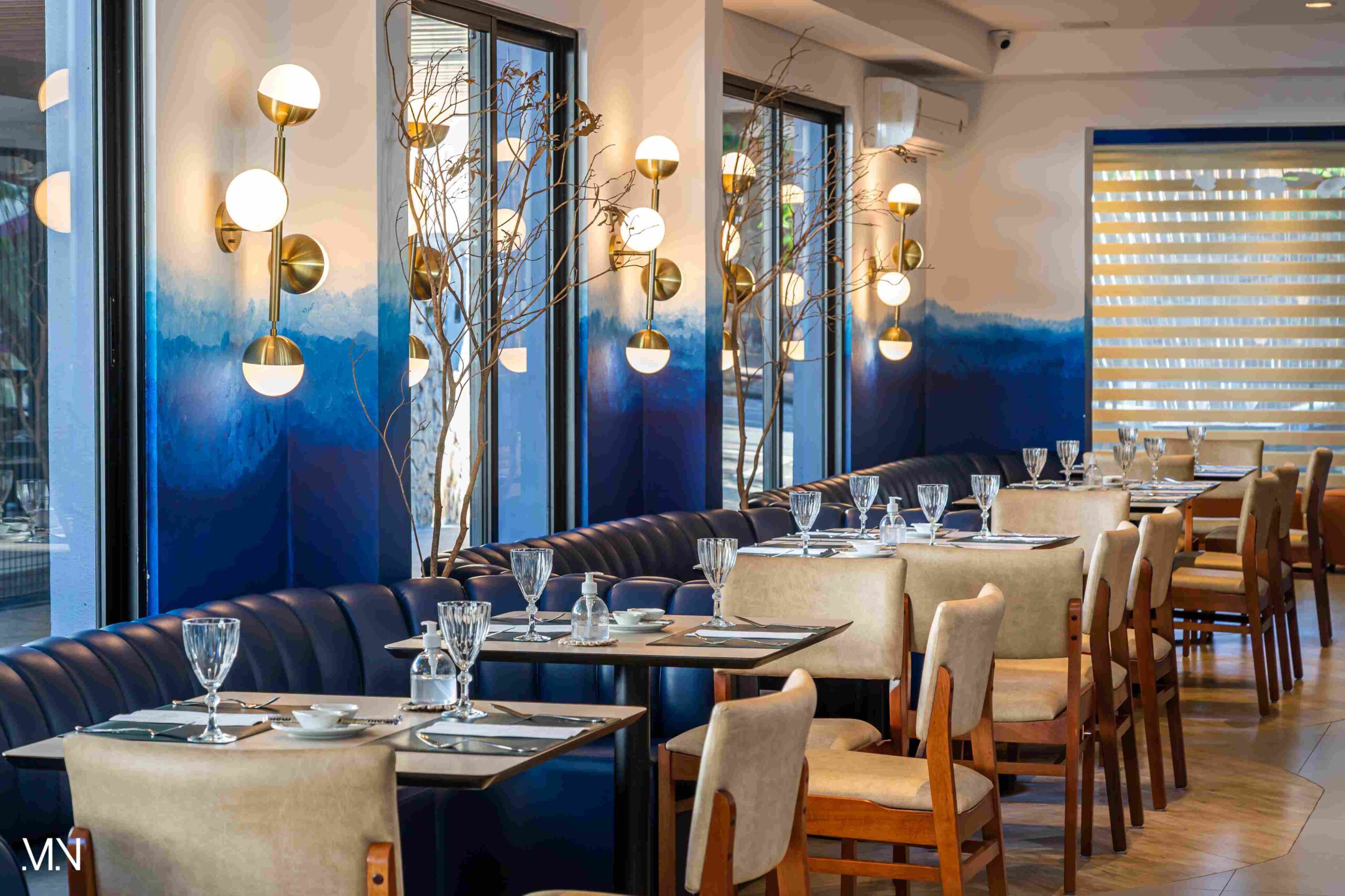 Este restaurante teve como principalmente conceito o fundo do mar, imerso em tons serenos de azul e acentuado por peixes decorativos suspensos no teto. Tons de madeira permeiam o espaço, criando uma atmosfera aconchegante e autêntica. Uma experiência gastronômica única se entrelaça com o design acolhedor e contemporâneo, transportando os clientes para um cenário marítimo encantador.