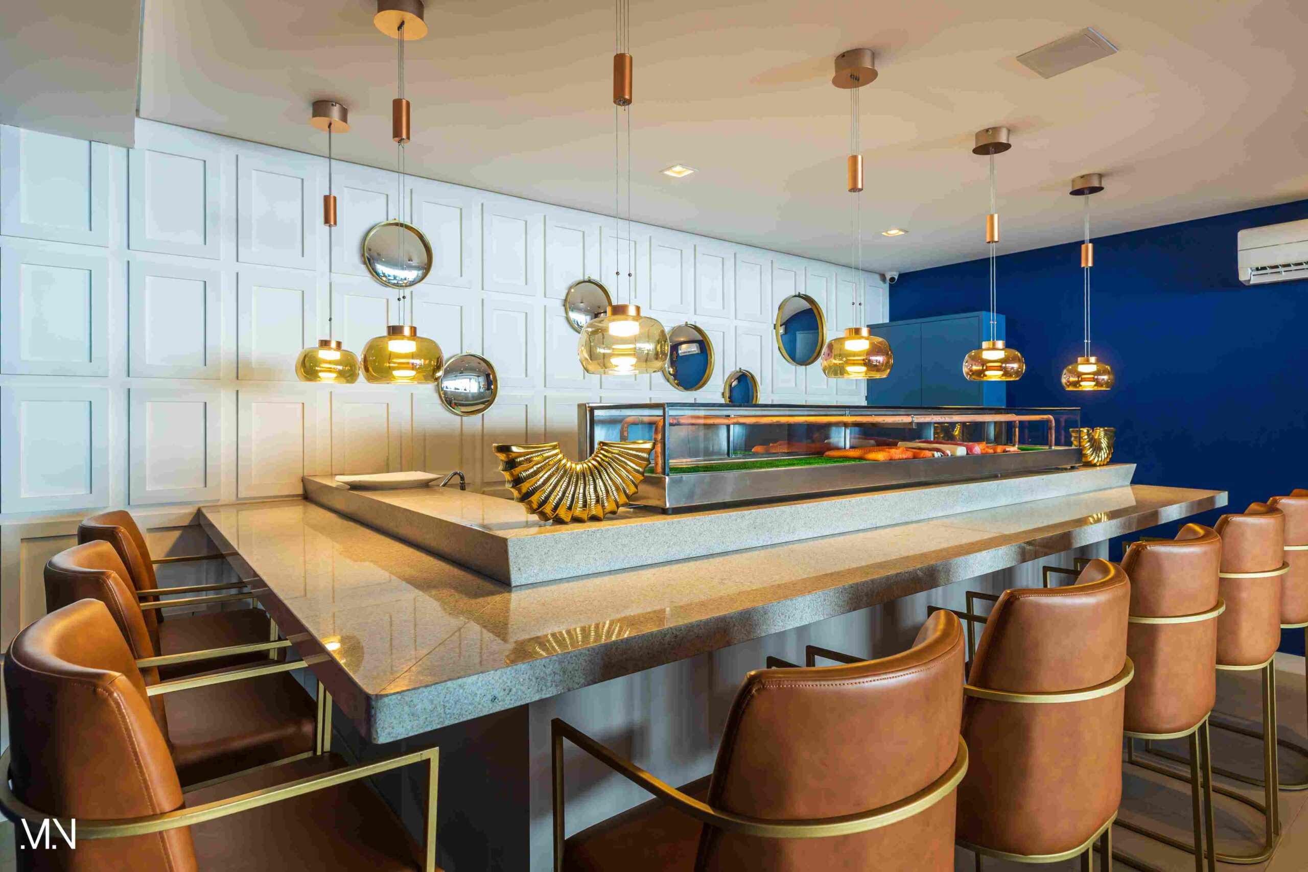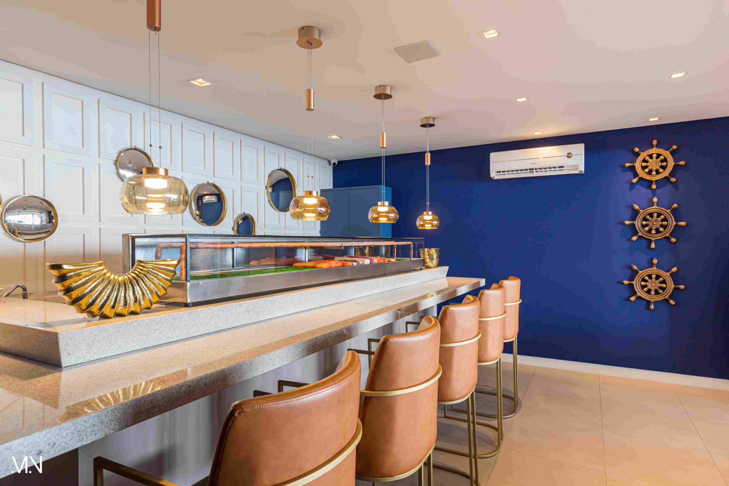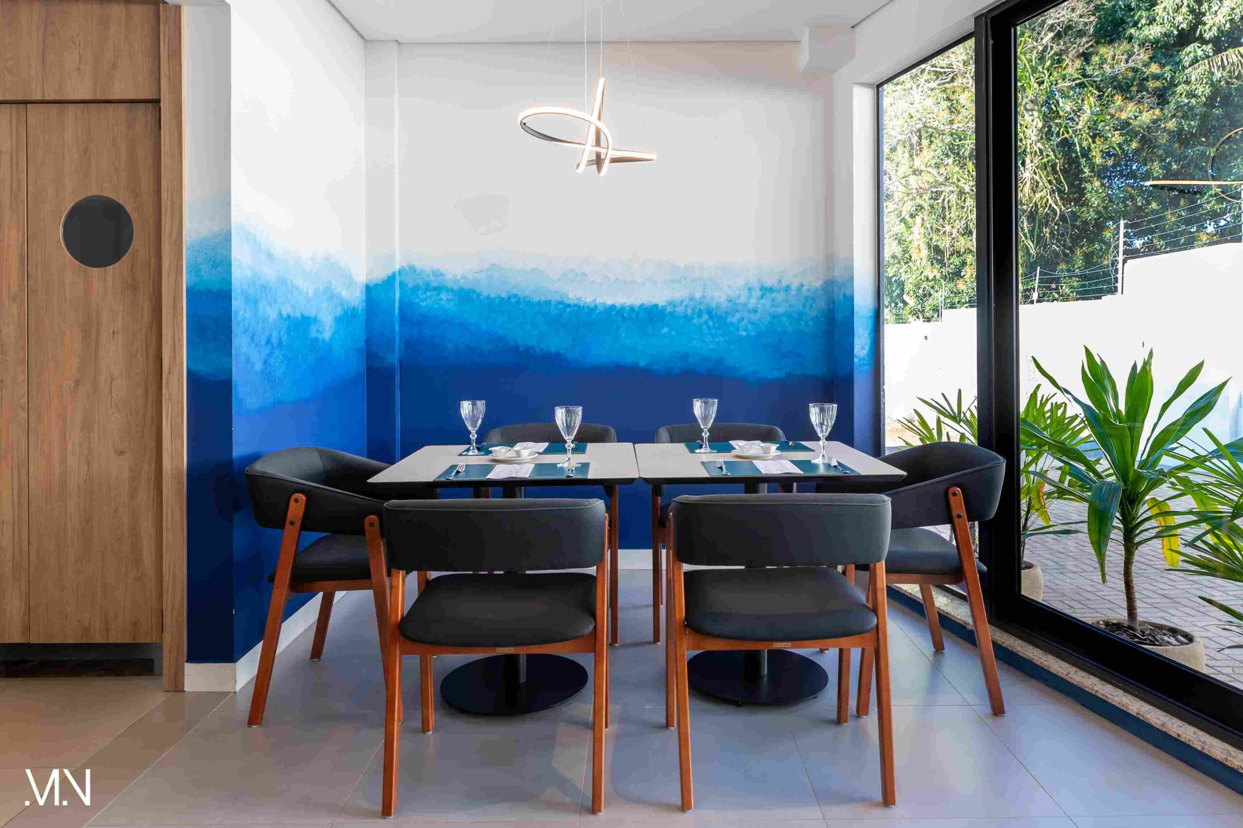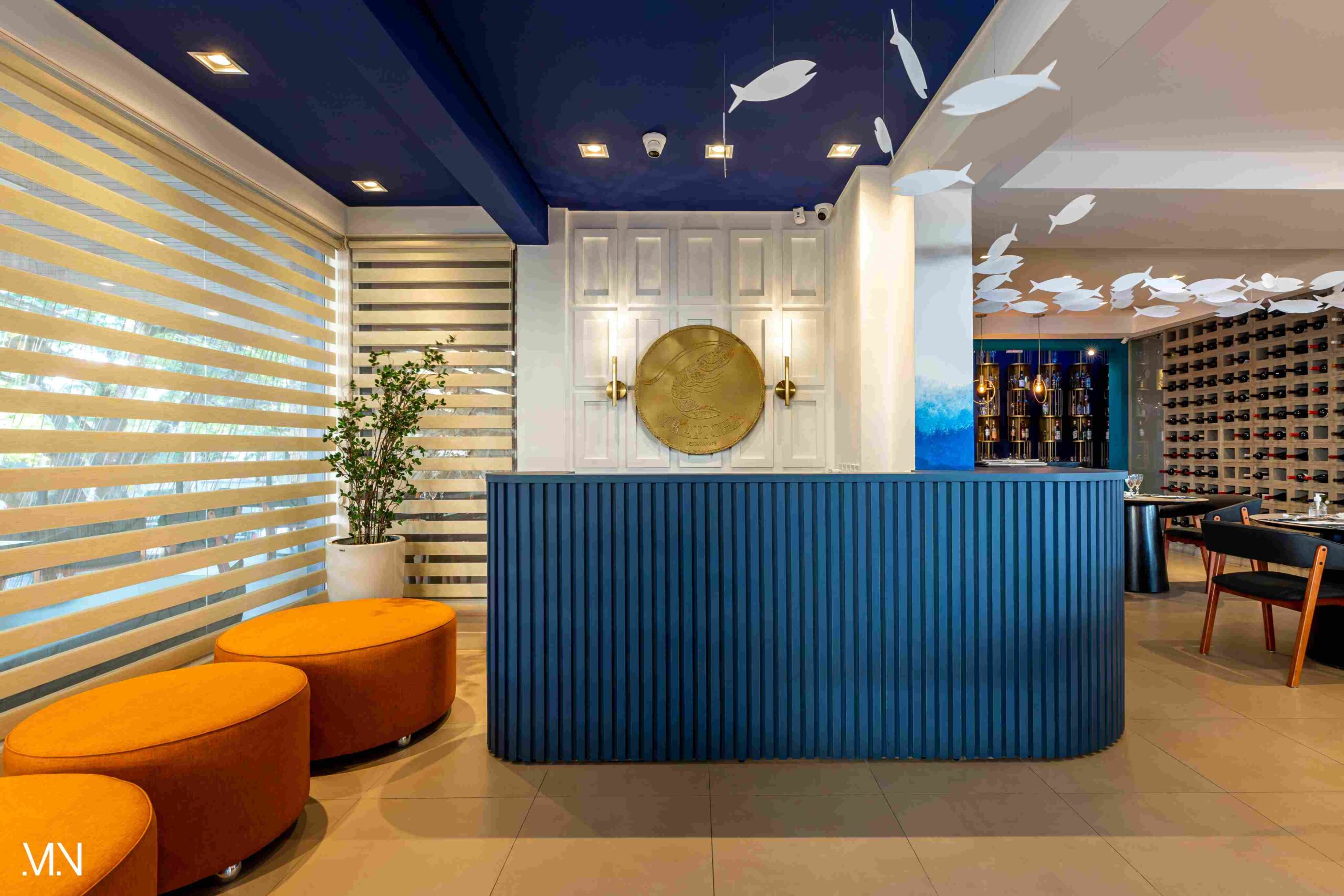 Este restaurante teve como principalmente conceito o fundo do mar, imerso em tons serenos de azul e acentuado por peixes decorativos suspensos no teto. Tons de madeira permeiam o espaço, criando uma atmosfera aconchegante e autêntica. Uma experiência gastronômica única se entrelaça com o design acolhedor e contemporâneo, transportando os clientes para um cenário marítimo encantador.