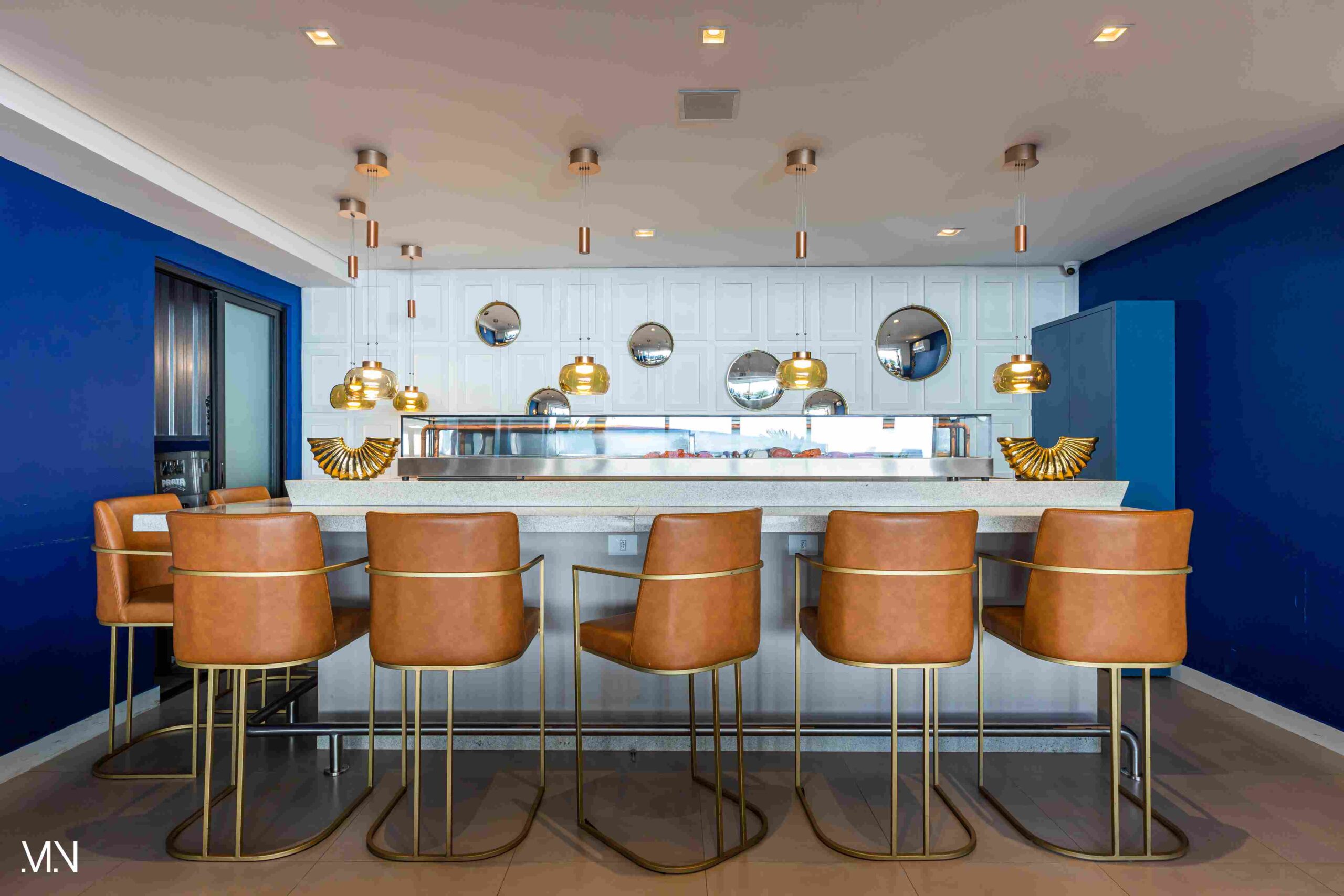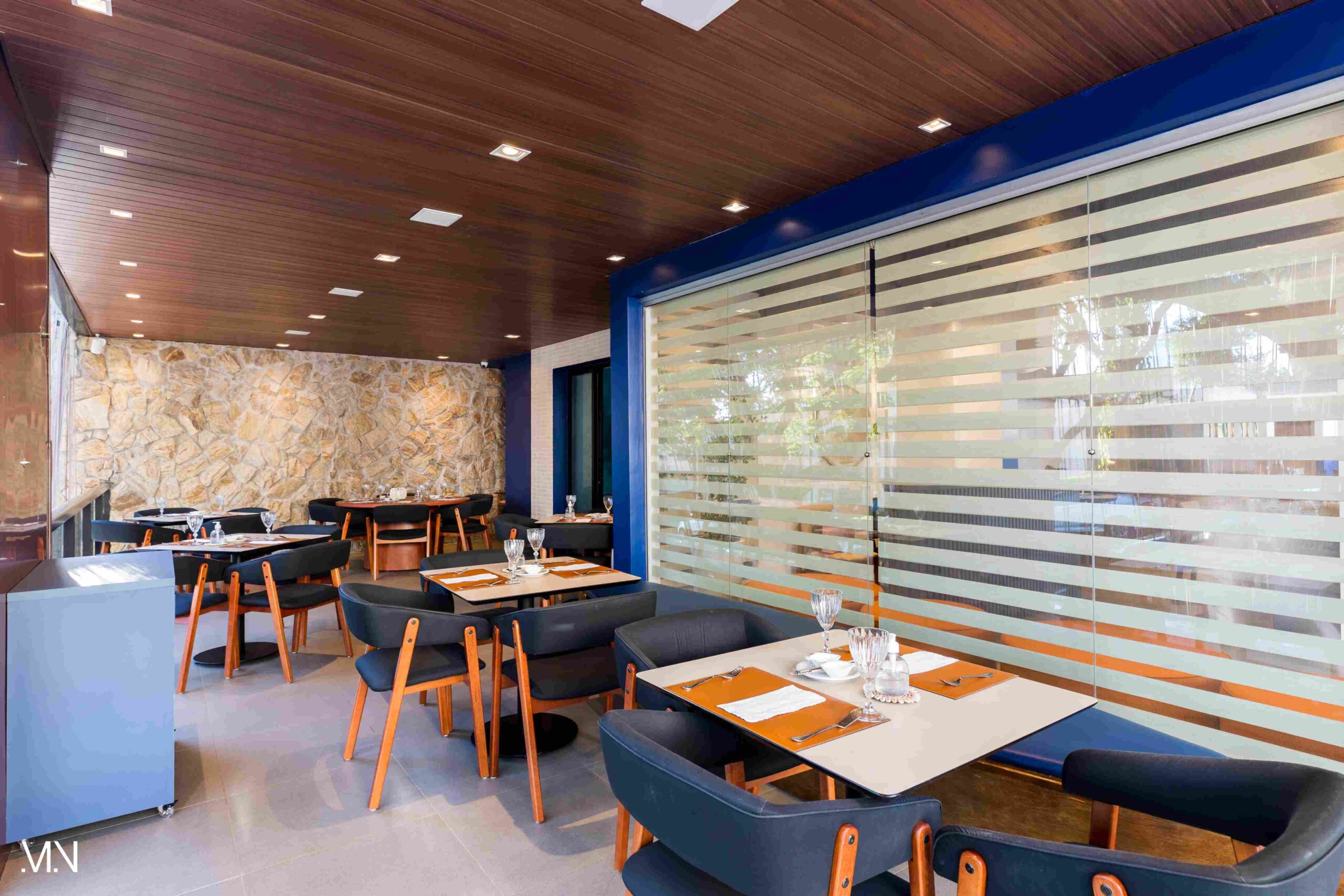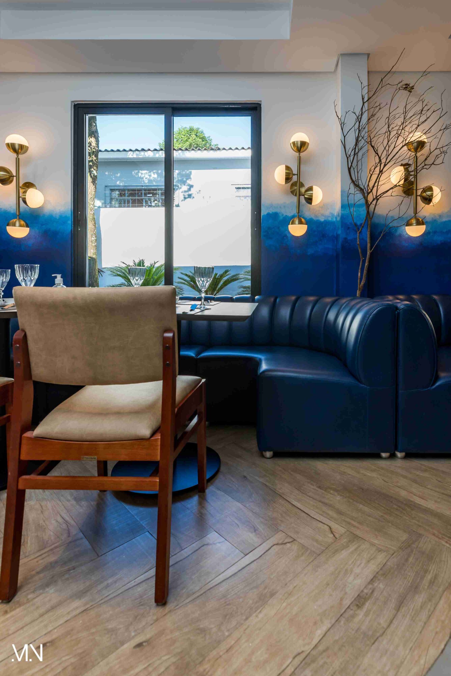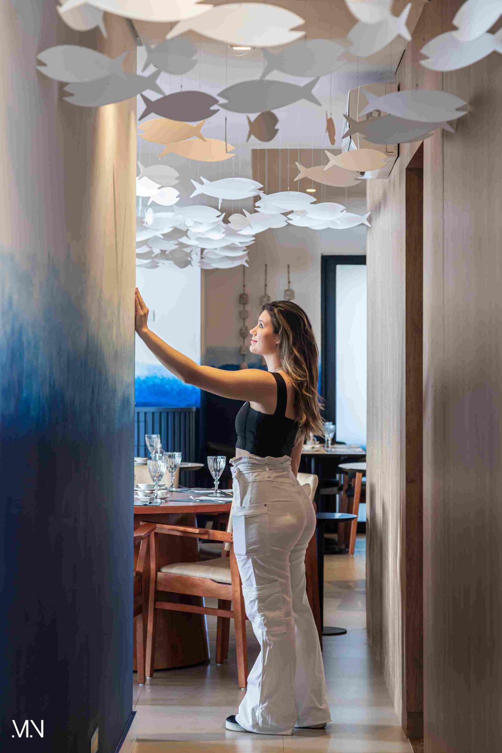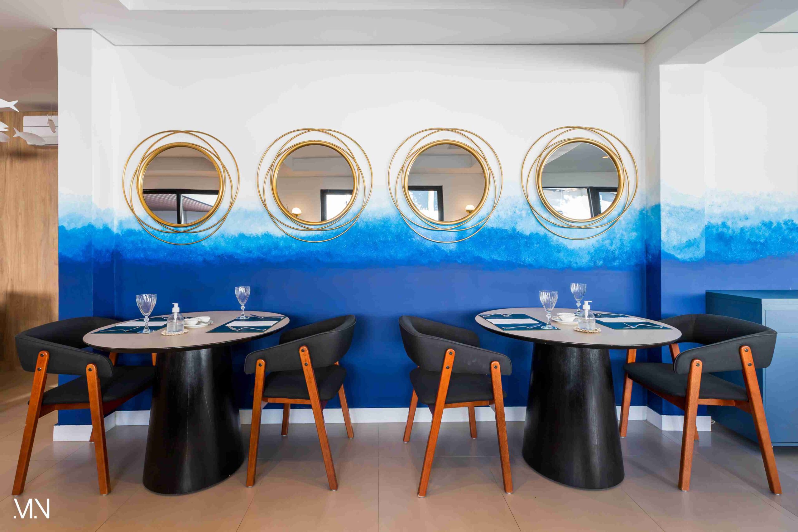 Este restaurante teve como principalmente conceito o fundo do mar, imerso em tons serenos de azul e acentuado por peixes decorativos suspensos no teto. Tons de madeira permeiam o espaço, criando uma atmosfera aconchegante e autêntica. Uma experiência gastronômica única se entrelaça com o design acolhedor e contemporâneo, transportando os clientes para um cenário marítimo encantador.