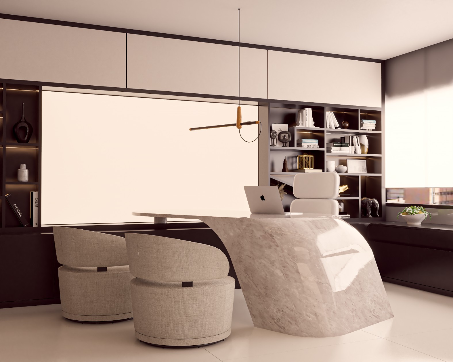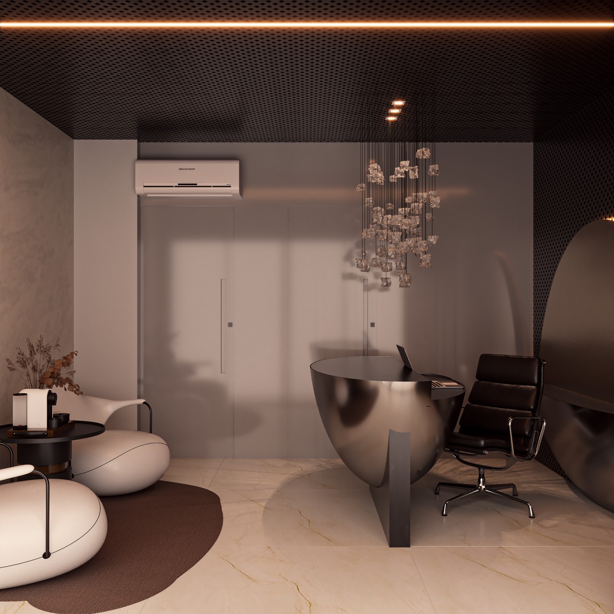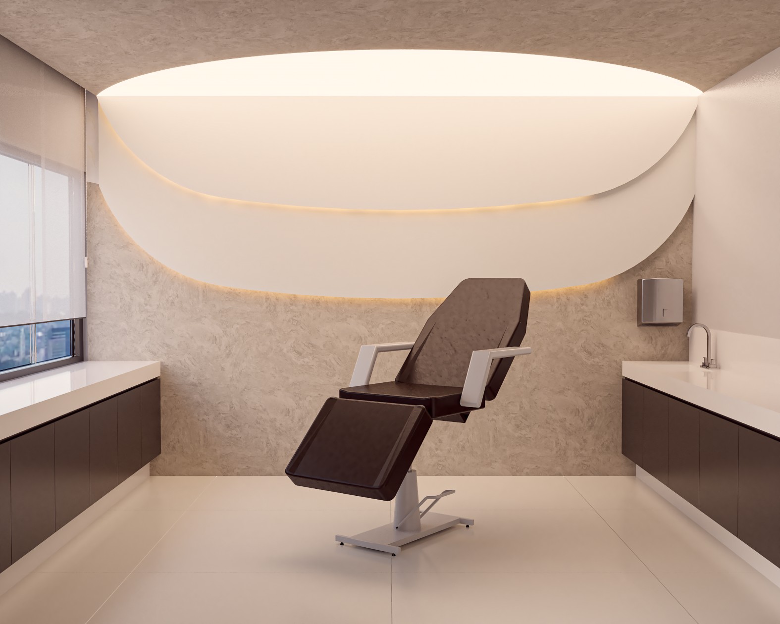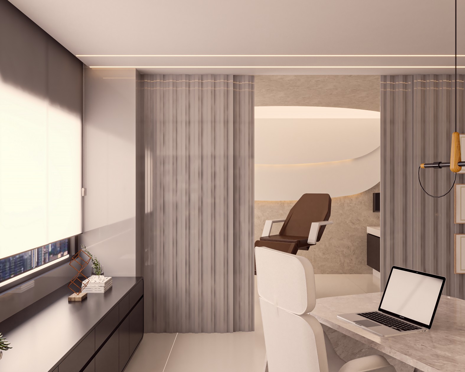 Neste consultório médico sofisticado, foram escolhidos tons de fendi e bege para criar uma atmosfera serena, enquanto o muxarabi no teto e o mobiliário de design assinado adicionam elementos artísticos e exclusivos ao ambiente. Uma fusão cuidadosa de estética refinada e funcionalidade define este espaço médico, elevando a experiência do paciente a um patamar de elegância.