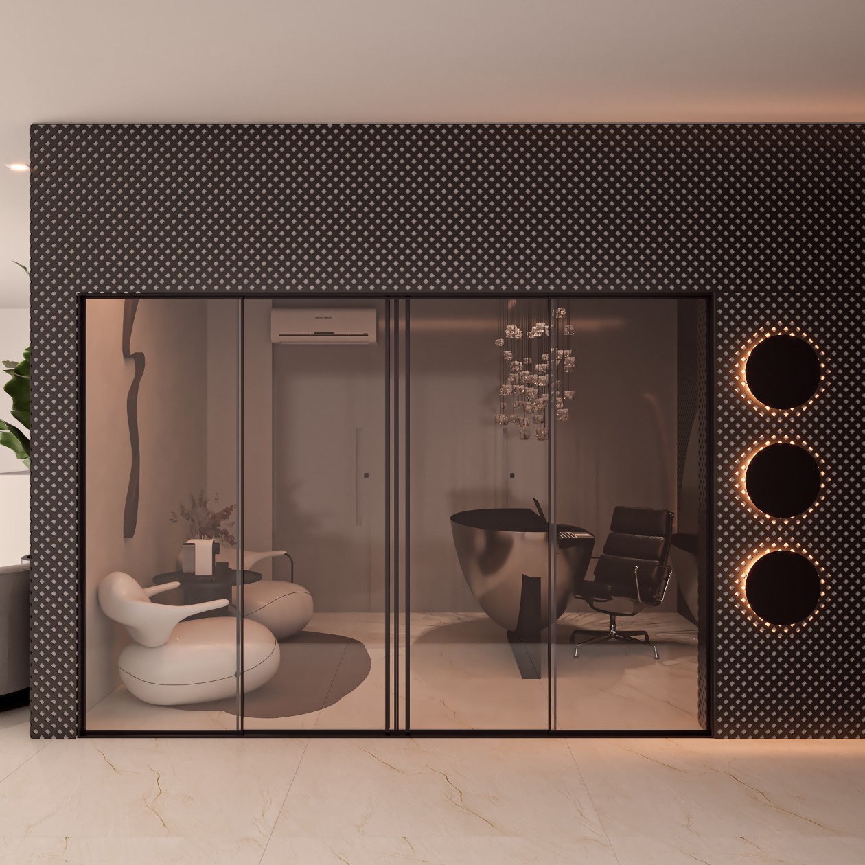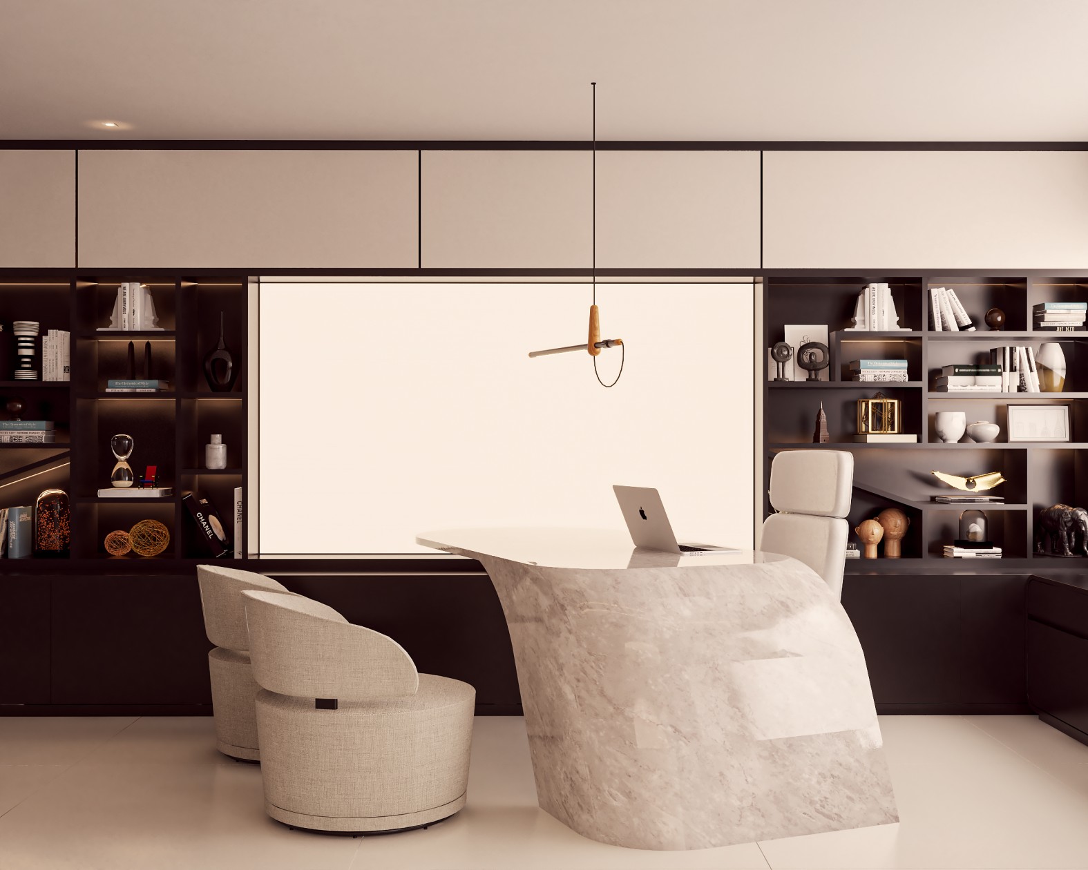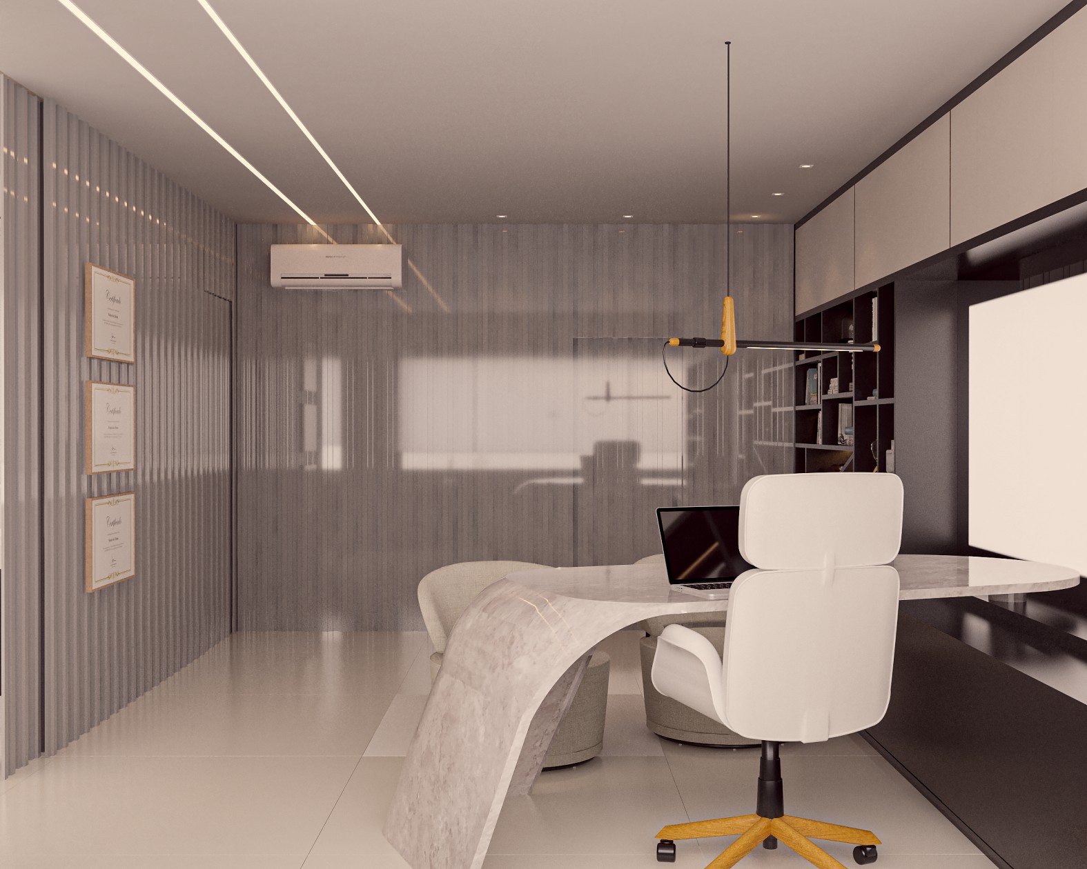 Neste consultório médico sofisticado, foram escolhidos tons de fendi e bege para criar uma atmosfera serena, enquanto o muxarabi no teto e o mobiliário de design assinado adicionam elementos artísticos e exclusivos ao ambiente. Uma fusão cuidadosa de estética refinada e funcionalidade define este espaço médico, elevando a experiência do paciente a um patamar de elegância.