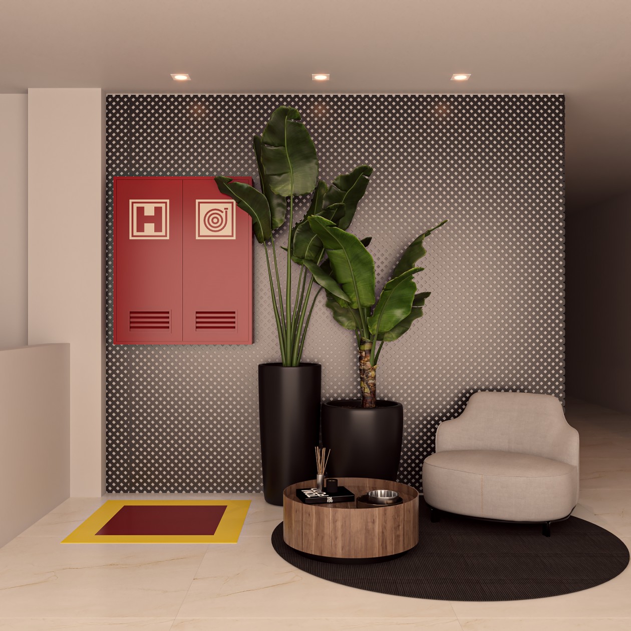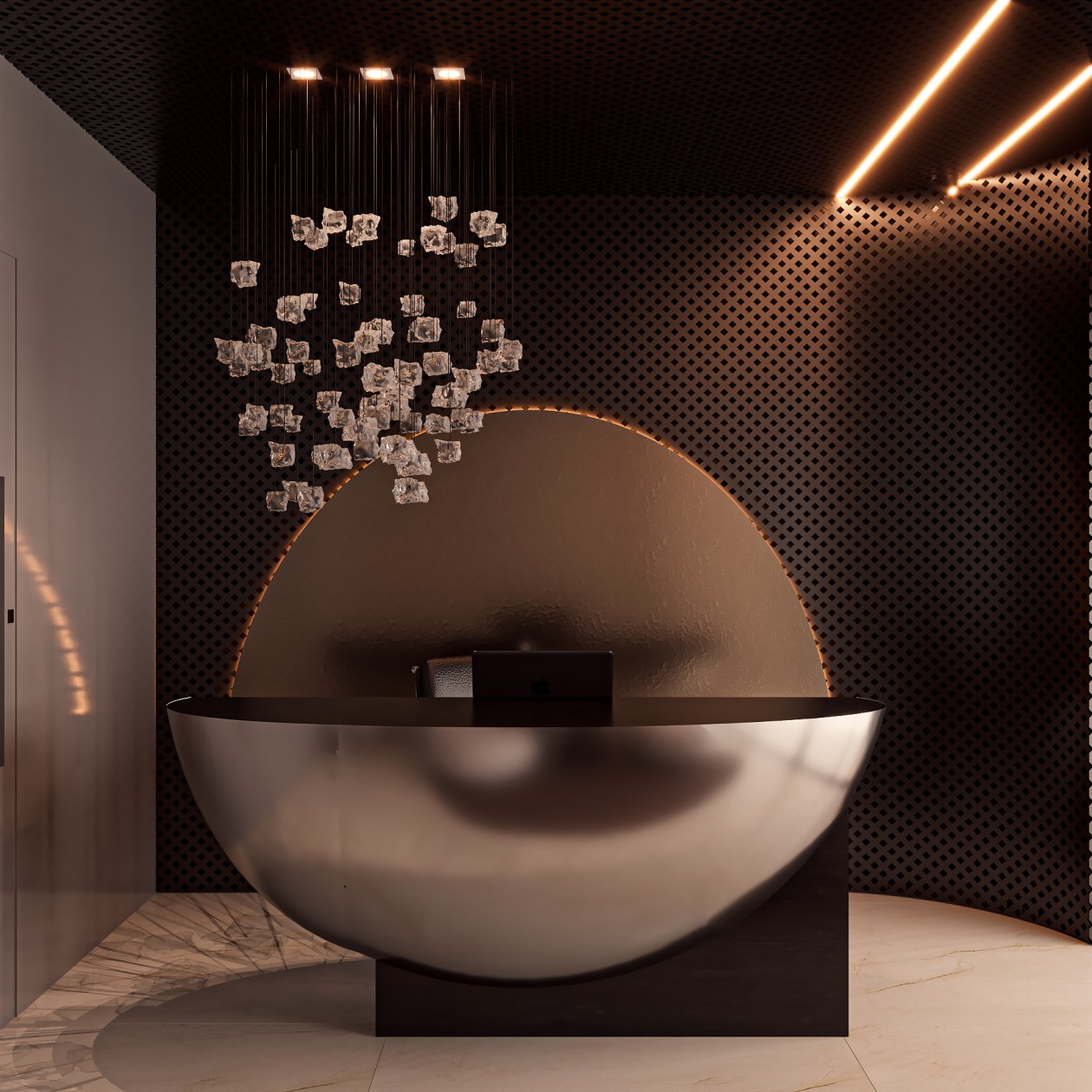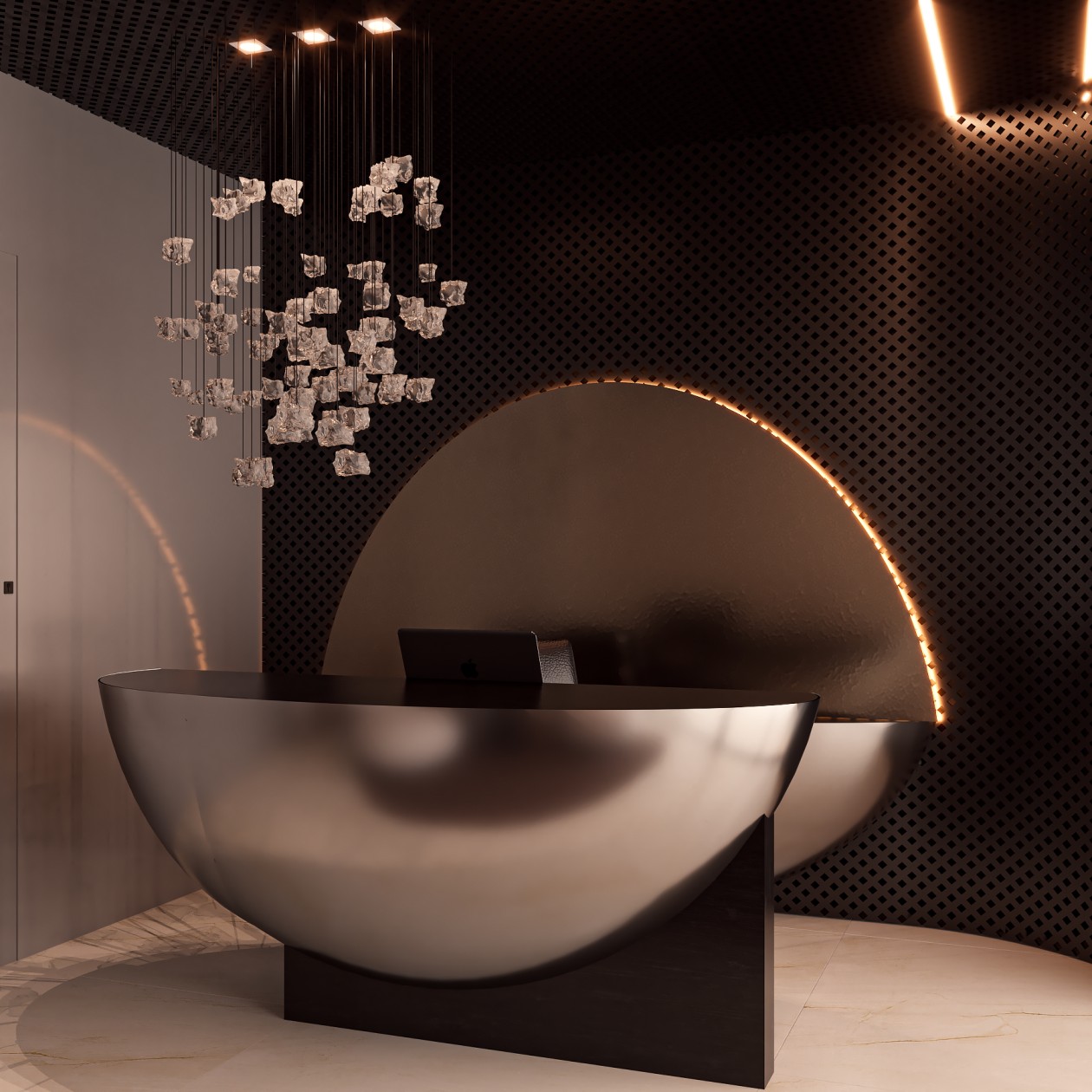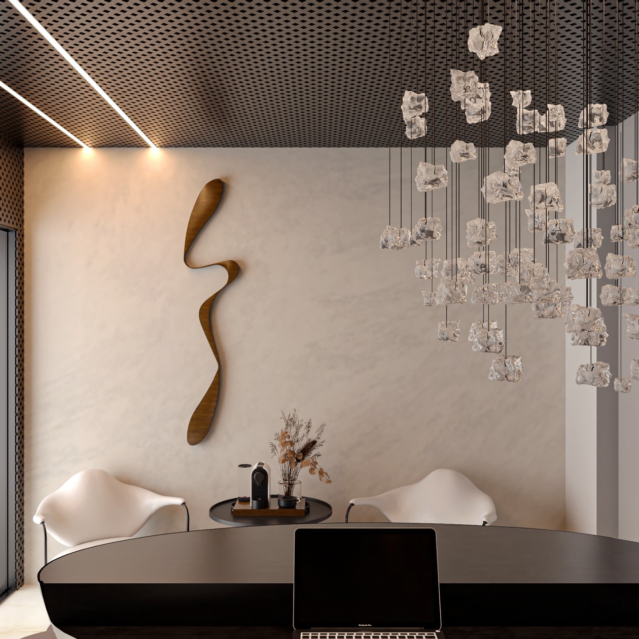Neste consultório médico sofisticado, foram escolhidos tons de fendi e bege para criar uma atmosfera serena, enquanto o muxarabi no teto e o mobiliário de design assinado adicionam elementos artísticos e exclusivos ao ambiente. Uma fusão cuidadosa de estética refinada e funcionalidade define este espaço médico, elevando a experiência do paciente a um patamar de elegância.