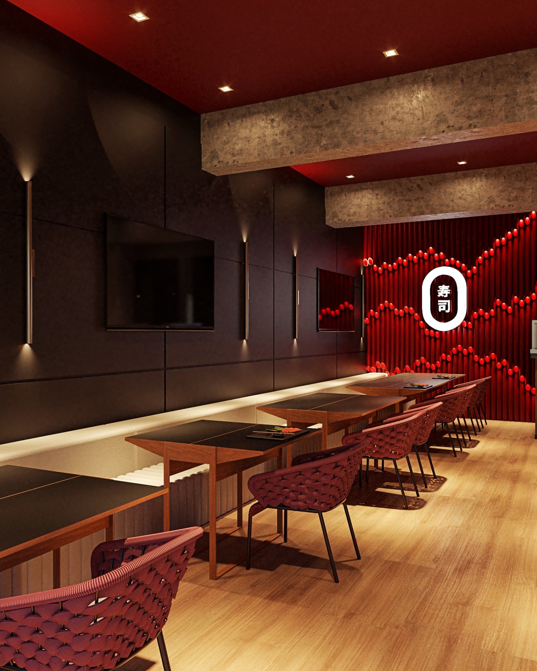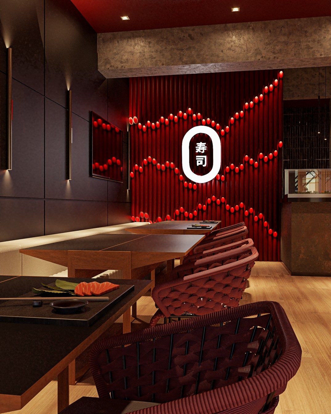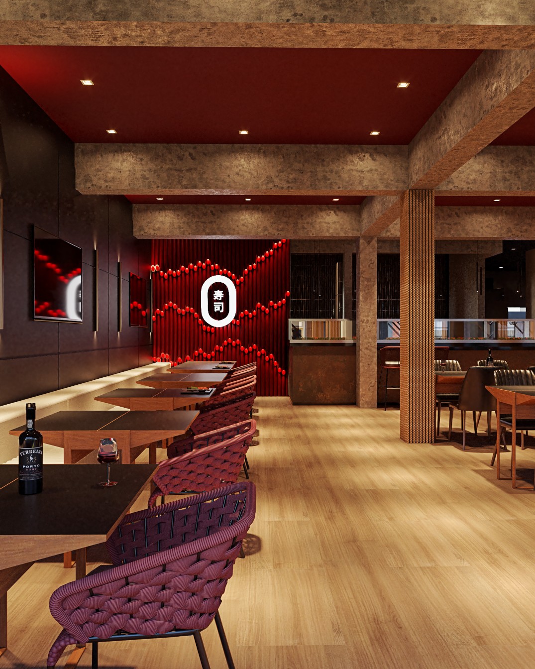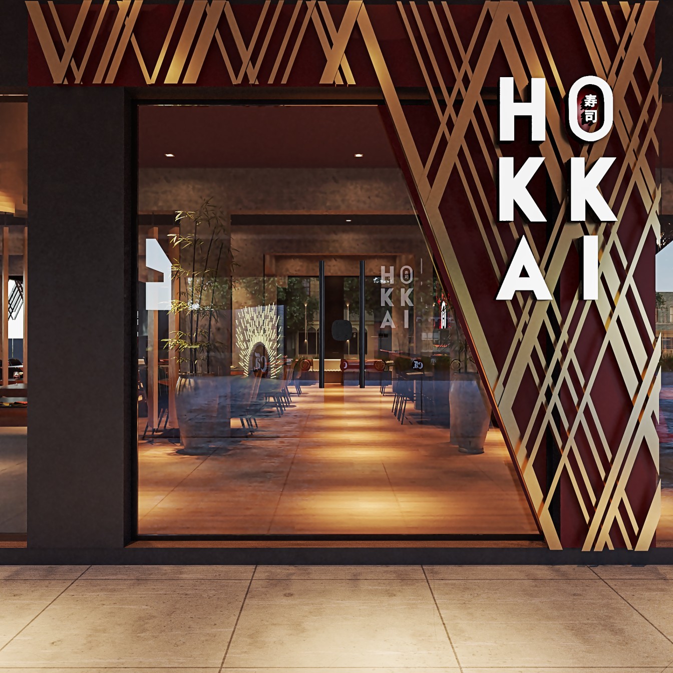 Este estabelecimento que equilibra a tradição japonesa com uma estética contemporânea, convida a uma experiência gastronômica sofisticada no Hokkai Sushi, em meio a uma atmosfera calorosa e convidativa. A fachada imponente, adornada com elementos dourados que remetem a marca, convida os clientes a uma experiência culinária excepcional. No interior, a iluminação suave destaca a paleta de cores rica, enquanto detalhes em dourado, como luminárias e ornamentos, proporcionam um brilho sutil.