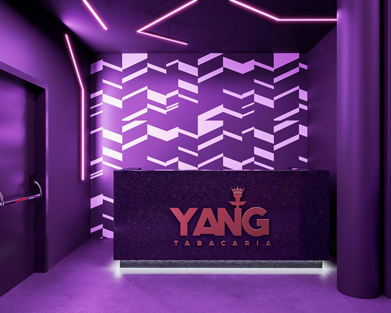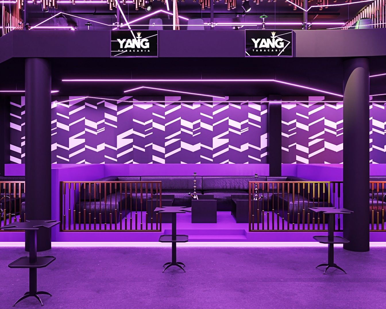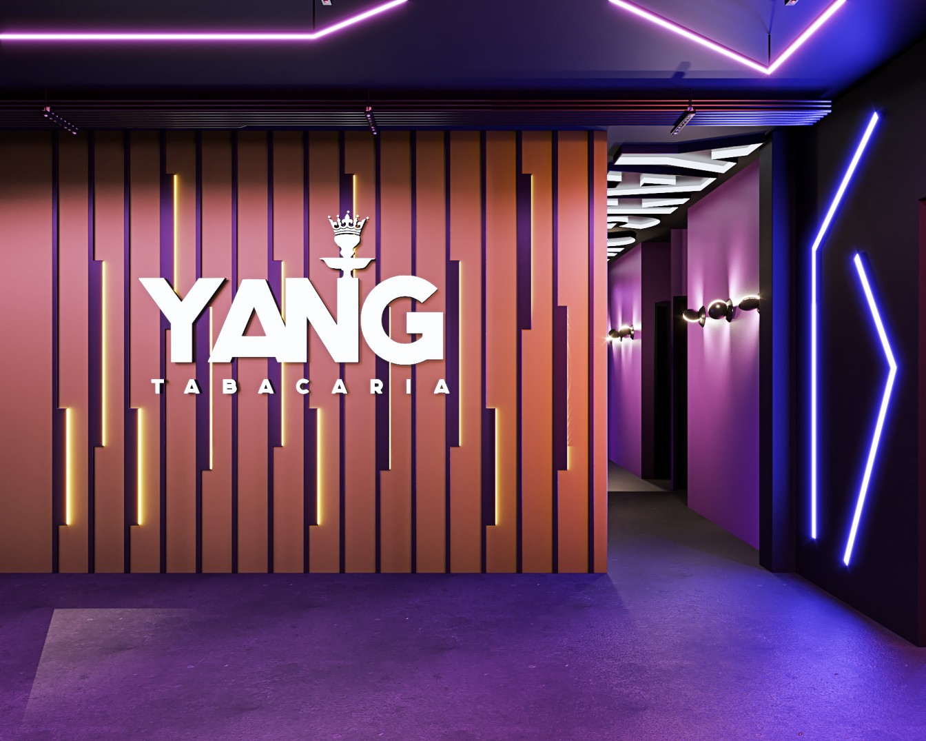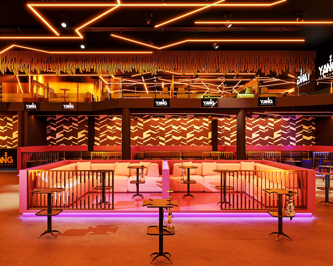 Esta sedutora balada lounge de narguilé cativa desde a fachada até o interior, onde a mistura ousada de preto e dourado cria uma estética luxuosa e contemporânea. A fachada, adornada com detalhes dourados reluzentes, convida os visitantes a uma experiência noturna única. Ao adentrar, o espaço se desdobra em dois pavimentos, cada um imerso em uma atmosfera de elegância. O preto domina, desde o mobiliário até as paredes, enquanto detalhes em dourado, como luminárias e elementos decorativos, adicionam um toque de opulência.
