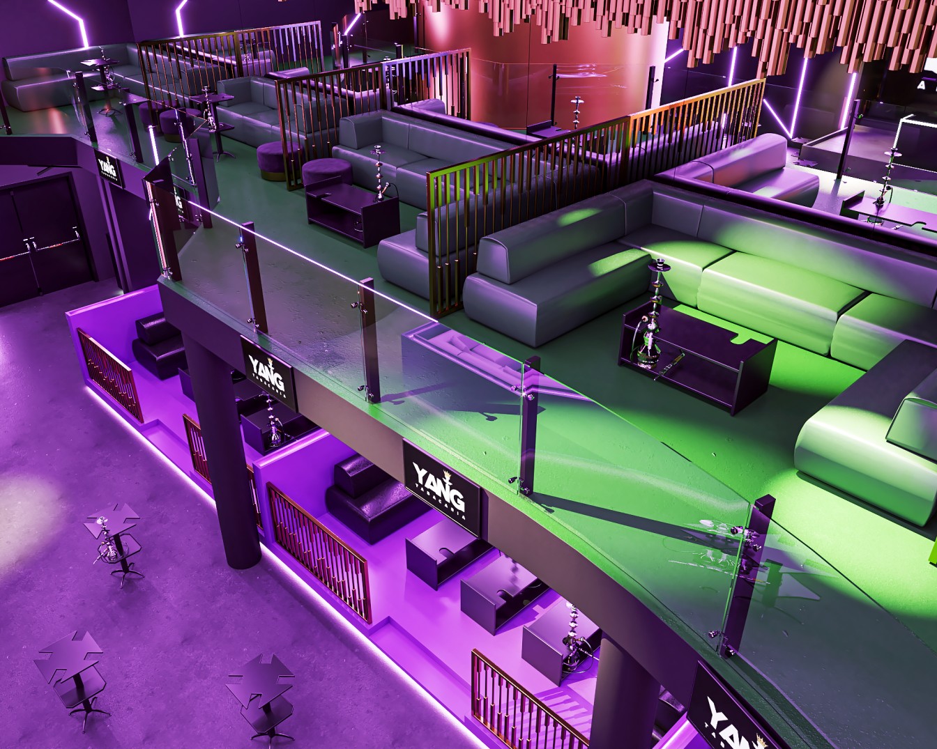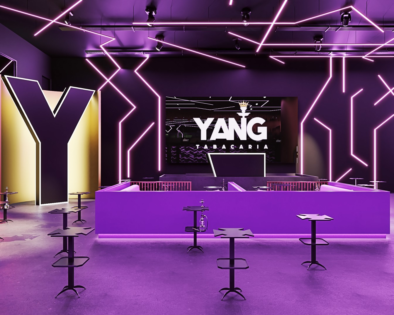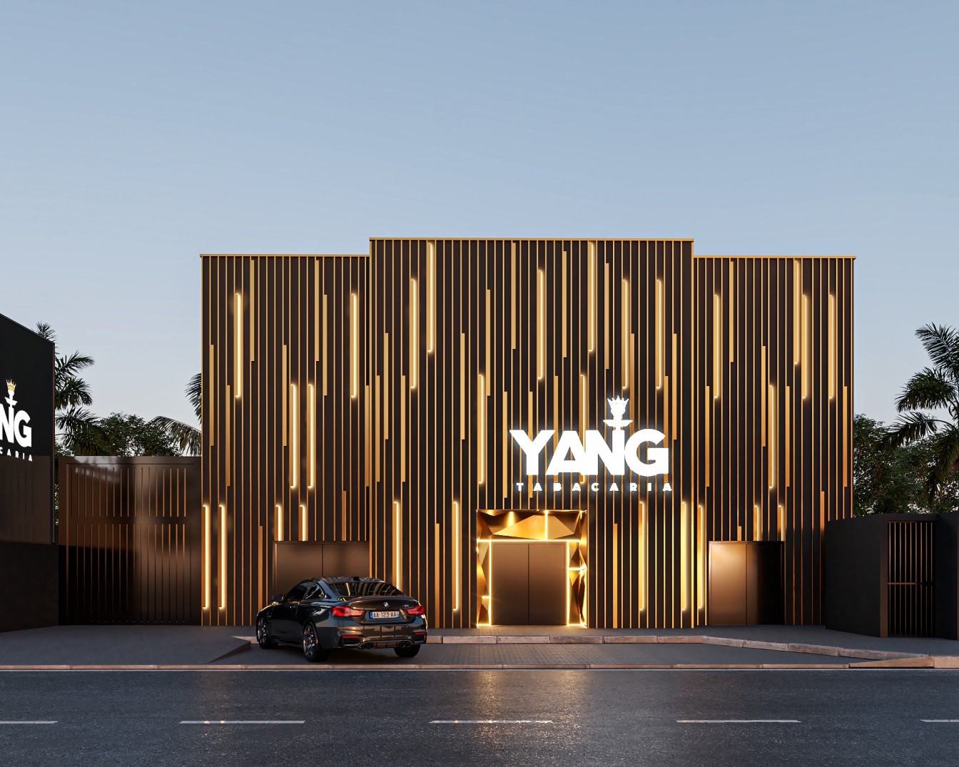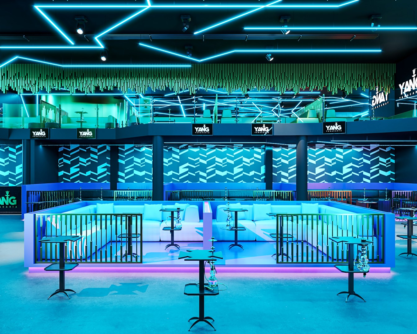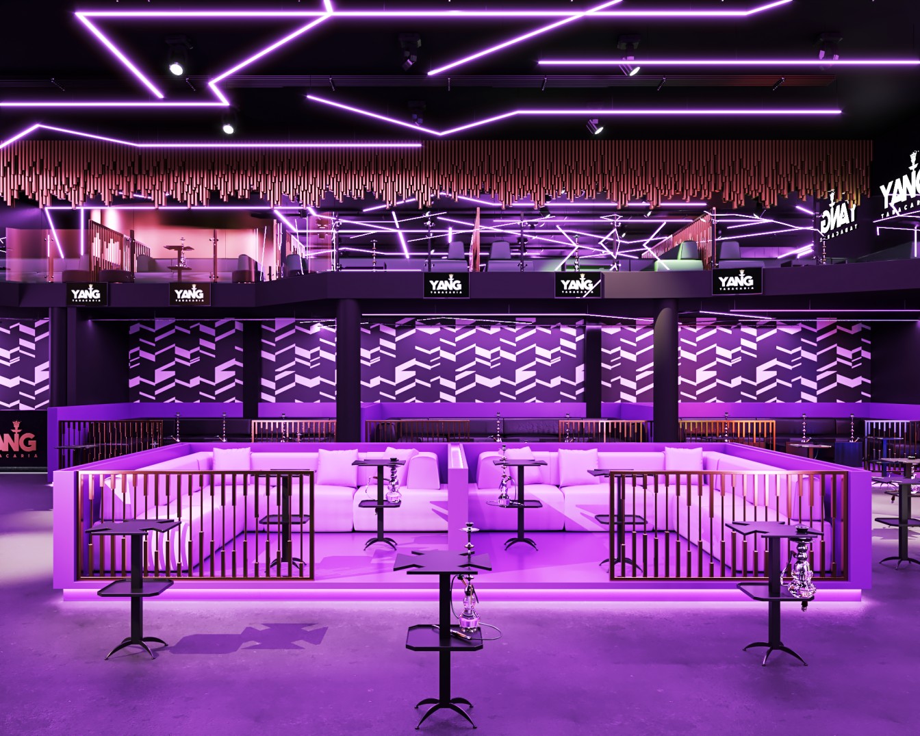 Esta sedutora balada lounge de narguilé cativa desde a fachada até o interior, onde a mistura ousada de preto e dourado cria uma estética luxuosa e contemporânea. A fachada, adornada com detalhes dourados reluzentes, convida os visitantes a uma experiência noturna única. Ao adentrar, o espaço se desdobra em dois pavimentos, cada um imerso em uma atmosfera de elegância. O preto domina, desde o mobiliário até as paredes, enquanto detalhes em dourado, como luminárias e elementos decorativos, adicionam um toque de opulência.